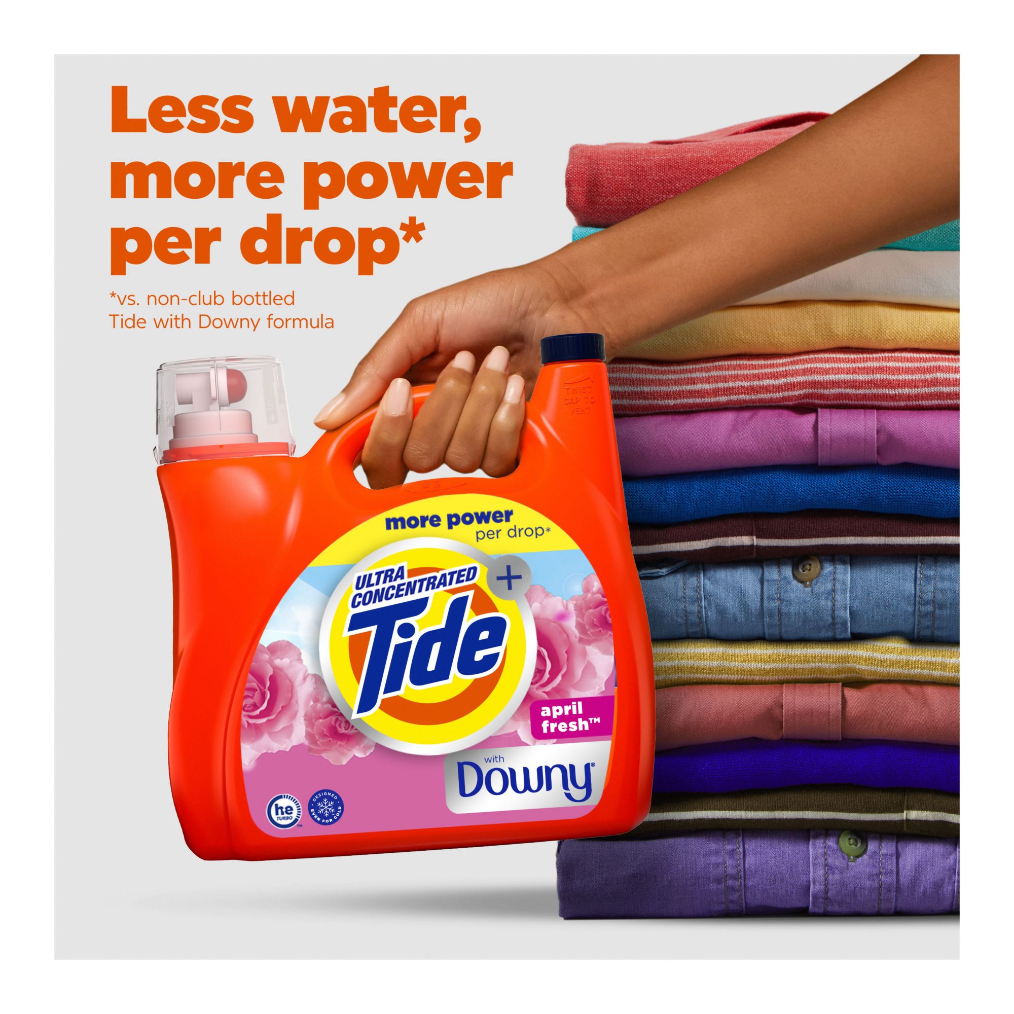 From America's #1 detergent*, Tide with a Touch of Downy liquid laundry detergent combines Tide's powerful cleaning with the freshness of Downy's iconic April Fresh scent. Tide with a Touch of Downy is formulated to work on 100% of common stains, even in cold water. It keeps your whites white and colors colorful while providing the Downy scent you love, wash after wash. Tide's HE Turbo Clean detergents feature Smart Suds technology. The quick-collapsing suds clean faster and rinse out quicker, even in cold cycles. The Tide clean and Downy scent you love is also available in Tide with a Touch of Downy Power PODS laundry pacs.