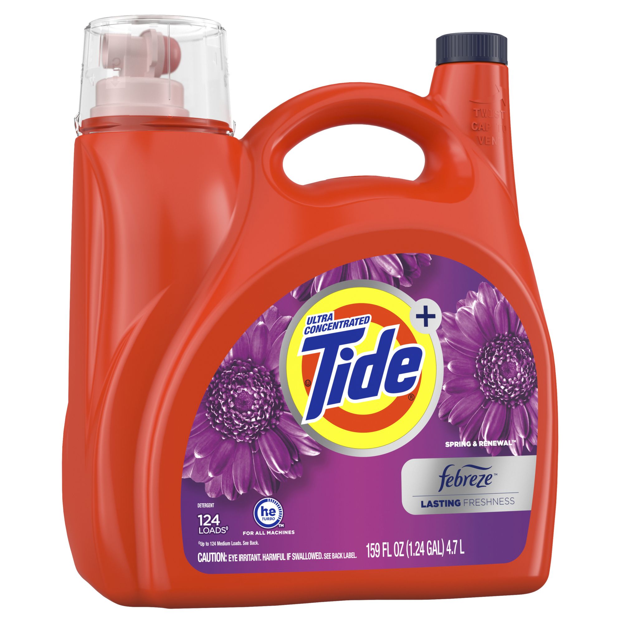 Keep out of reach of children Includes Tide Plus Febreze Freshness Spring & Renewal HE Turbo Clean Liquid Laundry Detergent, 159 fl. oz., 124 loads