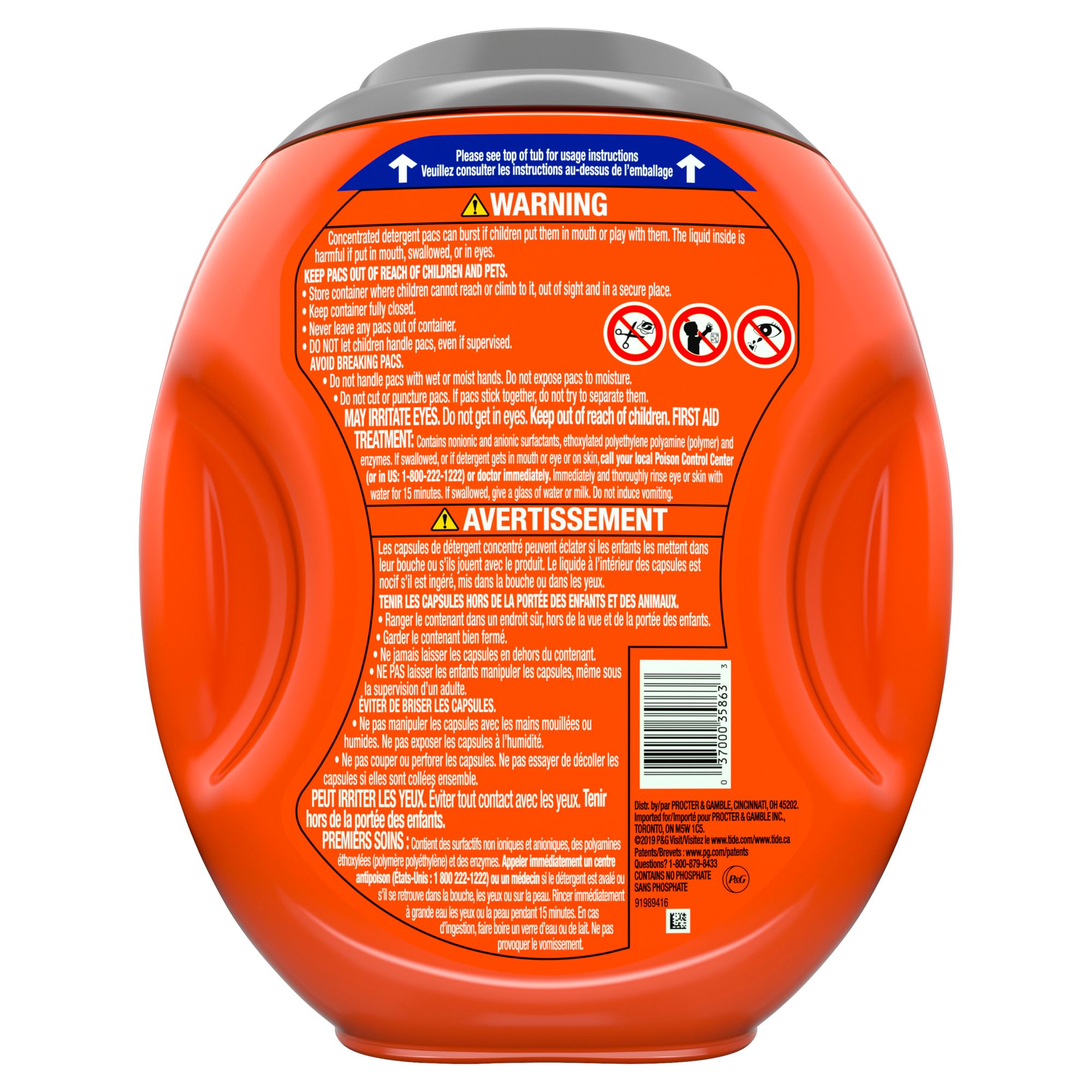 Concentrated detergent pacs can burst if children put them in mouth or play with them. The liquid inside is harmful if put in mouth, swallowed, or in eyes. KEEP PACS OUT OF REACH OF CHILDREN AND PETS. Store container where children cannot reach or climb to it, out of sight and in a secure place. Keep container fully closed. Never leave any pacs out of container. DO NOT let children handle pacs, even if supervised. AVOID BREAKING PACS. Do not handle pacs with wet or moist hands. Do not expose pacs to moisture. Do not cut or puncture pacs. If pacs stick together, do not try to separate them. MAY IRRITATE EYES. Do not get in eyes. Keep out of reach of children. FIRST AID TREATMENT: Contains nonionic and anionic surfactants, ethoxylated polyethylene polyamine (polymer) and enzymes. If swallowed, or if detergent gets in mouth or eye or on skin, call your local Poison Control Center (or in US: 1-800-222 1222) or doctor immediately. Immediately and thoroughly rinse eye or skin with water for 15 minutes. If swallowed, give a glass of water or milk. Do not induce vomiting.