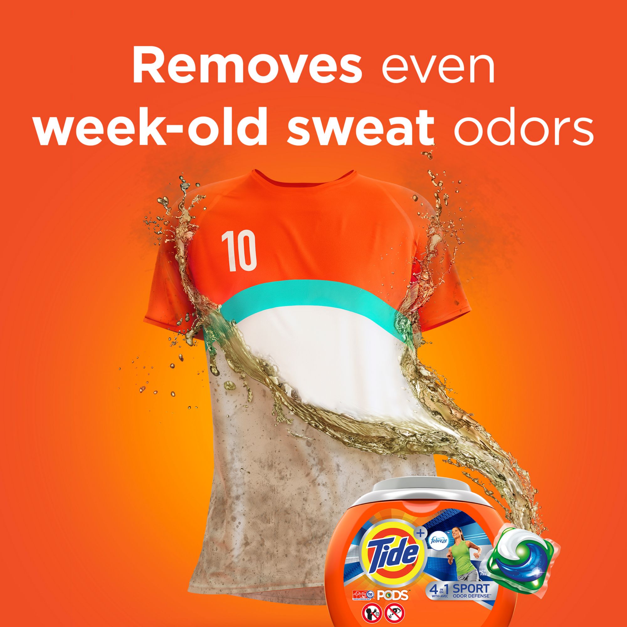 Tide Pods Plus Febreze Sport Odor Defense laundry detergent pacs are designed to fight stains and tough, set-in odors in one wash while providing freshness that lasts 3x longer. Featuring 4-in-1 technology, each pac cleans, brightens fabrics, fights stains and freshens stinky workout and athletic gear. This convenient laundry detergent is Tide’s #1 odor remover so it helps eliminate even week-old sweat odors at their source and leave your clothes smelling extra fresh. Also, thanks to the special film and HE Turbo technology with quick-collapsing suds, the capsules dissolve completely in all temperatures and do not produce excess suds. For a surprisingly powerful clean in 1 step and a wonderful scent experience that lasts, Tide Pods Plus Febreze is the all-in-one solution for you.