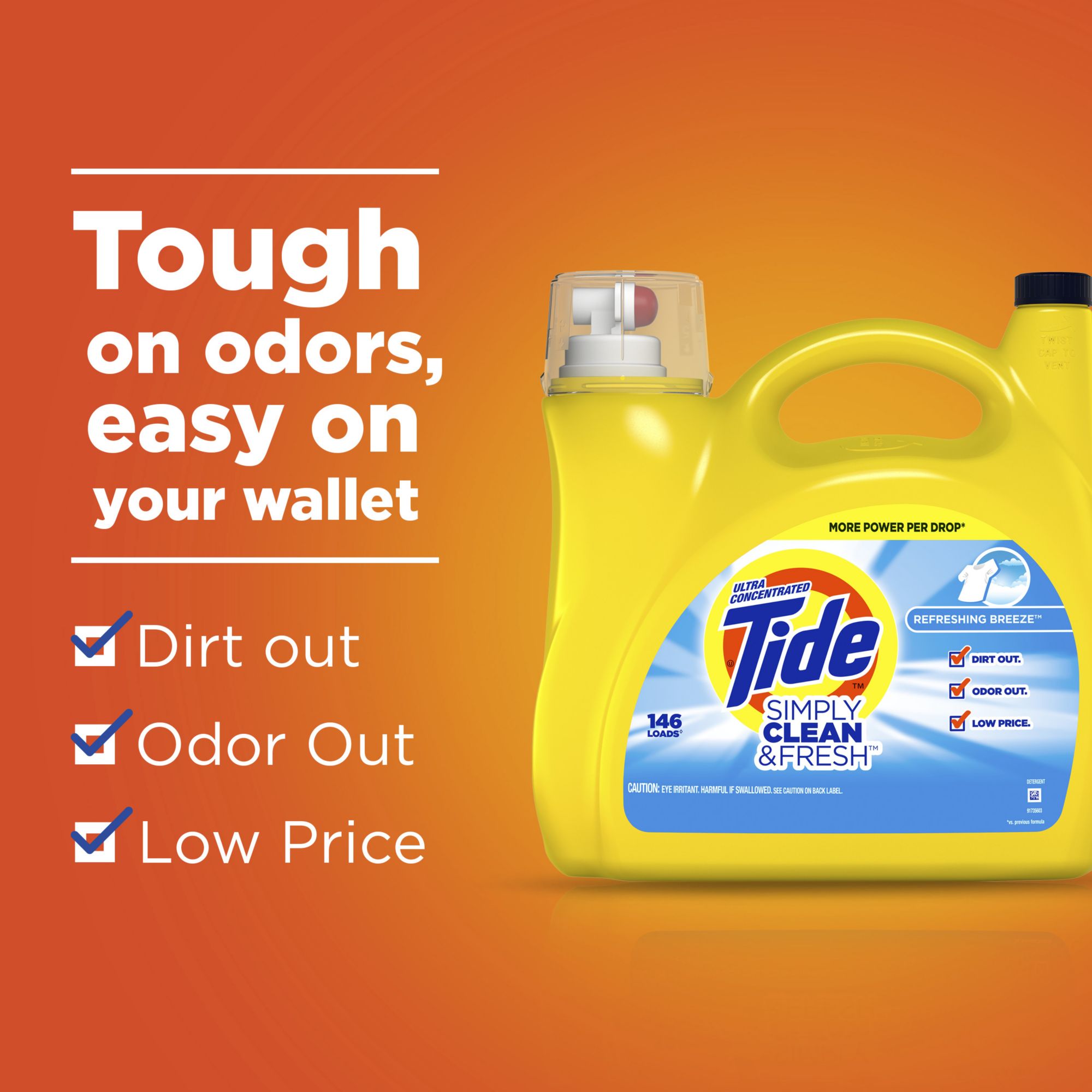 Tide Simply Clean and Fresh liquid laundry detergent has two times the baking soda power* to target tough odors deep in the fibers of your clothes. It is now more concentrated to provide more stain removal and freshness with less water*. From America’s #1 detergent,** to cover your many laundry needs.