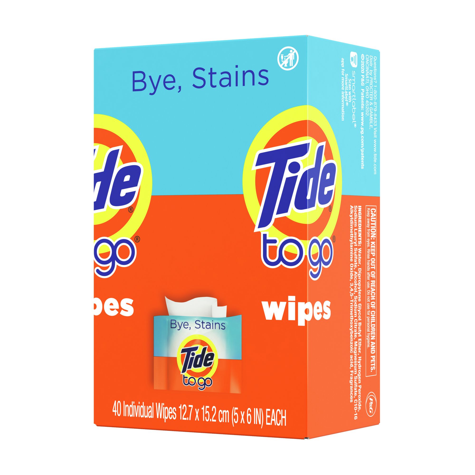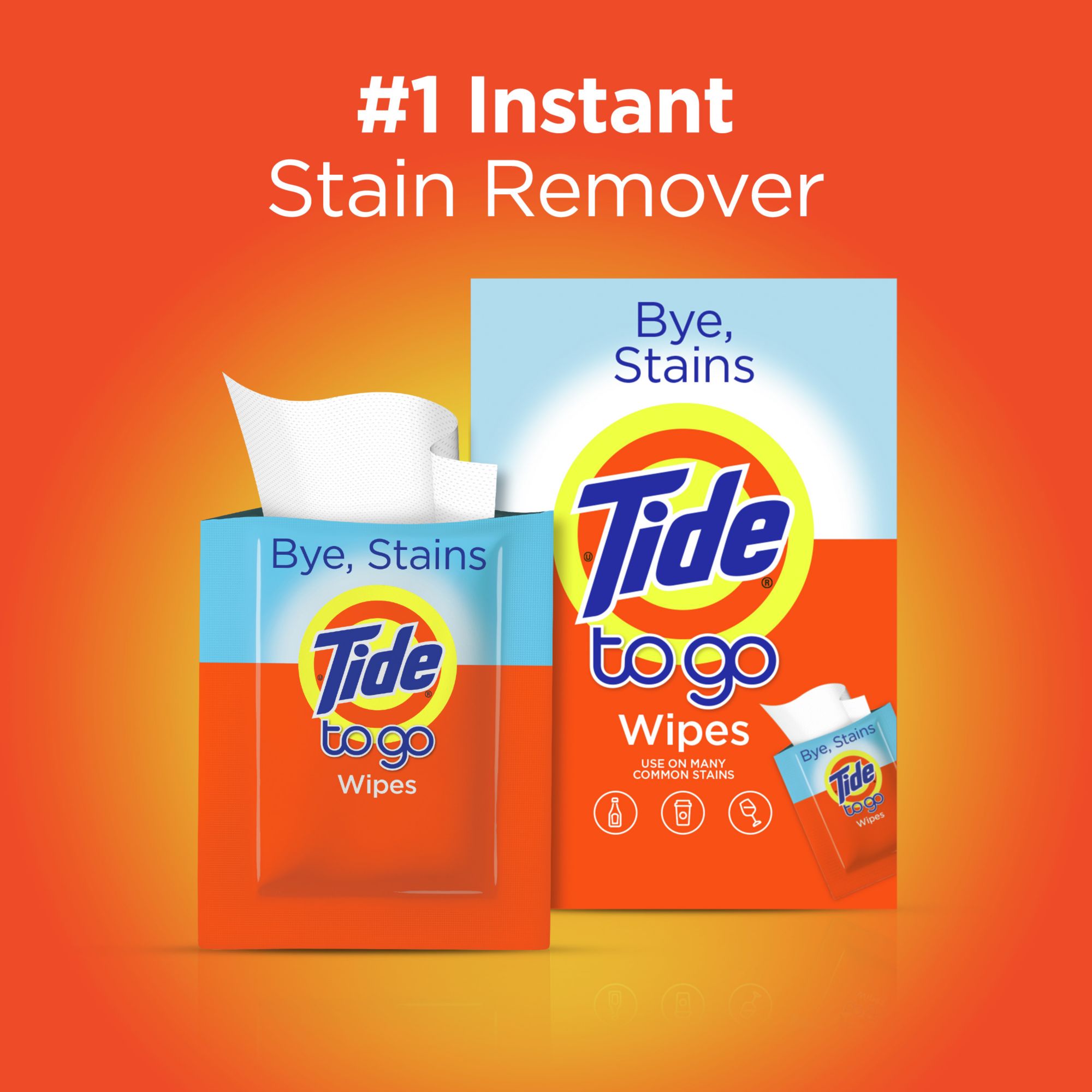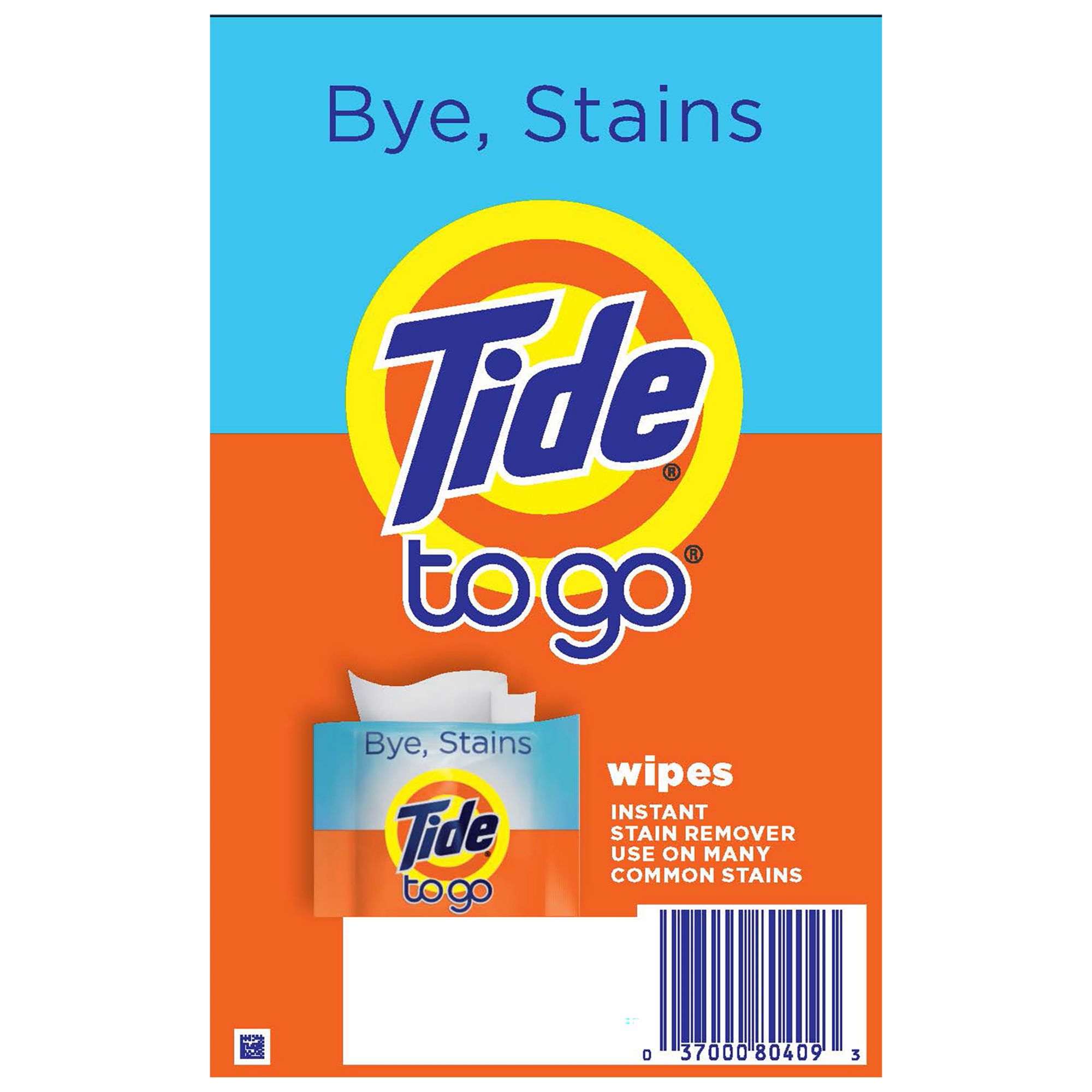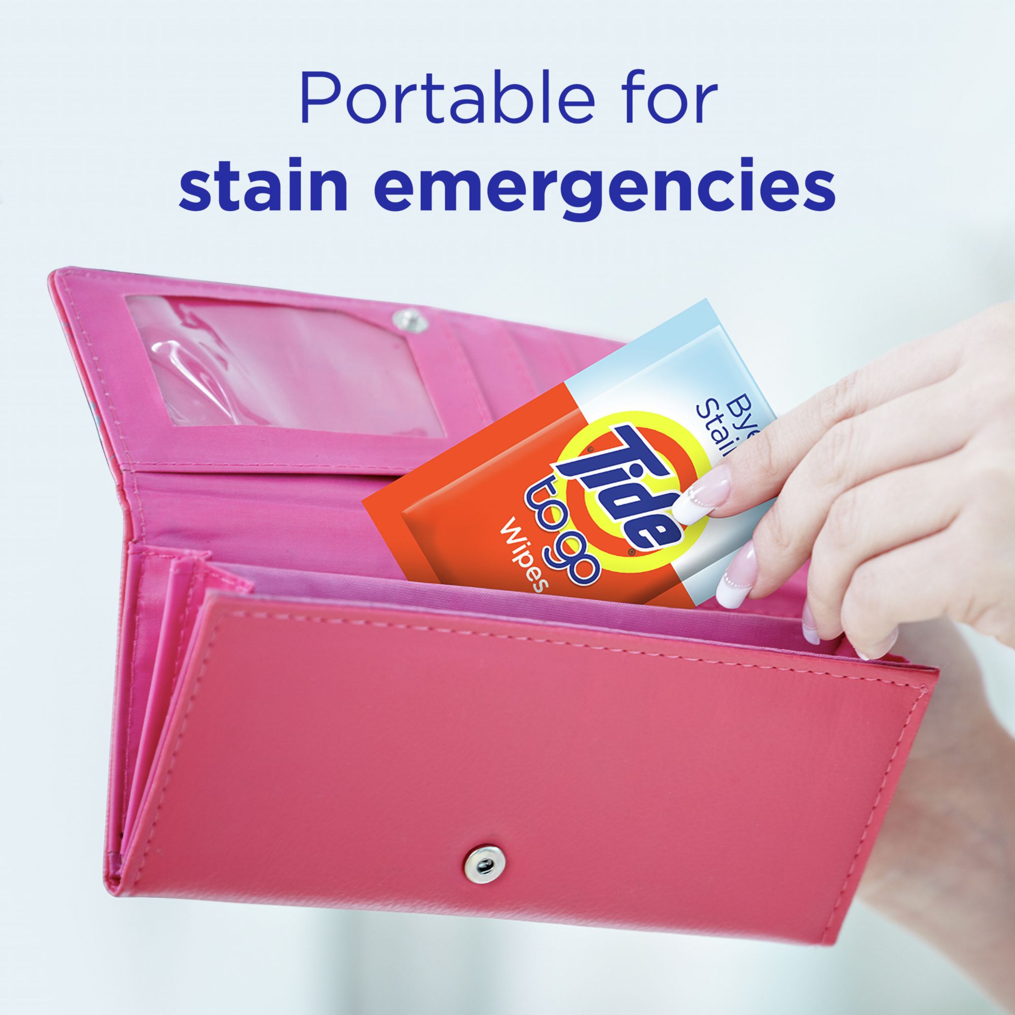 Tide To Go Wipes are our most convenient instant stain remover ever for common stain emergencies like coffee, wine, ketchup, sauce, or juice. Safe to use on most fabrics as they do not contain bleach. Each cloth wipe is individually wrapped and easy to dispose so you don’t need to worry about drying out. Perfect to keep in the car or the office. Tide To Go Stain Remover Wipes are ultra-portable and easily fit in your pocket, wallet, or purse. Easy to use. Blot the stain with Tide To Go Wipes working from the outside of the stain towards the center. If necessary, remove excess stain first. Don’t forget to rinse your hands once you are done.