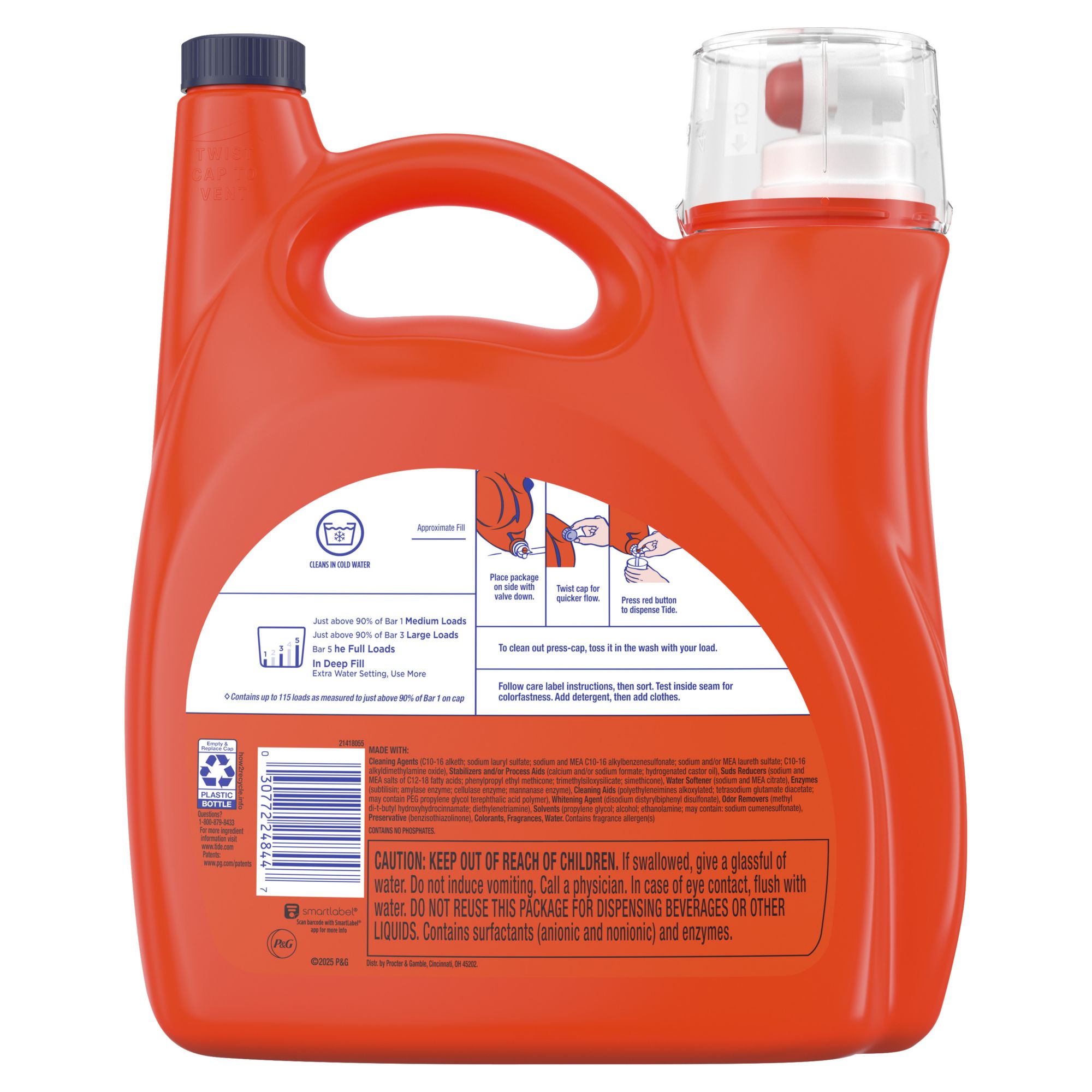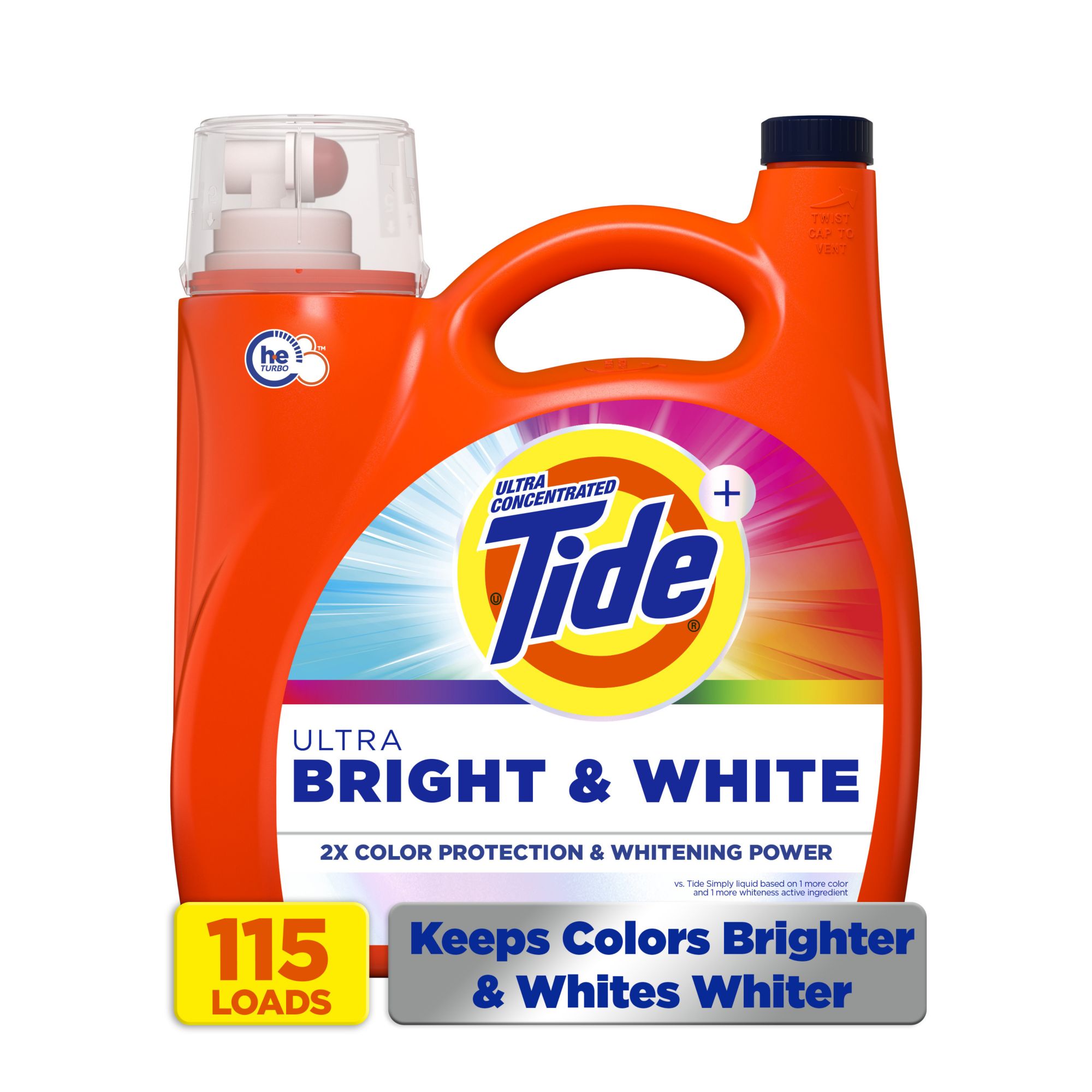 Unlock Exceptional Cleaning Power. Elevate your laundry experience with Tide Ultra Bright & White Liquid Laundry Detergent. Engineered for superior stain removal and whitening, this powerful detergent ensures your clothes look their absolute best. With Ultra Bright & White, enjoy double the color protection and whitening power.* Keep colors vibrant and whites radiant. Wave goodbye to faded colors and dull whites. Tide Ultra Bright & White keeps colors vibrant and whites radiant**. This formula is safe for all colors, preserving the integrity of your garments without bleach. Plus, with 115 loads in a 147 fl. oz. bottle, you get more cleaning power in every bottle.*** Get more cleaning, less water. Why pay for water when you can get double the cleaning ingredients? Choose Tide Ultra Bright & White Liquid Laundry Detergent for powerful stain-fighting and whitening that's safe for colors. Easy to use, streamline your laundry routine with Tide Ultra Bright & White. For the best results, simply use the cap to measure the right amount for your load size. The easy-to-measure and pour design makes it hassle-free to add the detergent to your washing machine before loading your clothes for an unbeatable clean.