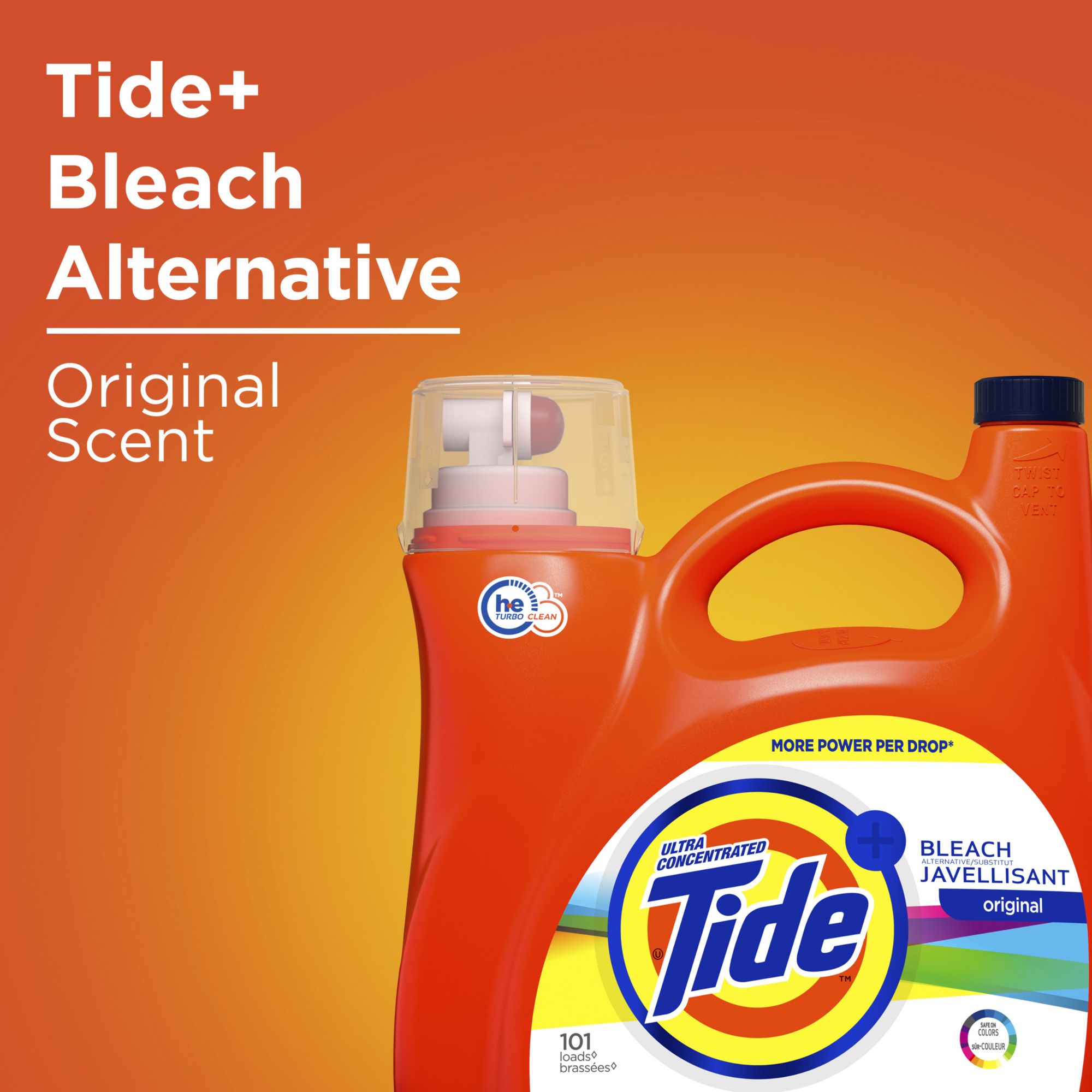 Tide Plus Bleach Alternative Original Scent Laundry Detergent offers the brilliant clean you know and love, plus helps your fabrics look brighter and whiter after just one wash.* It allows you to look bright in your whites while also protecting your colors by reviving dingy fabrics and preventing the dirty wash water from soaking back into them. It is supercharged with 10 times the cleaning power** and is recommended by leading high-efficiency washing machine manufacturers.†