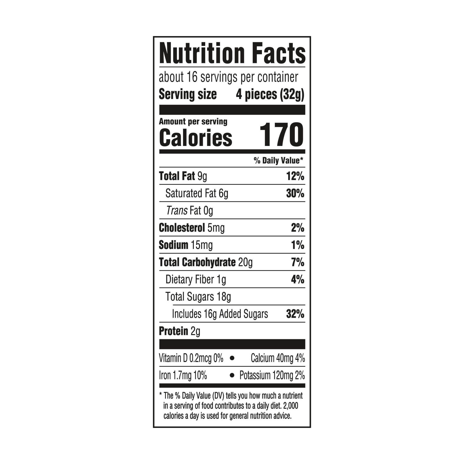 Ingredients: Sugar, Chocolate, Milk, Cocoa Butter, Honey, Milkfat, Almonds, Invert Sugar, Soy Lecithin, Egg Whites, Artificial Flavor. Contains: Milk, Almond, Soy, Egg.