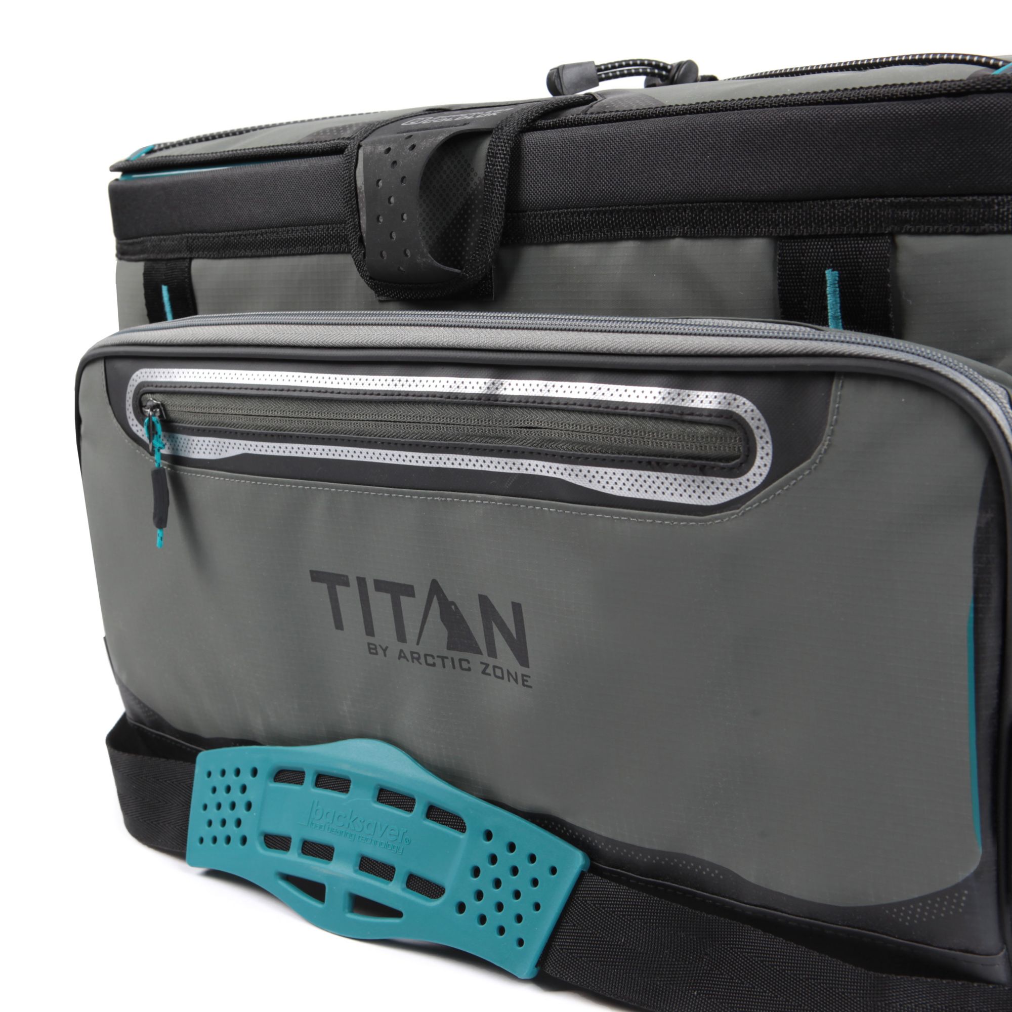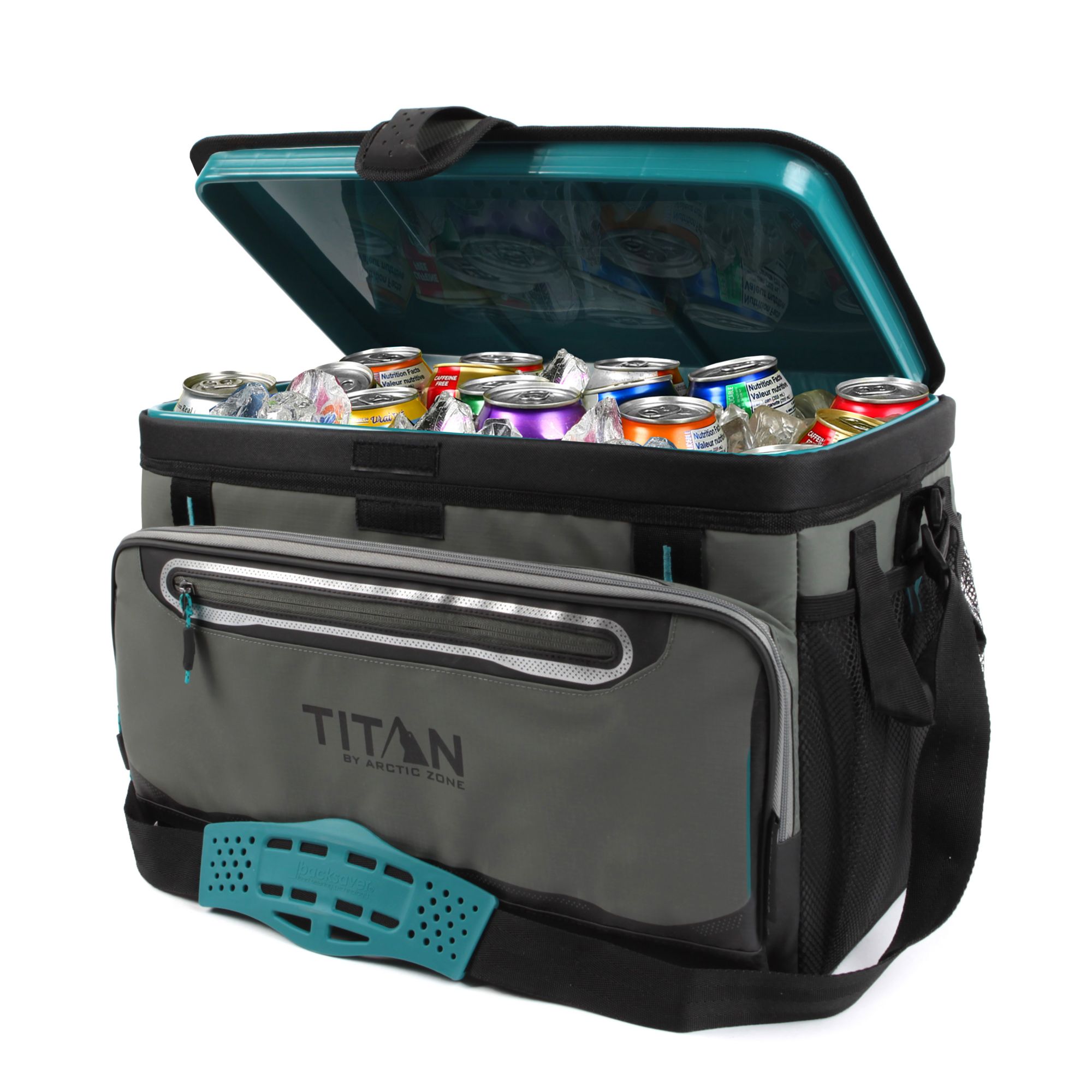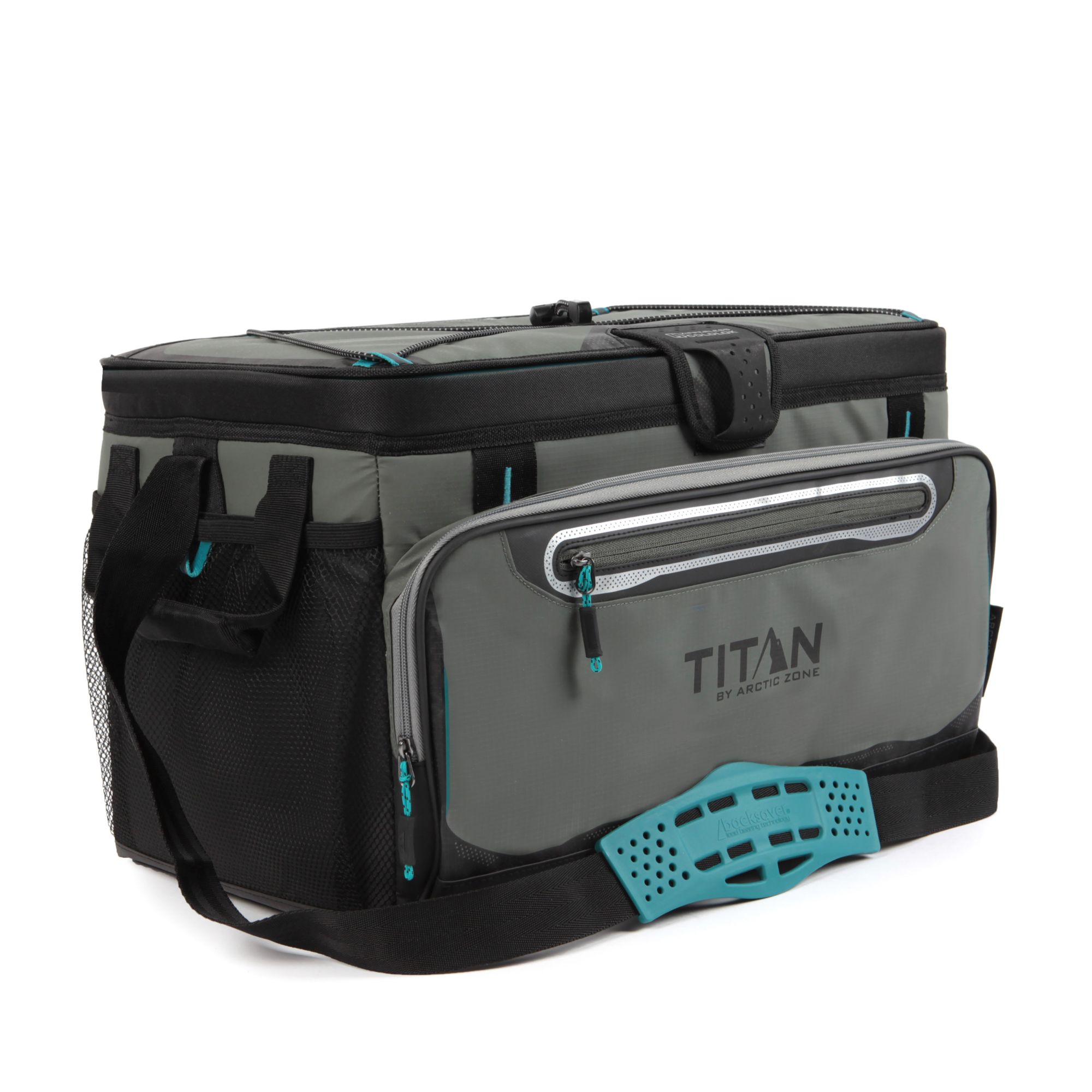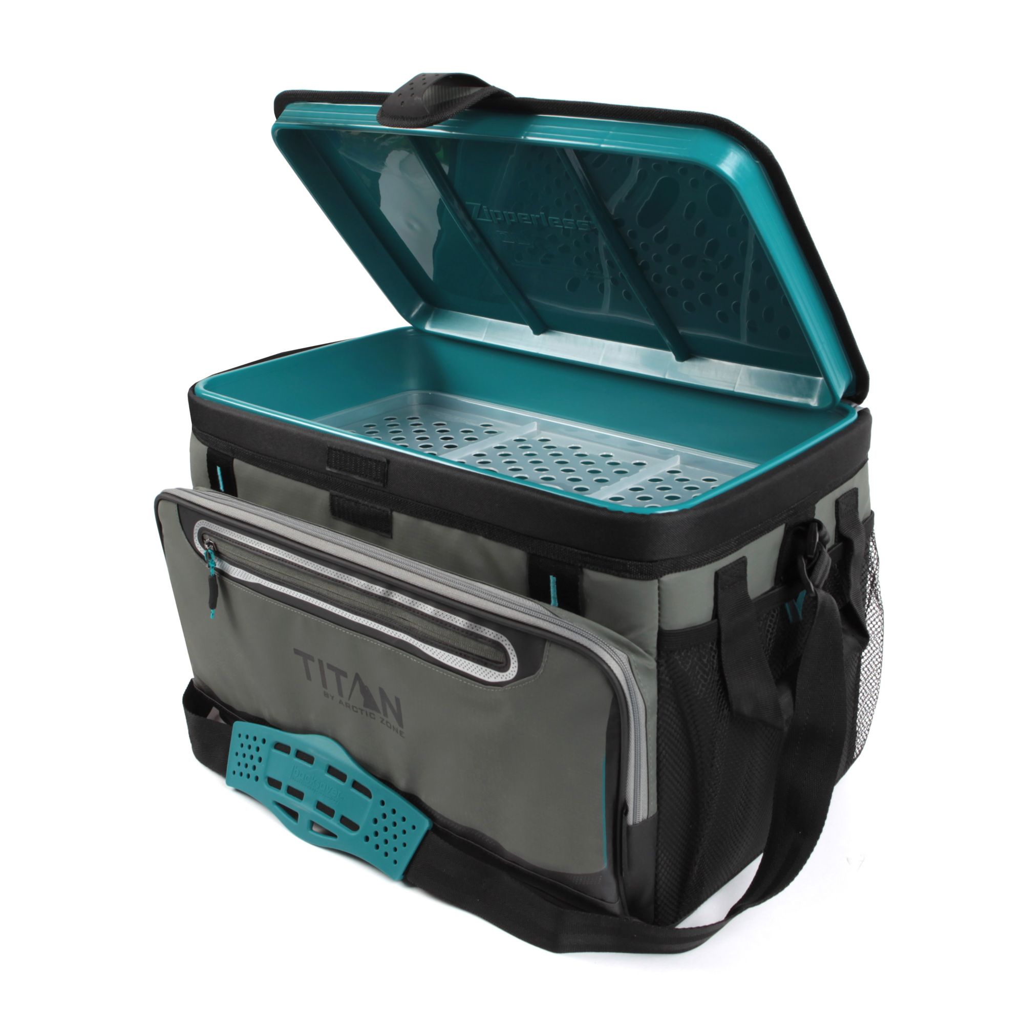The Titan Deep Freeze 48 Can Zipperless Cooler keeps ice for up to three days! Deep Freeze High Performance Insulation with radiant heat barrier and triple layer ColdBlock base combine to create superior cooling. The cooler features a "flip-open", patented Zipperless lid that provides quick access to food and drinks as well as an insulated front pocket. The interior includes a durable had liner with SmartShelf. The SmartShelf allows you to keep hard items like drinks separate from soft items, so sandwiches and other soft foods don’t get crushed. If you want to use the entire liner, the SmartShelf easily removes to provide one large compartment. The cooler’s coated exterior is water and stain repellent and wipes clean easily. For easier carrying, there is an adjustable Backsaver shoulder strap with anti-slip shoulder pad that centers load weight to reduce body stress.