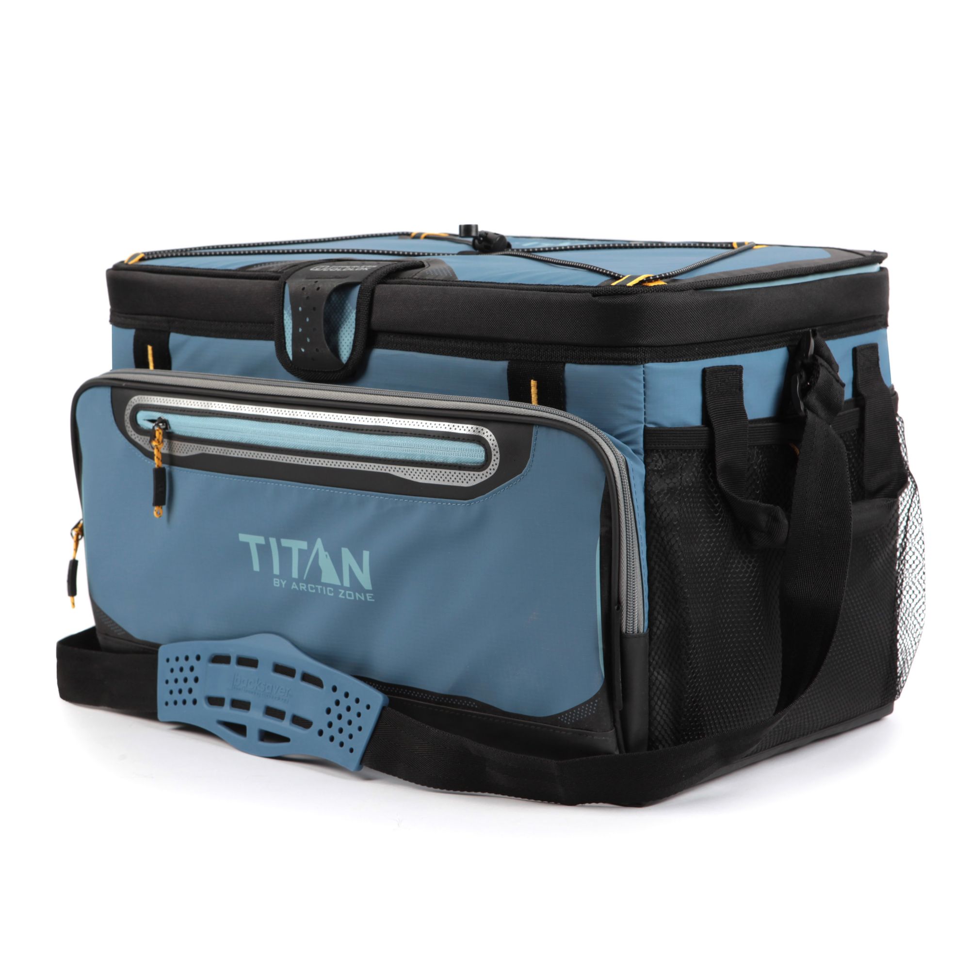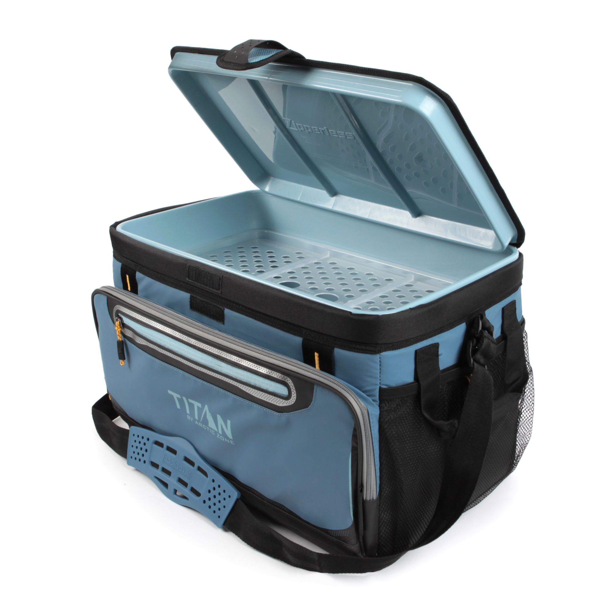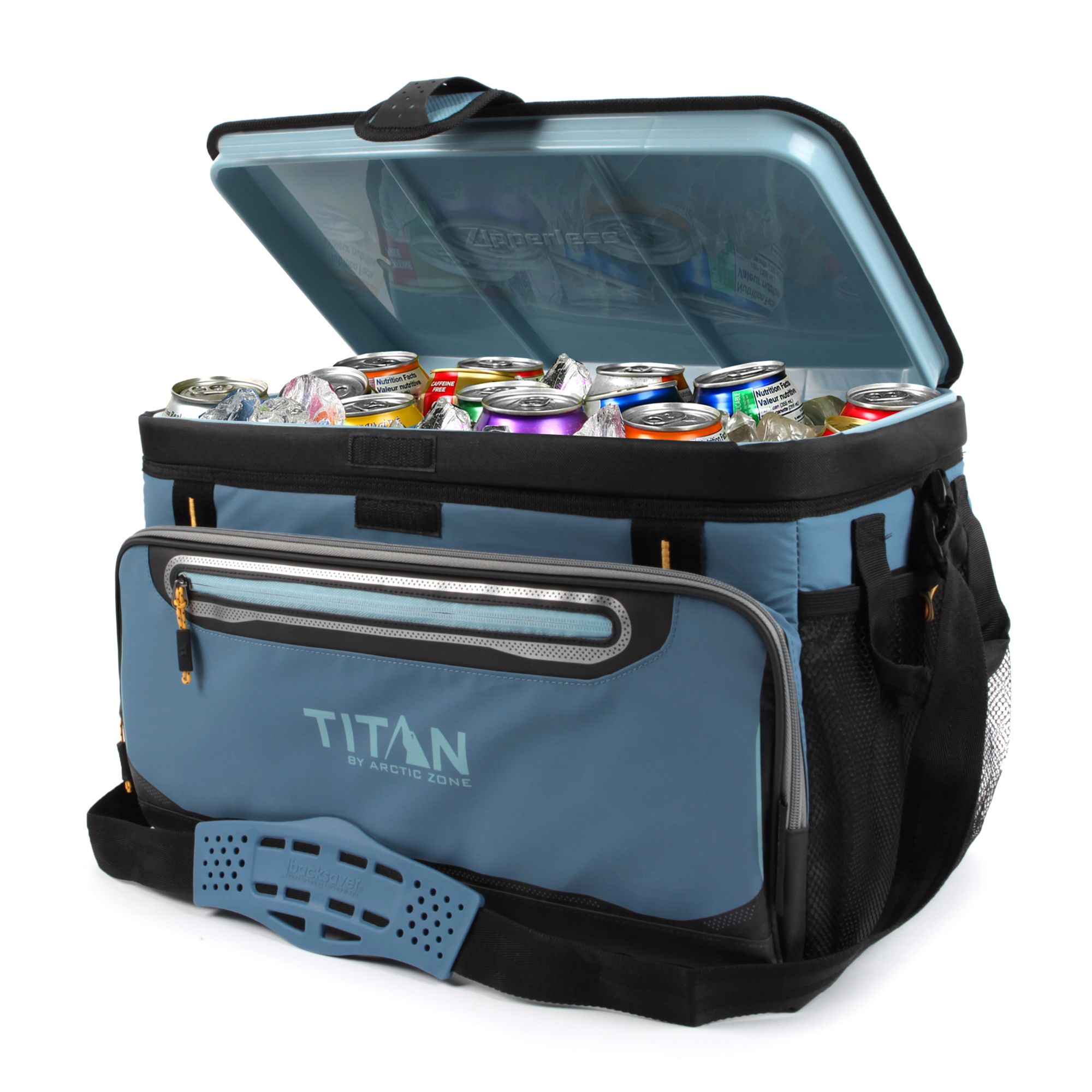 The Titan Deep Freeze 48 Can Zipperless Cooler keeps ice for up to three days! Deep Freeze High Performance Insulation with radiant heat barrier and triple layer ColdBlock base combine to create superior cooling. The cooler features a "flip-open", patented Zipperless lid that provides quick access to food and drinks as well as an insulated front pocket. The interior includes a durable had liner with SmartShelf. The SmartShelf allows you to keep hard items like drinks separate from soft items, so sandwiches and other soft foods don’t get crushed. If you want to use the entire liner, the SmartShelf easily removes to provide one large compartment. The cooler’s coated exterior is water and stain repellent and wipes clean easily. For easier carrying, there is an adjustable Backsaver shoulder strap with anti-slip shoulder pad that centers load weight to reduce body stress.