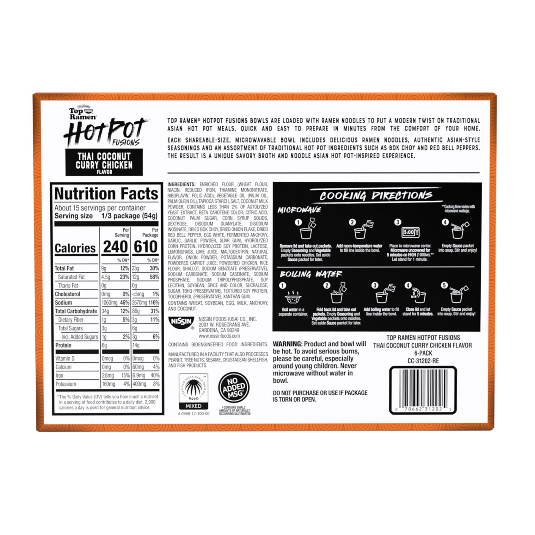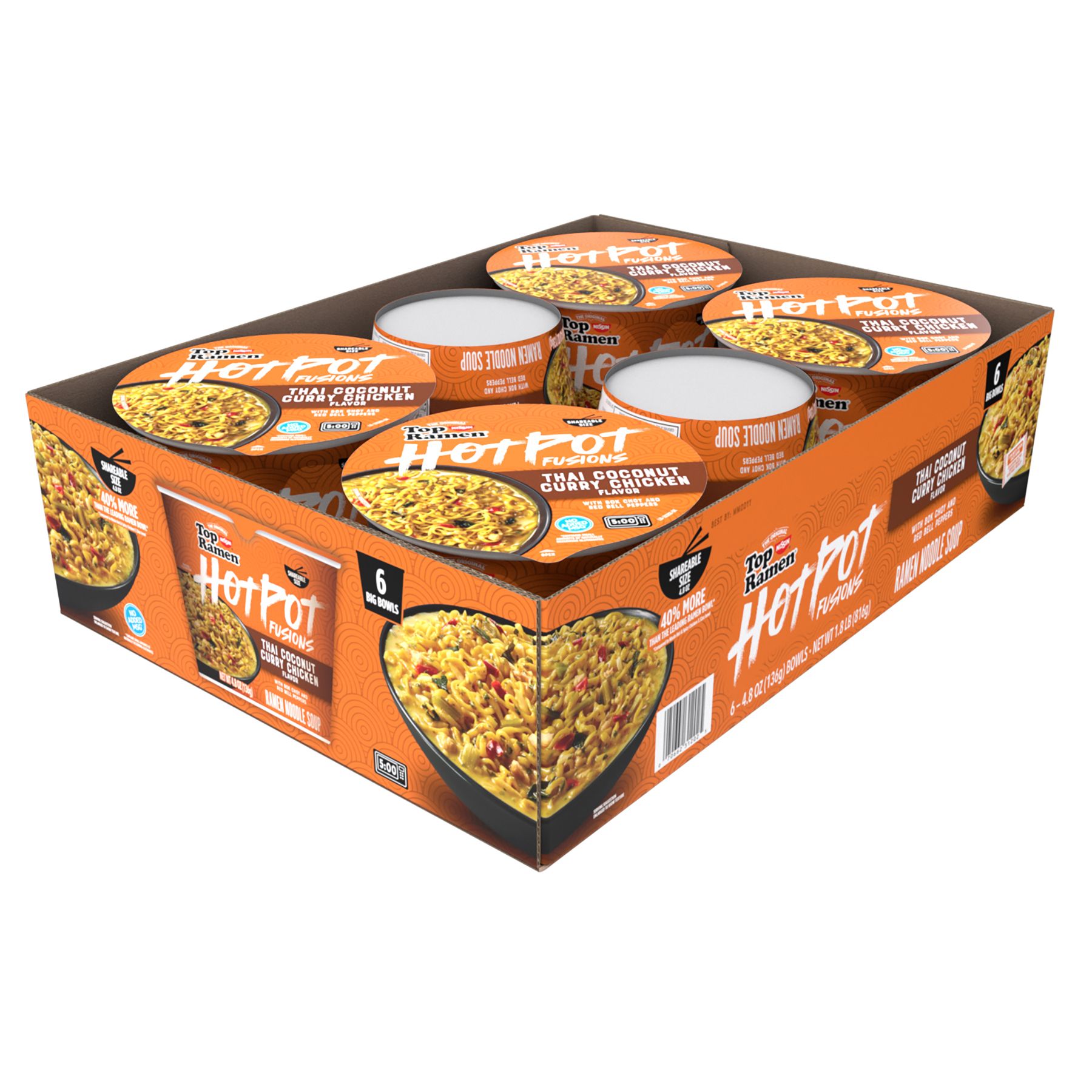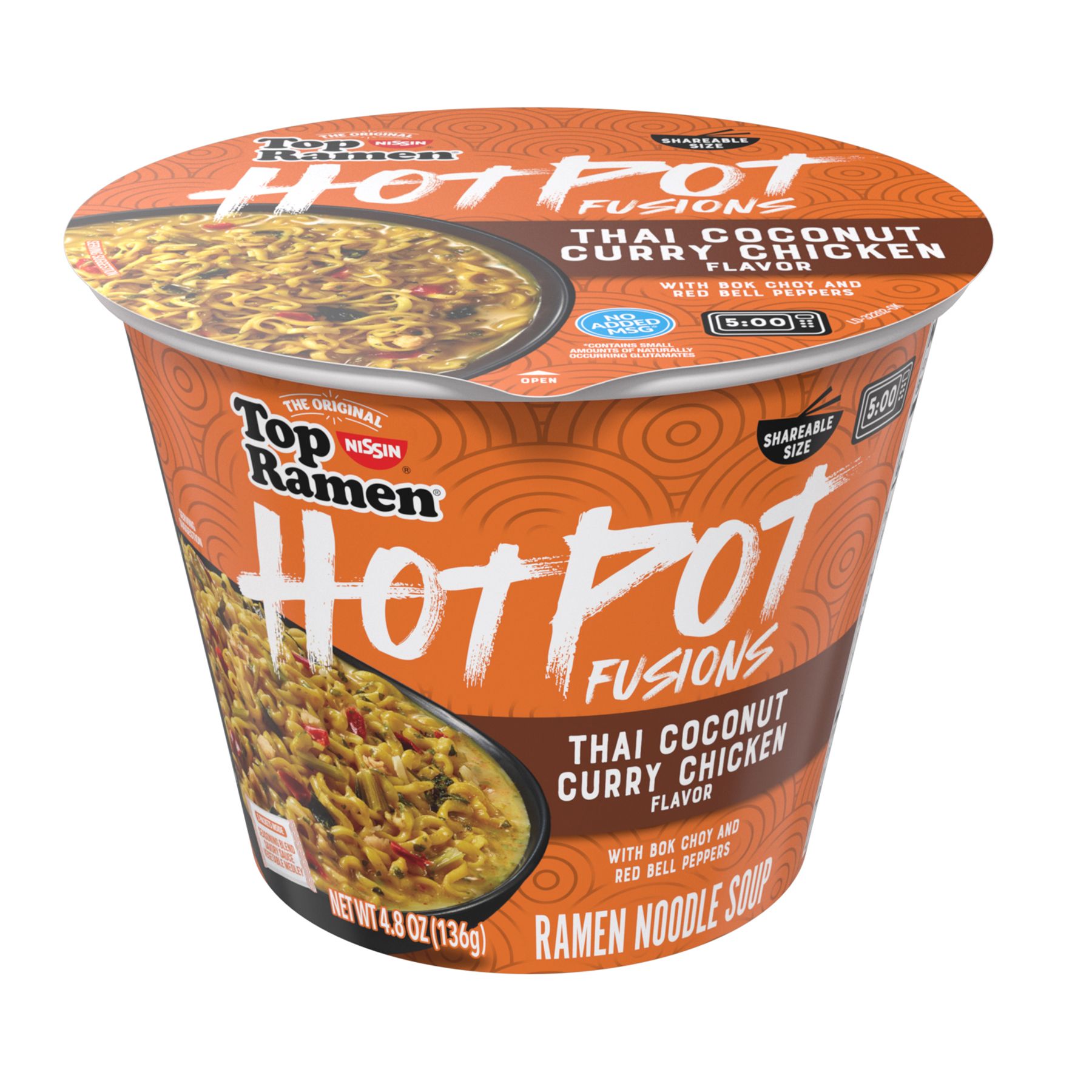 Top Ramen HotPot Fusions bowls are loaded with ramen noodles to put a modern twist on traditional Asian hot pot meals. The result is a unique Asian hot pot-inspired noodle experience, easy to prepare in minutes. Each Thai Coconut Curry Chicken Bowl contains bok choy, red bell peppers, delicious ramen noodles and savory spices that combine to delight your taste buds and transport you on a culinary adventure.