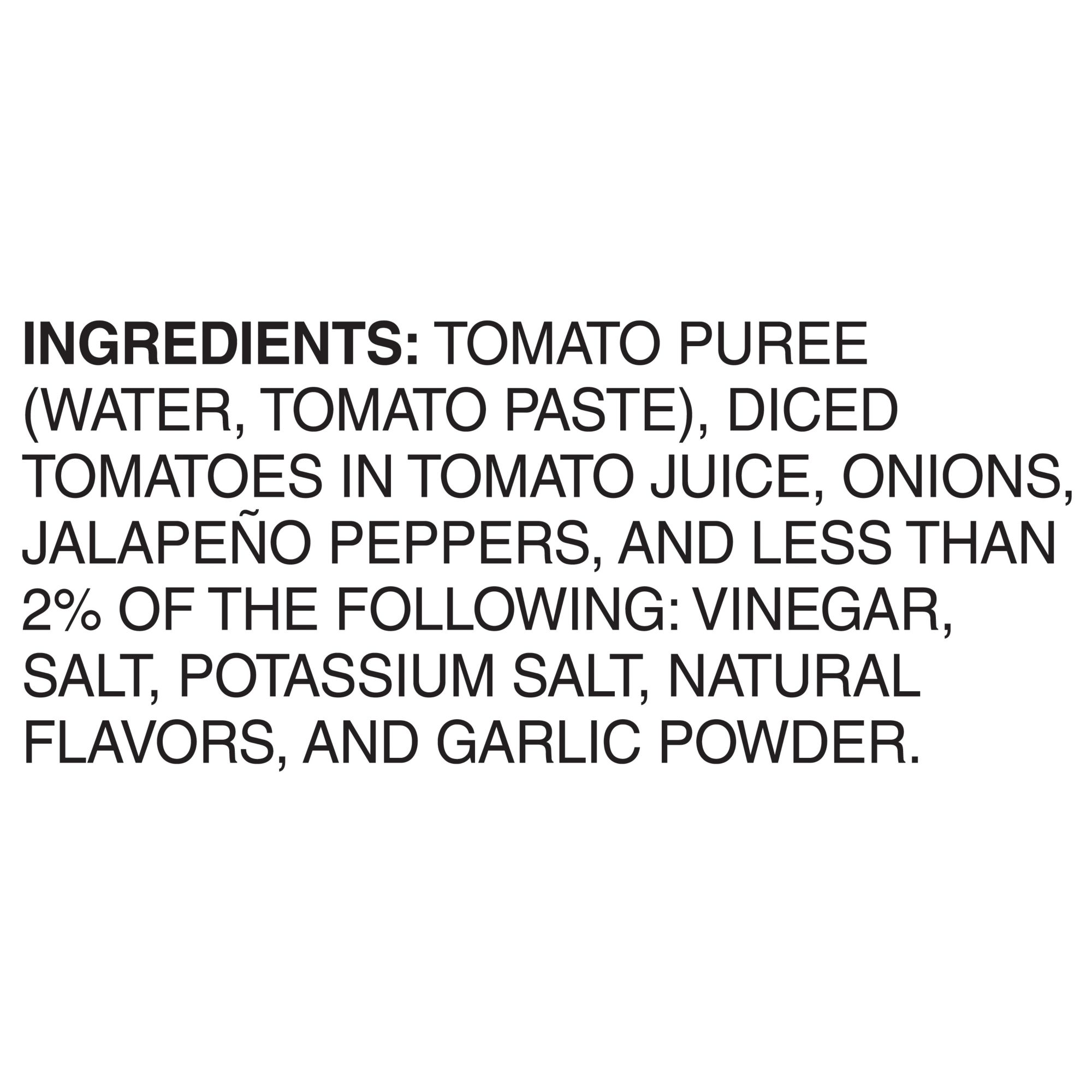 Ingredients: Tomato Puree (Water And Tomato Paste), Diced Tomatoes In Tomato Juice, Jalapeño Peppers, Onions, And Less Than 2% Of The Following: Vinegar, Salt, Natural Flavor, And Garlic Powder.