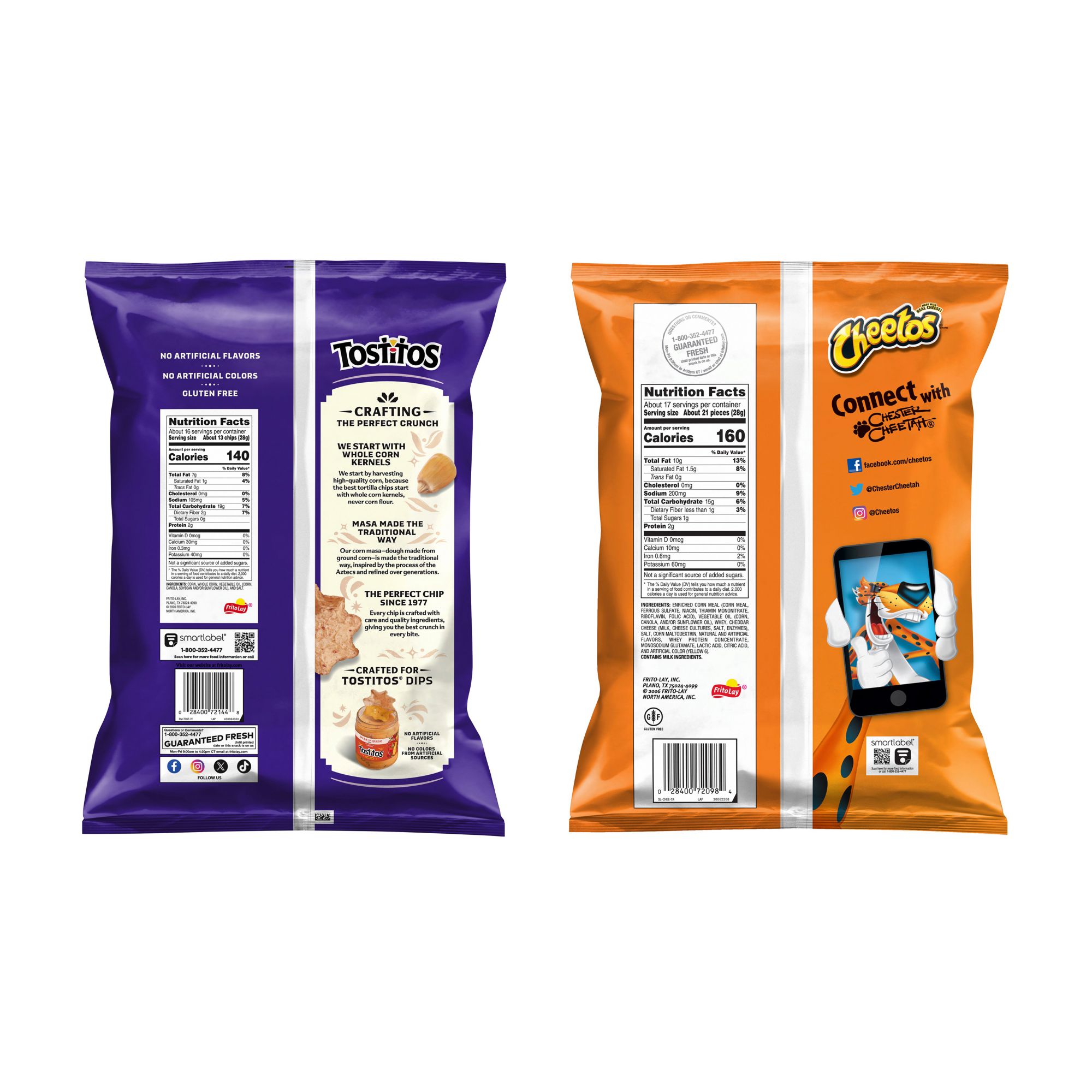 Ingredients: TOSTITOS: Corn, Vegetable Oil (Corn, Canola, and/or Sunflower Oil), and Salt. CHEETOS: Enriched Corn Meal (Corn Meal, Ferrous Sulfate, Niacin, Thiamin Mononitrate, Riboflavin, Folic Acid), Vegetable Oil (Corn, Canola, and/or Sunflower Oil), Cheese Seasoning (Whey, Cheddar Cheese [Milk, Cheese Cultures, Salt, Enzymes], Canola Oil, Maltodextrin [Made from Corn], Natural and Artificial Flavors, Salt, Whey Protein Concentrate, Monosodium Glutamate, Lactic Acid, Citric Acid, Artificial Color [Yellow 6]), and Salt.