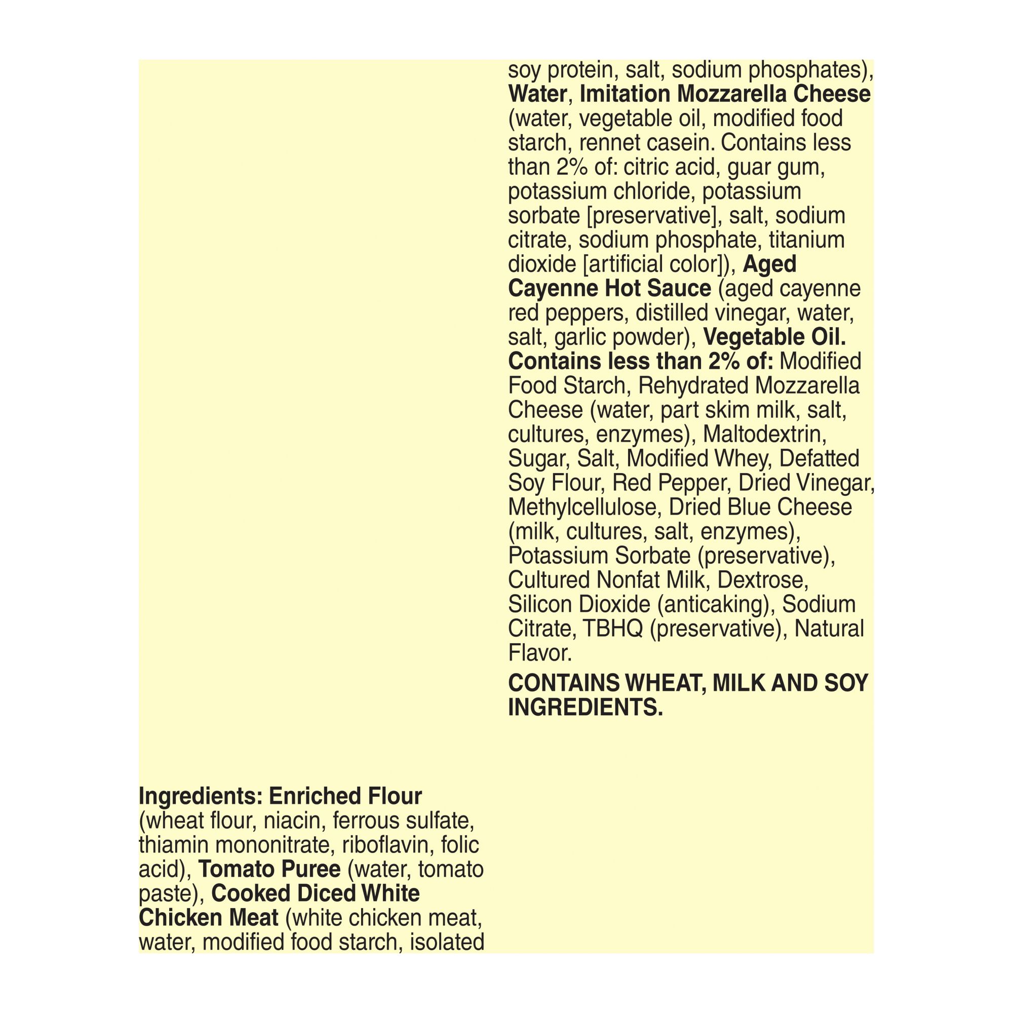 Ingredients: Enriched Flour (Wheat Flour, Niacin, Ferrous Sulfate, Thiamin Mononitrate, Riboflavin, Folic Acid), Tomato Puree (Water, Tomato Paste), Fully Cooked, Roasted Diced White Chicken Meat (White Chicken Meat, water, Modified Corn Starch, Salt, Isolated Soy Protein, Sodium Phosphate), Vegetable Oil, Imitation Mozzarella Cheese (Water, Vegetable Oil, Modified Food Starch, Rennet Casein). Contains Less Than 2% Of: Citric Acid, Guar Gum, Potassium Chloride, Potassium Sorbate [Preservative], Salt, Sodium Citrate, Sodium Phosphate, Titanium Dioxide[artificial Color]), Aged Cayenne Hot Sauce(aged Cayenne Red Peppers, Distilled Vinegar, Water, Salt, Garlic Powder). Contains Less Than 2% Of: Modified Food Starch, Maltodextrin, Sugar, Rehydrated Fat Free Mozzarella Cheese (Water, Skim Milk, Cheese Cultures, Salt, Enzymes), Salt, Modified Whey, Defatted Soy Flour, Red Pepper, Dried Vinegar, Methylcellulose, Dried Blue Cheese (Milk, Cultures, Salt, Enzymes), Potassium Sorbate, Rehydrated Enzyme Modified Cheese (Water, Milk, Cheese Cultures, Salt, Enzymes, Citric Acid).