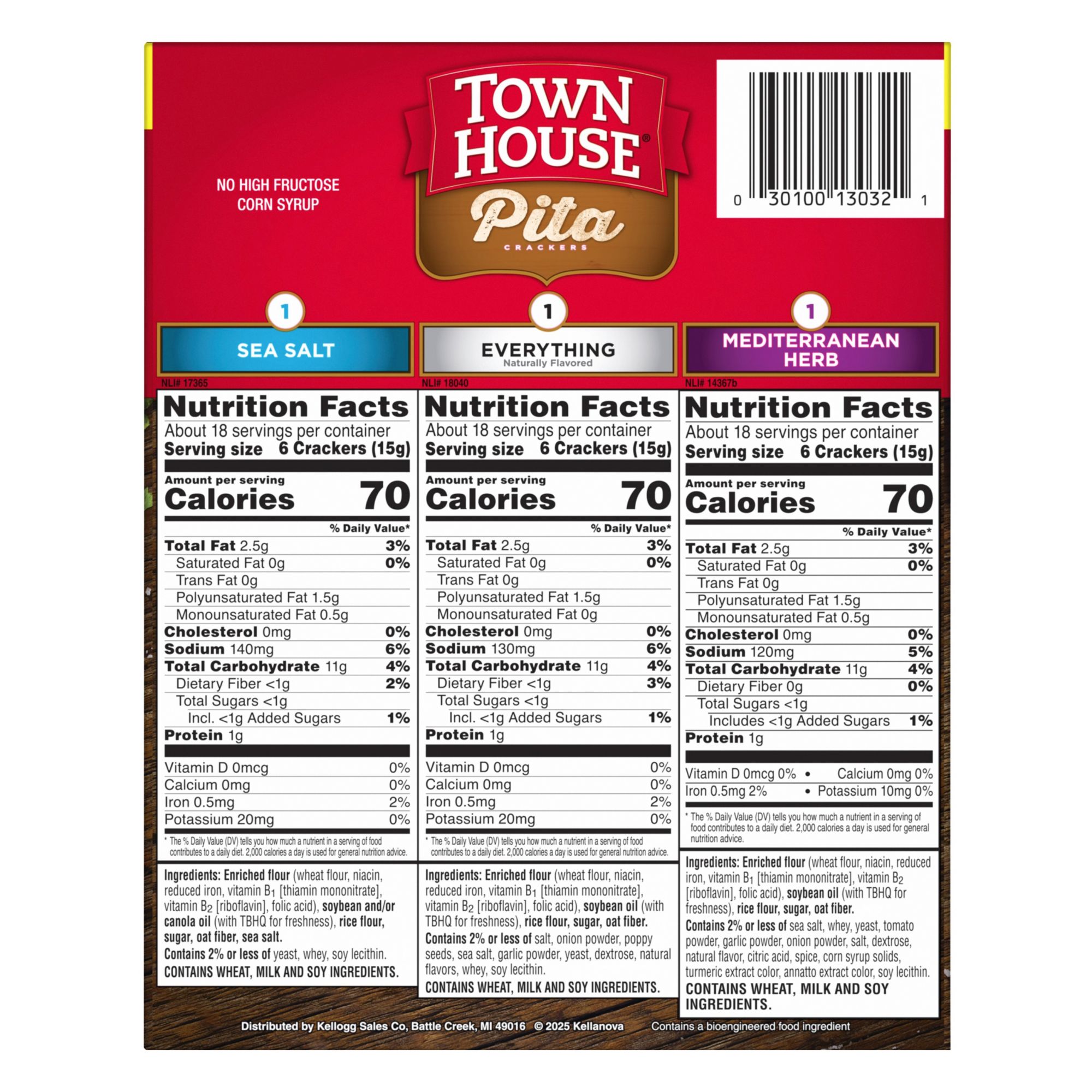 Ingredients: Pita Everything Ingredients: Enriched Flour (Wheat Flour, Niacin, Reduced Iron, Vitamin B1 [Thiamin Mononitrate], Vitamin B2 [Riboflavin], Folic Acid), Soybean Oil (With Tbhq For Freshness), Rice Flour, Sugar, Oat Fiber. Contains 2% Or Less Of Salt, Onion Powder, Poppy Seeds, Sea Salt, Garlic Powder, Yeast, Dextrose, Natural Flavors, Whey, Soy Lecithin. Mediterranean Herb Ingredients: Enriched Flour (Wheat Flour, Niacin, Reduced Iron, Vitamin B1 [Thiamin Mononitrate], Vitamin B2 [Riboflavin], Folic Acid), Soybean Oil (With Tbhq For Freshness), Rice Flour, Sugar, Oat Fiber. Contains 2% Or Less Of Sea Salt, Whey, Yeast, Tomato Powder, Garlic Powder, Onion Powder, Salt, Dextrose, Natural Flavor, Citric Acid, Spice, Corn Syrup Solids, Turmeric Extract Color, Annatto Extract Color, Soy Lecithin. Sea Salt Ingredients: Enriched Flour (Wheat Flour, Niacin, Reduced Iron, Vitamin B1 [Thiamin Mononitrate], Vitamin B2 [Riboflavin], Folic Acid), Soybean And/or Canola Oil (With Tbhq For Freshness), Rice Flour, Sugar, Oat Fiber, Sea Salt. Contains 2% Or Less Of Yeast, Whey, Soy Lecithin.