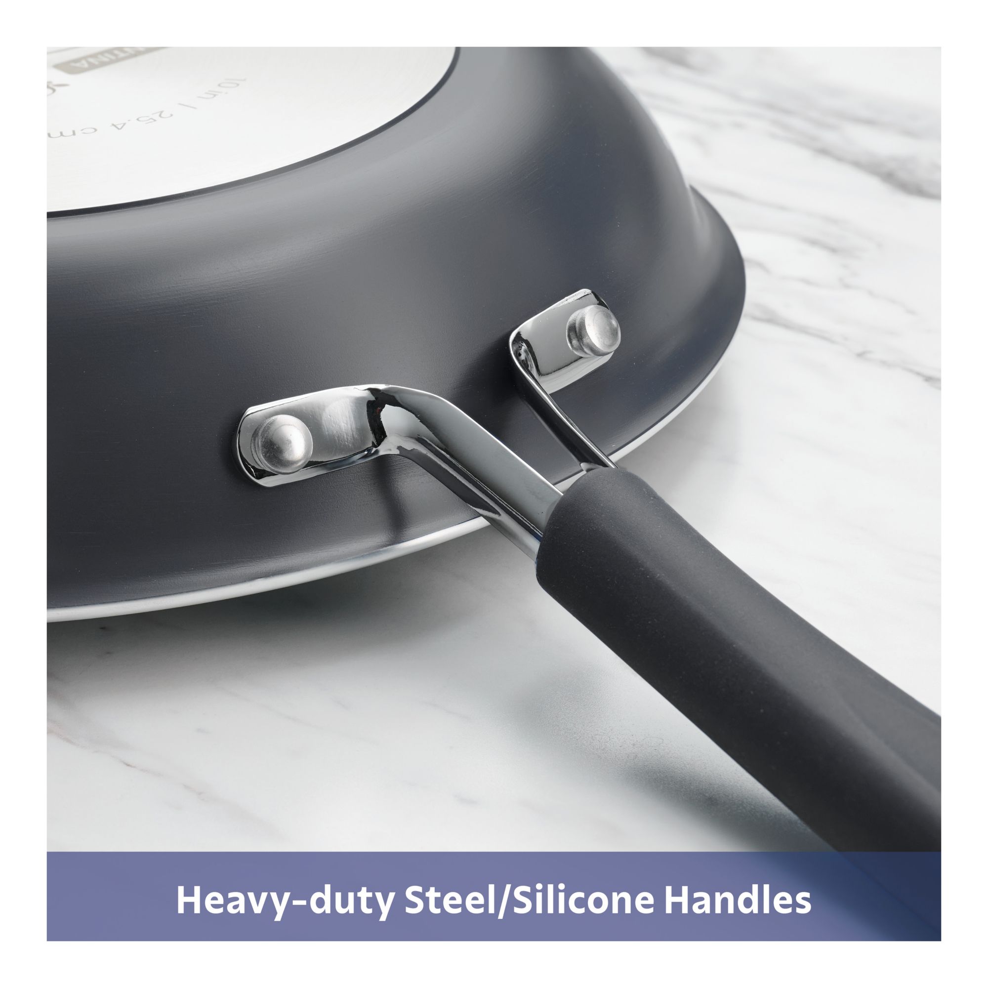 Ergonomic, riveted steel handles provide a secure, comfortable grip at all times, making it easy to move your cookware from stove to table