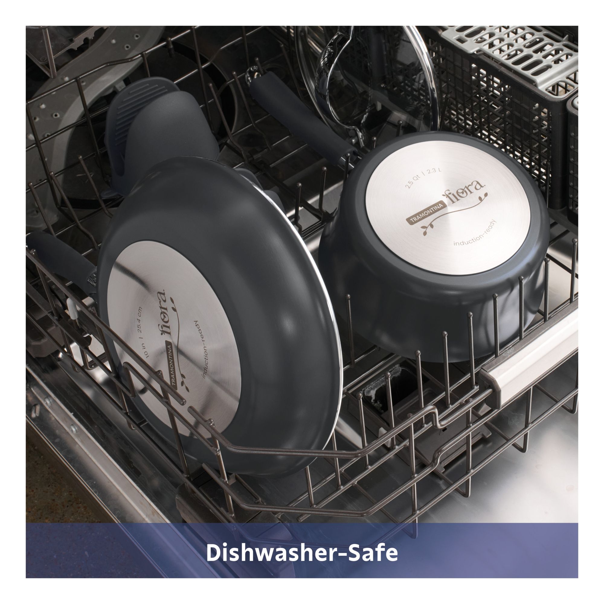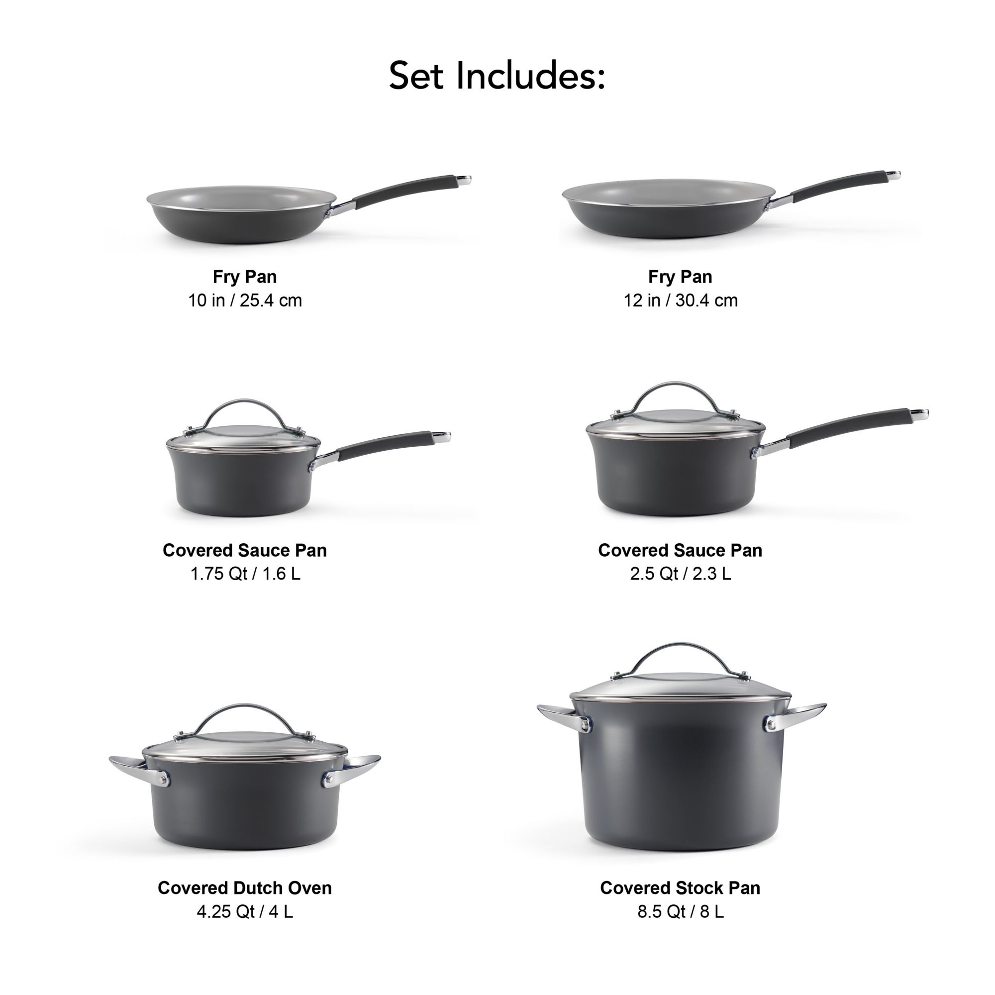 Includes 10” fry pan, 12” fry pan, 1.75 qt. covered saucepan, 2.5 qt. covered saucepan, 4.25 qt. covered Dutch oven and 8.5 qt. covered stock pot