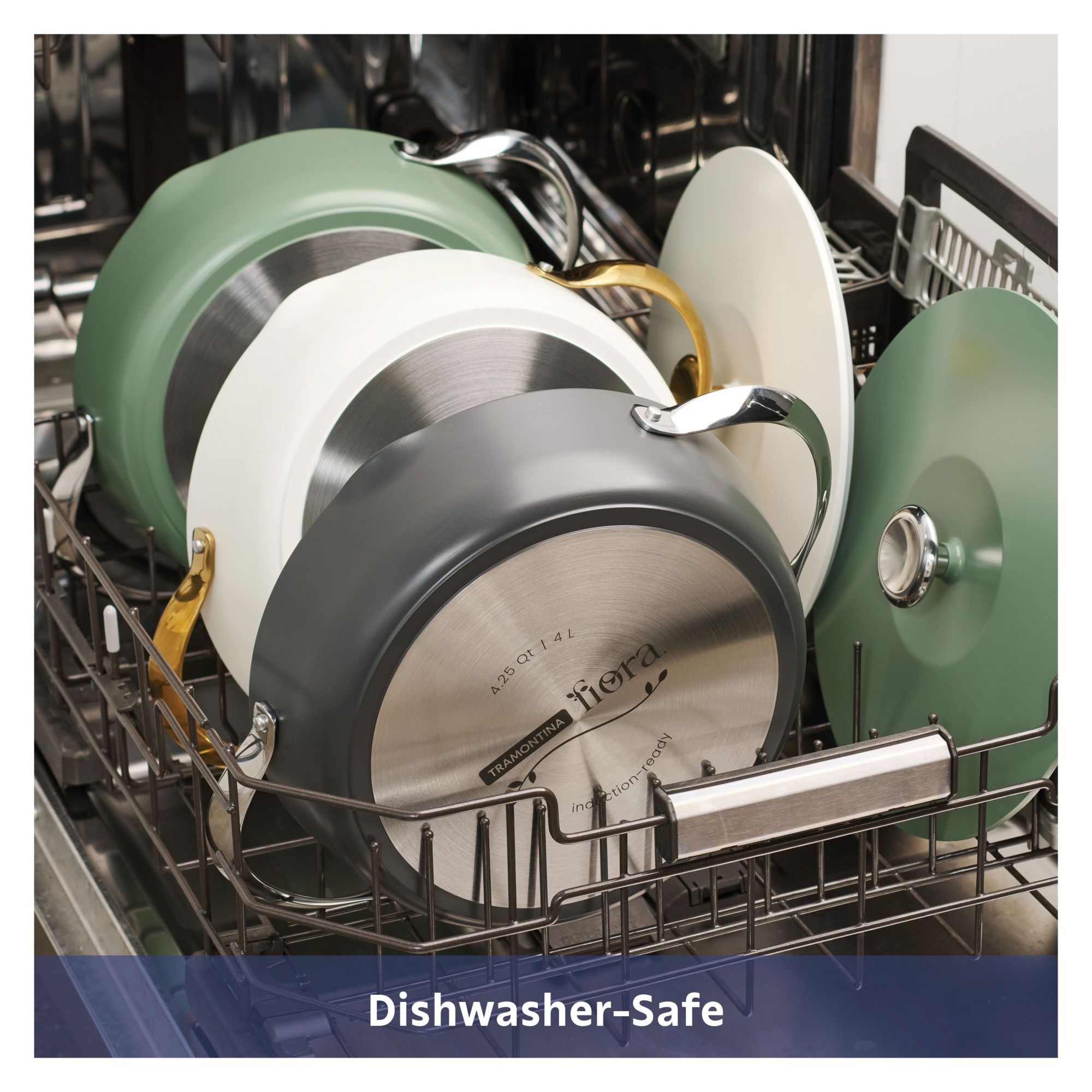 Exclusively at BJ's 4.25 Qt Multipurpose Ceramic Non-Stick 5-Piece Cookware, Bamboo Utensil, and Bamboo Trivet Heavy-gauge aluminum distributes heat quickly and evenly for perfect results Nonstick ceramic interior with Swiss Crystal™ and high-temperature silicone exterior make washing up quick and easy Made without PTFE and PFOAs, meaning you get the best cooking experience while maintaining high health standards Aluminum alloy lid provides a perfect seal for covered cooking and keeps food warm for serving Compatible with induction, gas, electric and ceramic glass cooktops, oven-safe up to 400°F (205°C) While we do suggest handwashing the Fiora Multipurpose Pan to increase its longevity, it is Dishwasher-safe Made in China with high-quality materials that are built to last Set includes: 4.25 Qt multipurpose pan with lid, bamboo utensil, and a bamboo trivet for kitchen to table ease