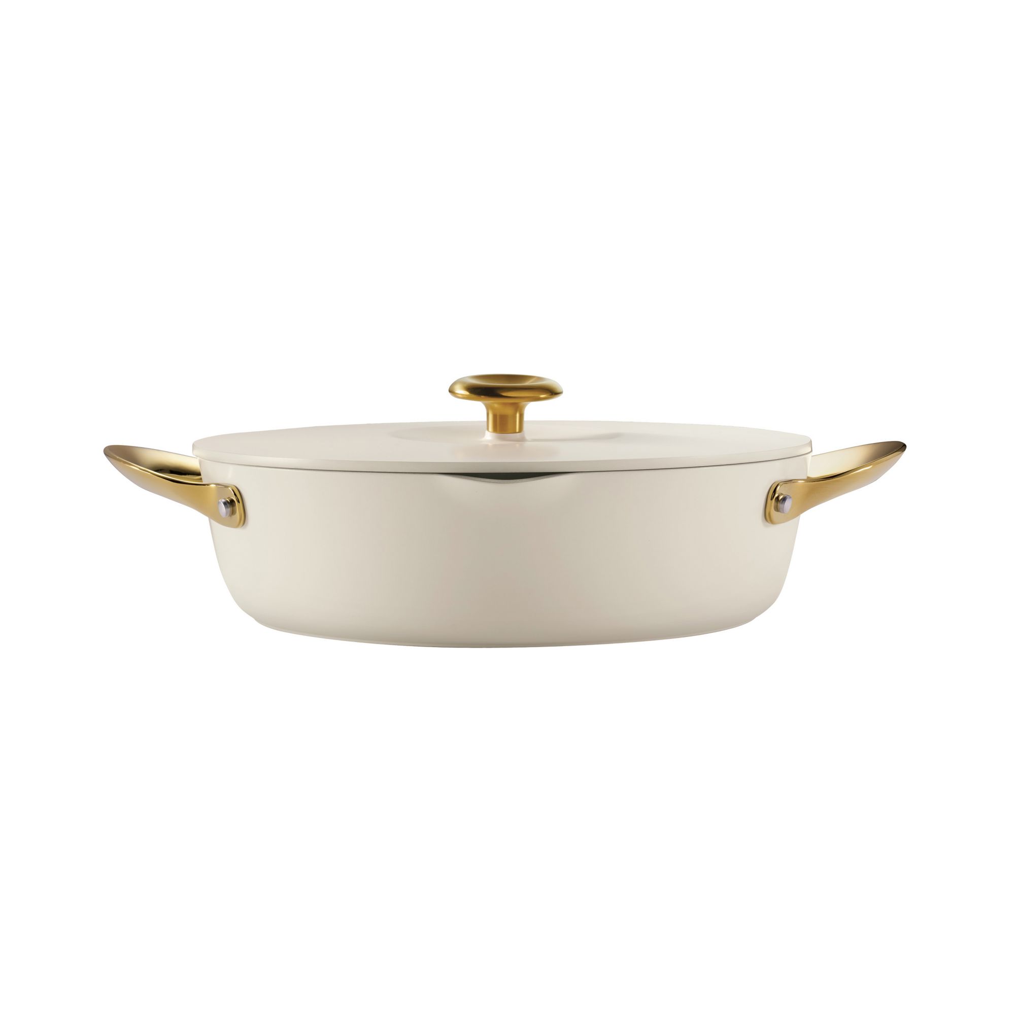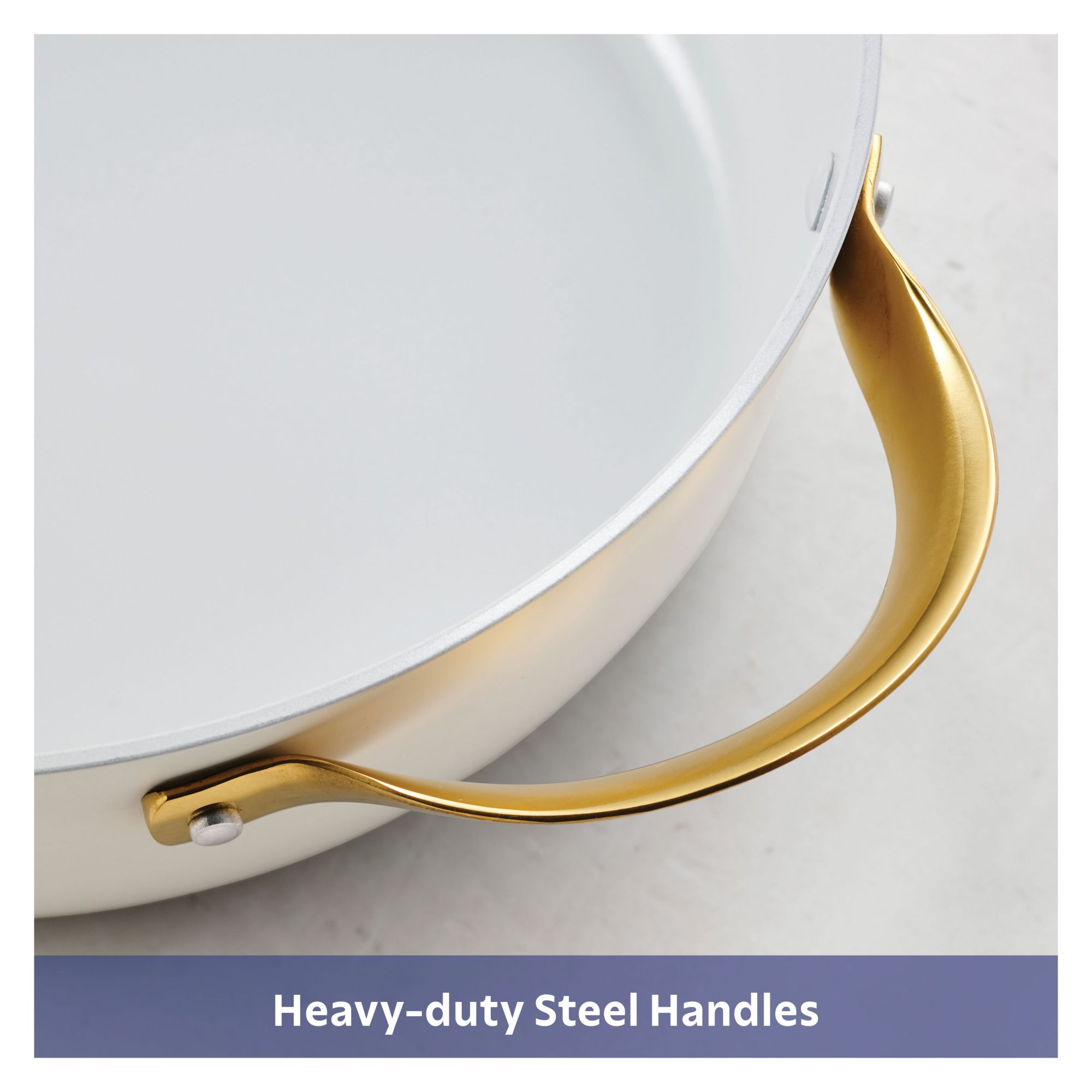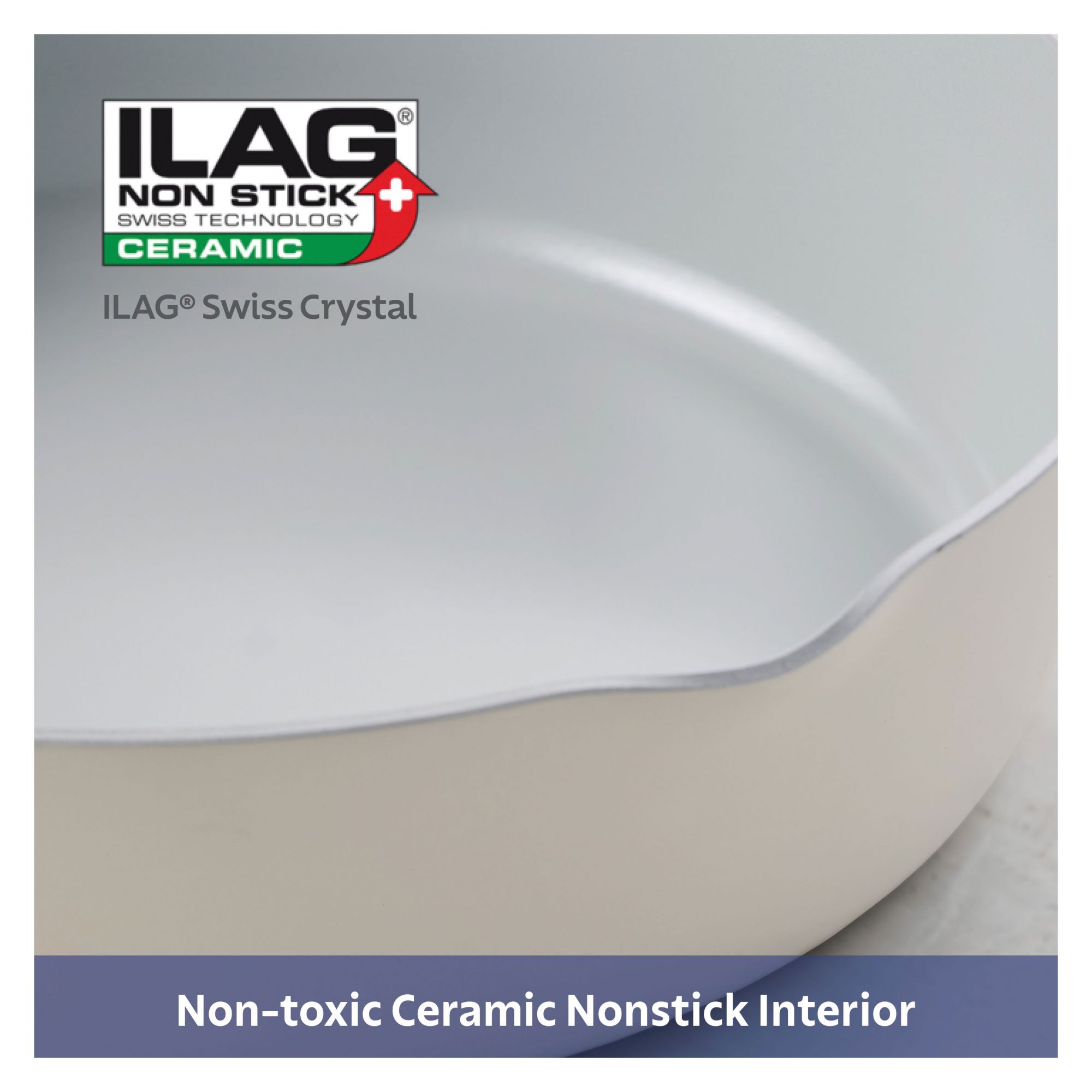 Exclusively at BJ's 4.25 Qt Multipurpose Ceramic Non-Stick 5-Piece Cookware, Bamboo Utensil, and Bamboo Trivet Heavy-gauge aluminum distributes heat quickly and evenly for perfect results Nonstick ceramic interior with Swiss Crystal™ and high-temperature silicone exterior make washing up quick and easy Made without PTFE and PFOAs, meaning you get the best cooking experience while maintaining high health standards Aluminum alloy lid provides a perfect seal for covered cooking and keeps food warm for serving Compatible with induction, gas, electric and ceramic glass cooktops, oven-safe up to 400°F (205°C) While we do suggest handwashing the Fiora Multipurpose Pan to increase its longevity, it is Dishwasher-safe Made in China with high-quality materials that are built to last Set includes: 4.25 Qt multipurpose pan with lid, bamboo utensil, and a bamboo trivet for kitchen to table ease