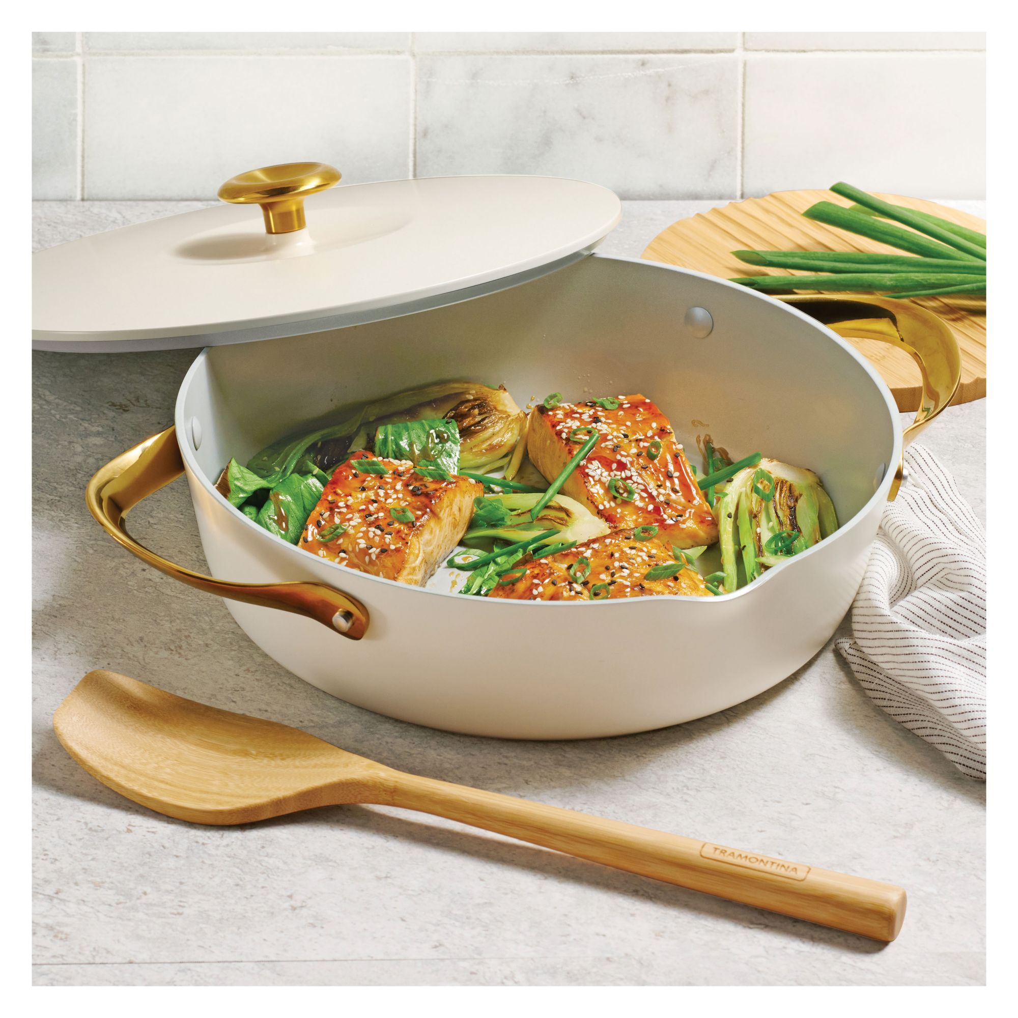 Looking for a single pan that can do it all? Get cooking with the Tramontina 5-Piece Cookware Set, and see how delicious life can be. Perfect for sauteing, searing, stir-frying, braising, simmering and slow-roasting, the Fiora 4.25 Qt Multipurpose Pan is the ultimate tool for all your favorite one-pot recipes. This set includes a Bamboo Utensil and Trivet, so you have everything you need at your fingertips.
