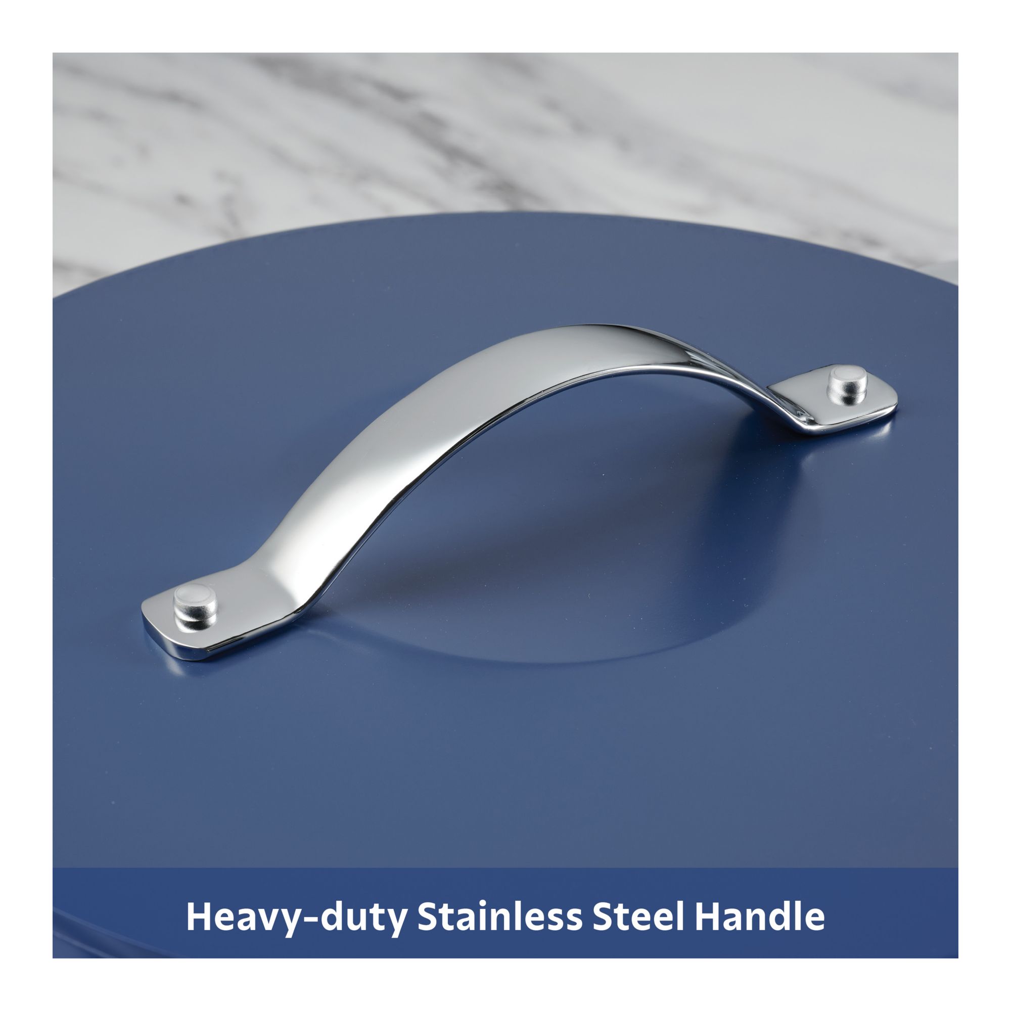 Aluminum alloy lid provides a perfect seal for covered cooking and keeps food warm for serving