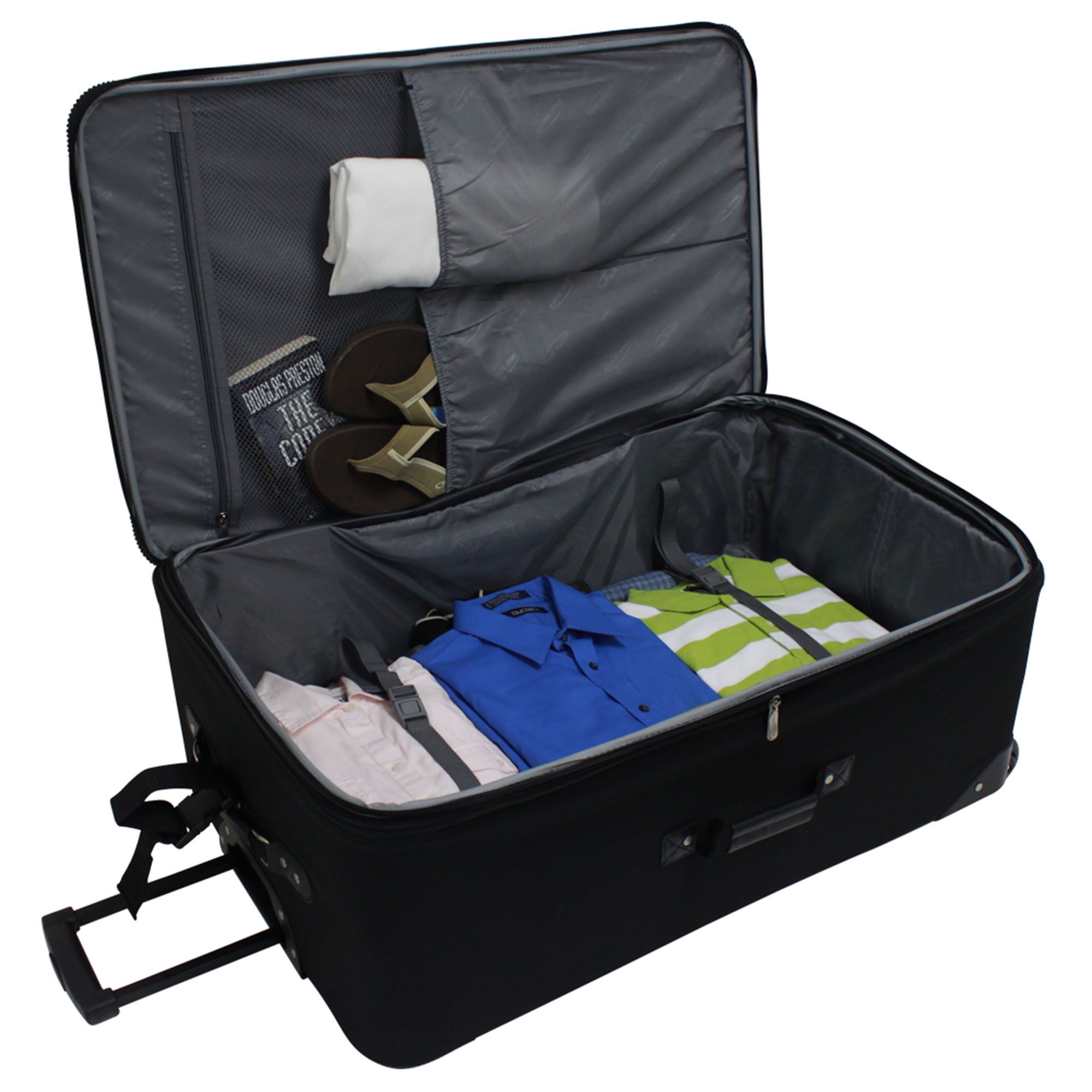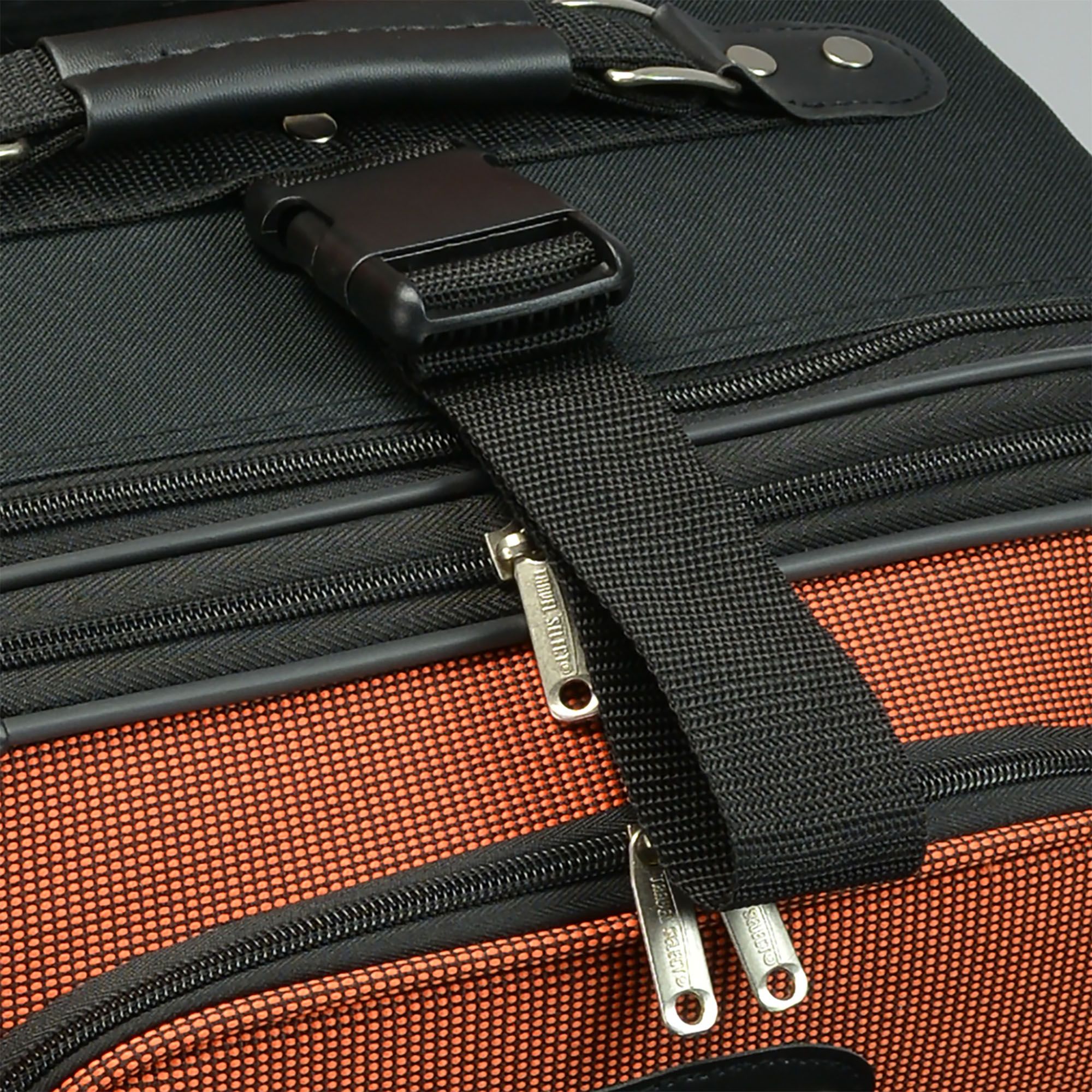This 4-piece luggage set in orange is crafted from polyester material for style and durability. The spacious main compartment expands to offer 25% more packing space, while shoes and important items are kept separated with a large, zippered mesh lid pocket and dual shoe pockets. Pulling heavy luggage is made easier with the push-button interior retractable handle.