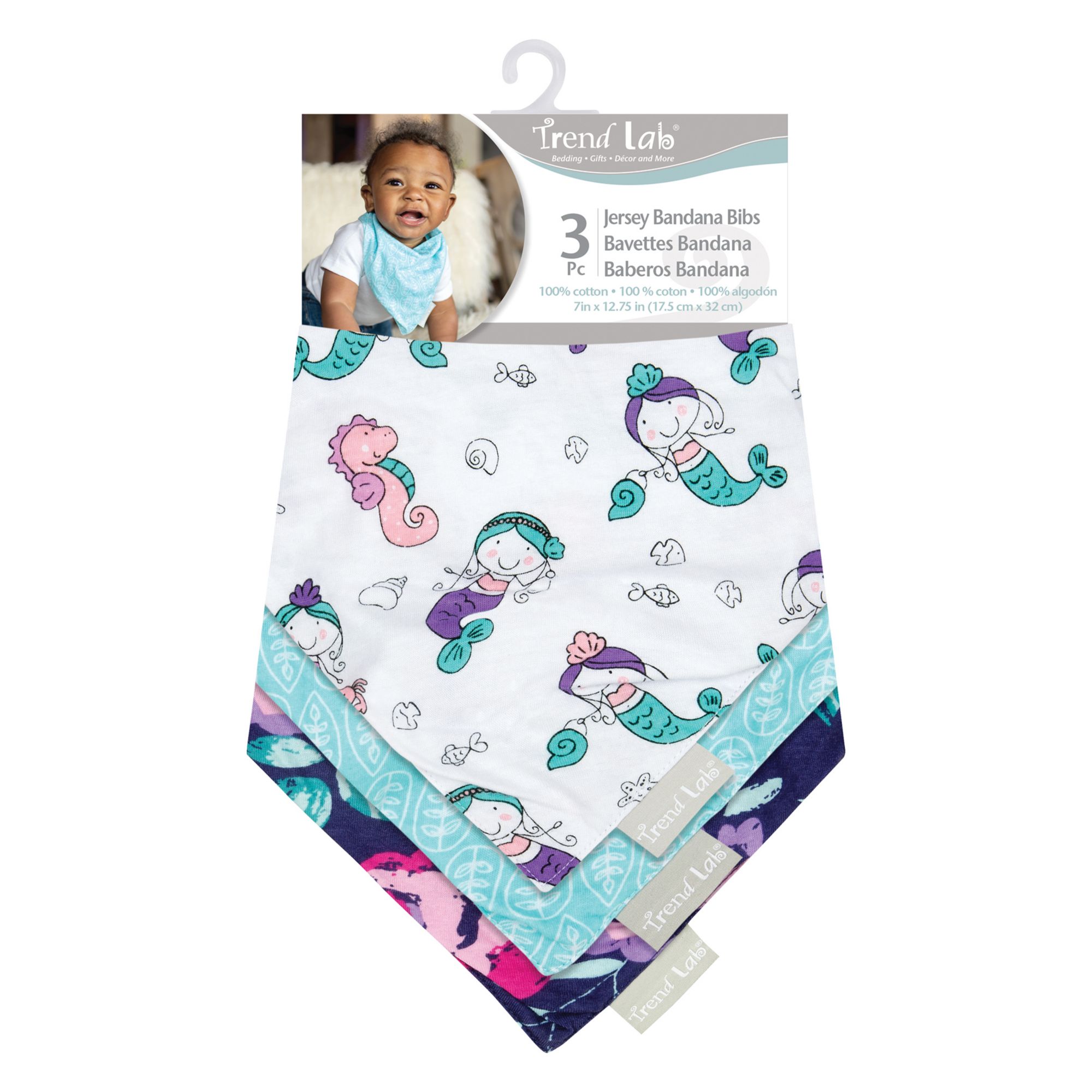 Feed your baby in style with this Mermaids Jersey 6 pk. Bib & Burp Cloth Set from Trend Lab. The pack includes three reversible bibs and three multi-layered burp cloths to keep messes to a minimum. These absorbent, multi-use 100% cotton jersey bibs and burp cloths are perfect for feeding and drooling babies.