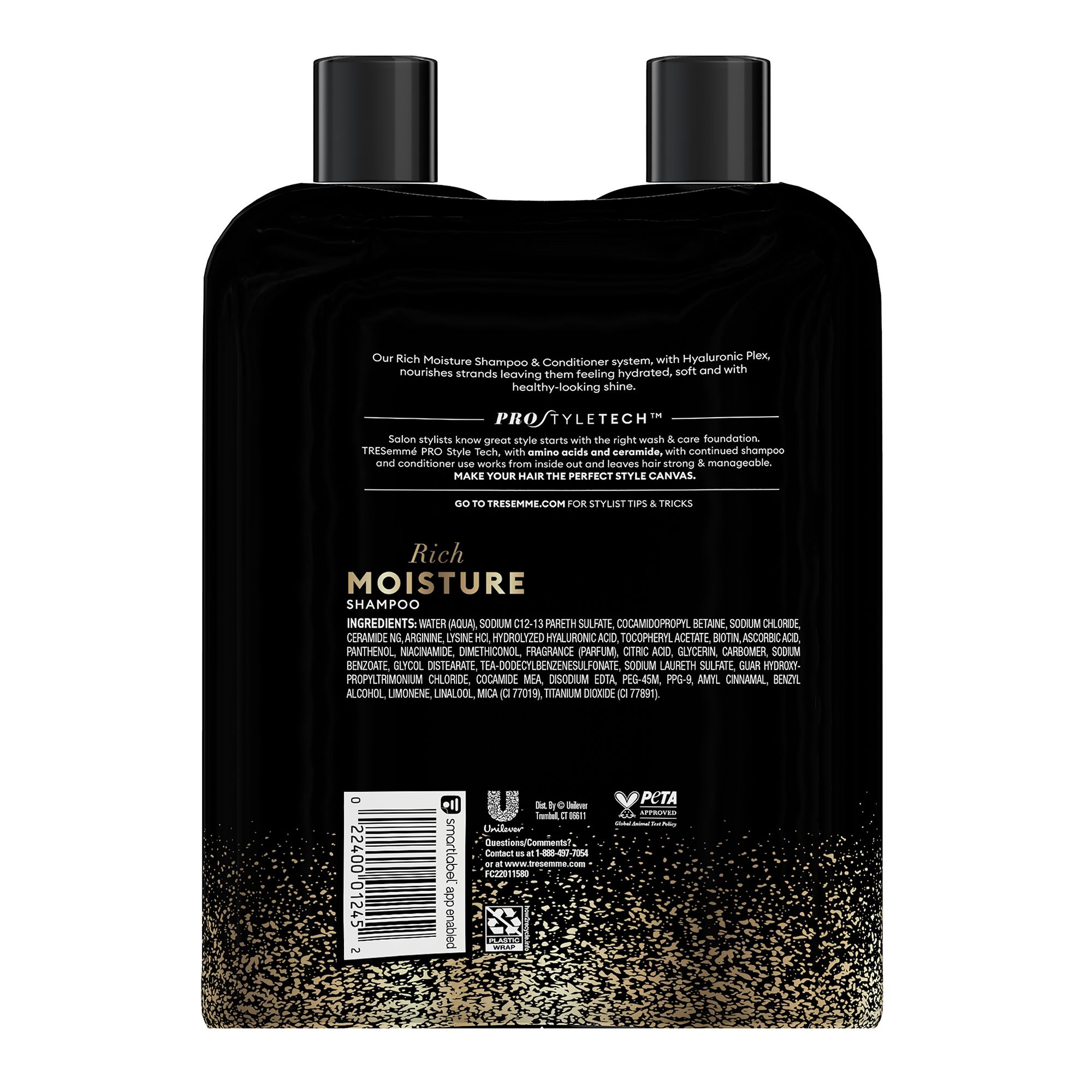 Moisture rich system: TRESemmé Rich Moisture Shampoo for Dry Hair, with Hyaluronic Plex, nourishes strands leaving them feeling hydrated, soft and with healthy-looking shine Pro style technology: Formulated with amino acids & ceramide, this salon-level technology makes hair 3x stronger and more manageable (vs. a non-conditioning shampoo) with continuous use 7x luxurious moisture: This hydrating shampoo delivers 7x more luxurious moisture, when used as a system versus a non-conditioning shampoo, to leave your hair feeling soft, beautiful, and healthy Trusted ingredients: This TRESemmé shampoo is PETA-approved and is free from parabens, mineral oils, and DMDM hydantoin Hair care tips from our stylists: Follow with TRESemmé Rich Moisture Conditioner to achieve touchably soft hair that's still full of natural movement Includes two 28 oz. shampoo bottles