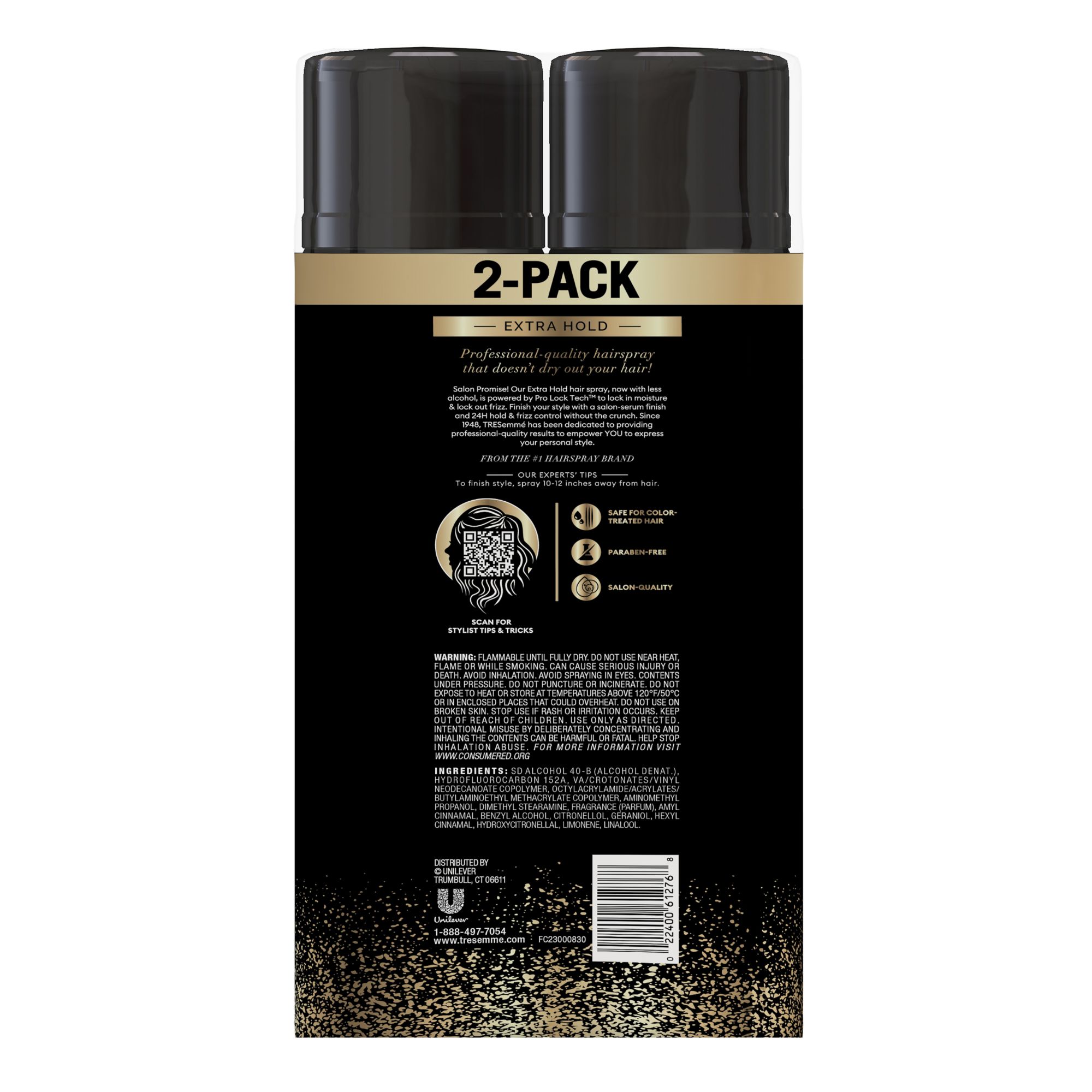 Need a flexible, anti-frizz hairspray with a hold that really lasts? TRESemme TRES Two Extra Hold Hair Spray for extra flyaway control gives you maximum hold on everything from elaborate to everyday hairstyles. It can take time to style your hair, so it’s essential to secure your look in place with hair styling products that provide a strong but flexible hold. A water-free formula, Extra Hold hairspray is a humidity-resistant hair spray that provides frizz control with all the grip you need for a hairstyle that will last the whole day. For best results, create your style using your favorite TRESemme shampoo, conditioner, and hair styling products. With your style in place, finish with Extra Hold Hair Spray - shake well, and hold the hairspray 10-12 inches away from hair. Spray section by section. For an even stronger hold, layer more hairspray exactly where you need more control. For maximum body and fullness, flip hair upside down and spray all over. If dispenser clogs, rinse in warm water. Ever since their origin in salons, TRESemme has been driven by a simple truth: every woman deserves to look and feel fabulous, like they’ve just stepped out of the salon. TRESemme is dedicated to creating hair care and styling products that are salon quality without the salon price, promoting the values that defined their inspirational founder, Edna L. Emme - independence, self-reliance, and, most importantly, the confidence you need to step up and meet the next challenge.