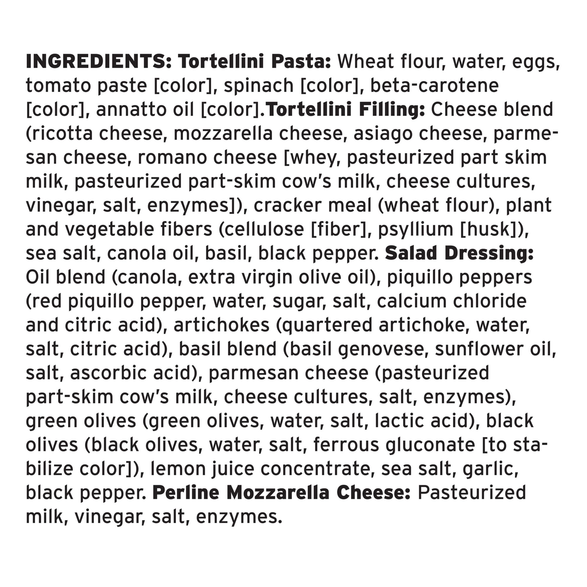 Ingredients: Tortellini Pasta: Wheat Flour, Water, Eggs, Tomato Paste [Color], Spinach [Color], Beta-carotene [Color], Annatto Oil [Color]. Tortellini Filling: Cheese Blend (Ricotta Cheese, Mozzarella Cheese, Asiago Cheese, Parmesan Cheese, Romano Cheese [Whey, Pasteurized Part Skim Milk, Pasteurized Part-skim Cow’s Milk, Cheese Cultures, Vinegar, Salt, Enzymes]), Cracker Meal (Wheat Flour), Plant And Vegetable Fibers (Cellulose [Fiber], Psyllium [Husk]), Sea Salt, Canola Oil, Basil, Black Pepper. Salad Dressing: Oil Blend (Canola, Extra Virgin Olive Oil), Piquillo Peppers (Red Piquillo Pepper, Water, Sugar, Salt, Calcium Chloride And Citric Acid), Basil Blend (Basil Genovese, Sunflower Oil, Salt, Ascorbic Acid), Artichokes (Quartered Artichoke, Water, Salt, Citric Acid), Parmesan Cheese (Pasteurized Part-skim Cow’s Milk, Cheese Cultures, Salt, Enzymes), Green Olives (Green Olives, Water, Salt, Lactic Acid), Black Olives (Black Olives, Water, Salt, Ferrous Gluconate [To Stabilize Color]), Lemon Juice Concentrate, Sea Salt, Garlic, Black Pepper. Perline Mozzarella Cheese: Pasteurized Milk, Vinegar, Salt, Enzymes. Contains: Wheat, Milk & Eggs.