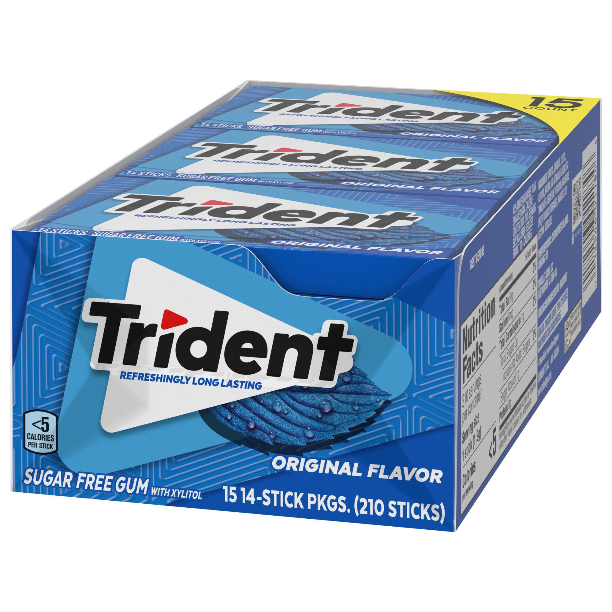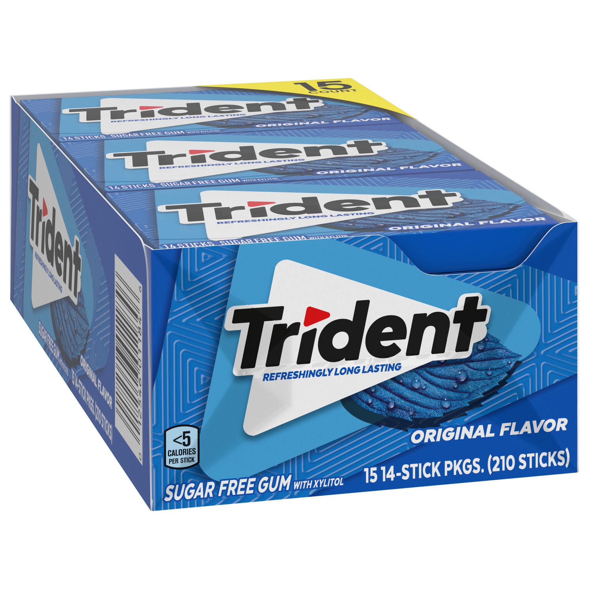 Trident Original Flavor Sugar Free Gum is a delicious way to freshen breath and protect your teeth. With 30% fewer calories than sugared gum, Trident Original gum is sweetened with xylitol, a naturally occurring sugar alcohol. Trident Original combines the flavors of peppermint and cinnamon gum for a unique, refreshing flavor. The ADA Council on Scientific Affairs found that the physical of chewing Trident sugarless gum for 20 minutes after eating stimulates saliva flow which helps to prevent cavities by reducing plaque acids and strengthening teeth. Bulk gum packs give you plenty to stock your company or small business, and each individual pack is designed so the gum stays inside, making it easy to toss in your car, backpack or desk drawer. These sticks of gum are individually wrapped for freshness.