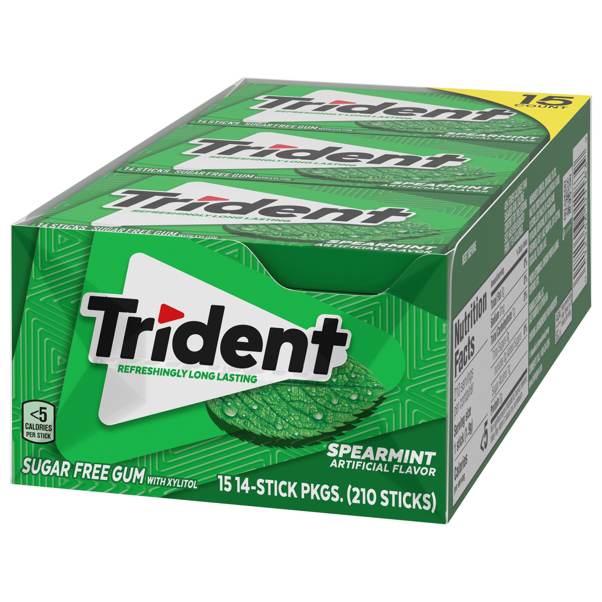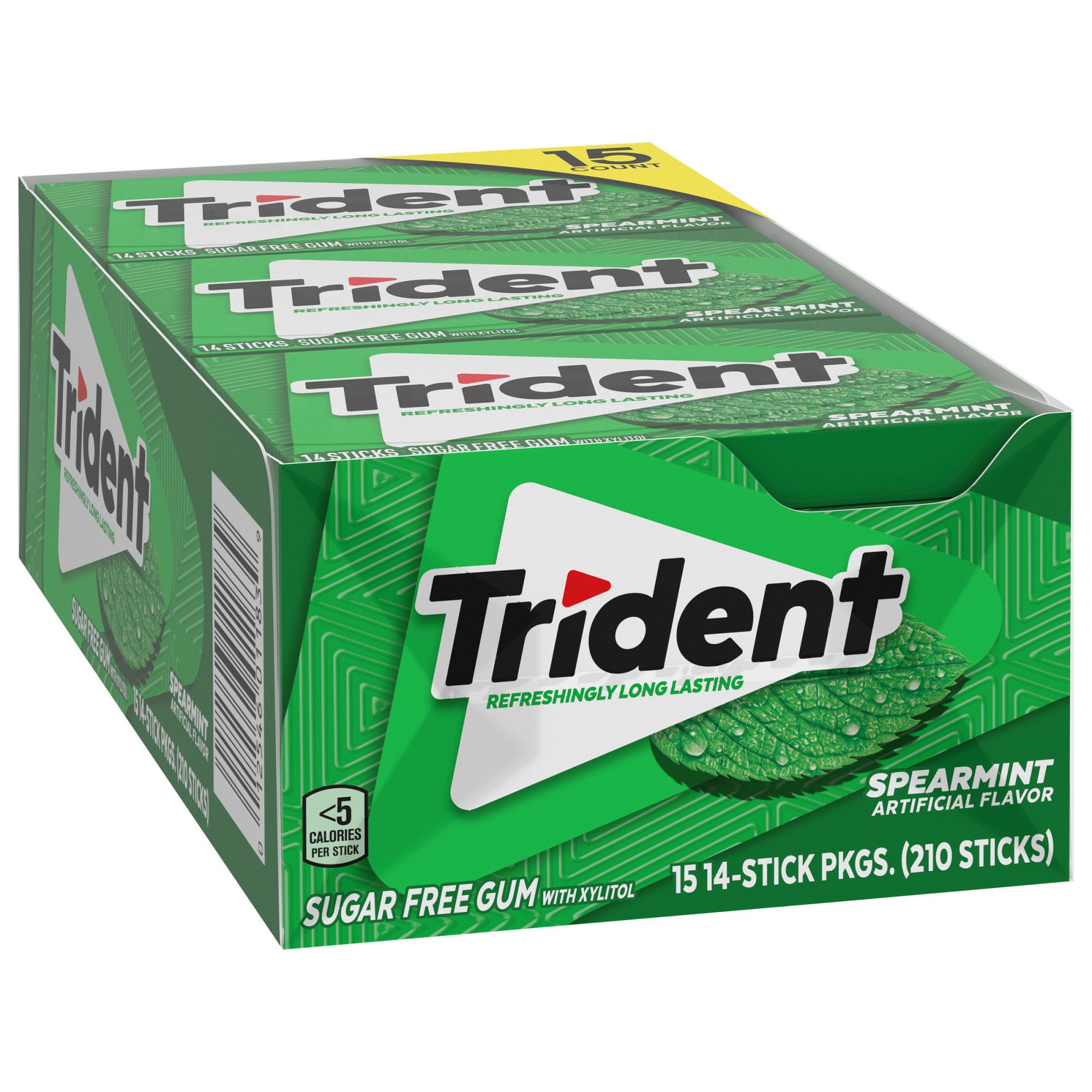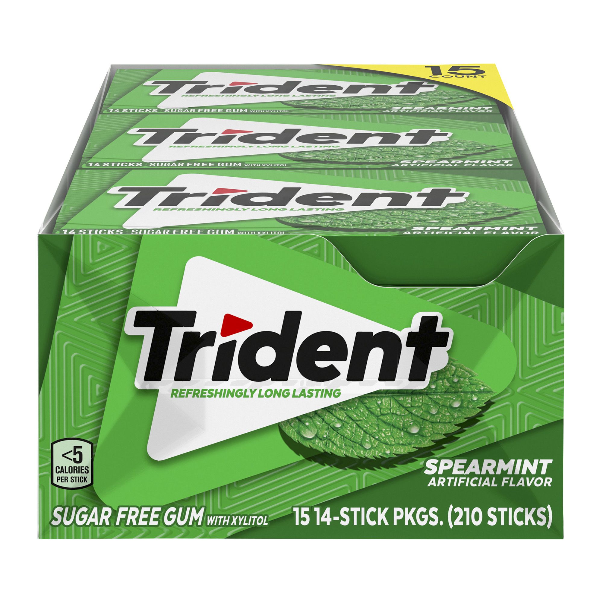 Trident Spearmint Flavor Sugar Free Gum is a delicious way to freshen breath and protect your teeth. With 30% fewer calories than sugared gum, this mint gum is sweetened with xylitol, a naturally occurring sugar alcohol. ADA Accepted, the simple action of chewing Trident sugarless gum for 20 minutes after eating stimulates saliva flow which helps to prevent cavities by reducing plaque acids and strengthening teeth. Get close-up confidence with Trident sugar free gum, the easy way to freshen breath and help protect against tooth decay. Pop a piece for a long-lasting burst of flavor. Each package of Spearmint sugar free bulk gum contains 15 individual packs to stock your company or small business. Each pack is designed so the pieces of gum stay inside, making it easy to toss in your car, backpack or desk drawer, so you're ready to freshen breath wherever you are. Trident chewing gum is also great for vending machines, so add this value pack to your stock of vending machine snacks and other vending foods. Also ideal for bulk vending, place these individual packs of gum at the checkout area of convenience stores, concession stands or food service stations to give patrons an easy way to freshen breath.