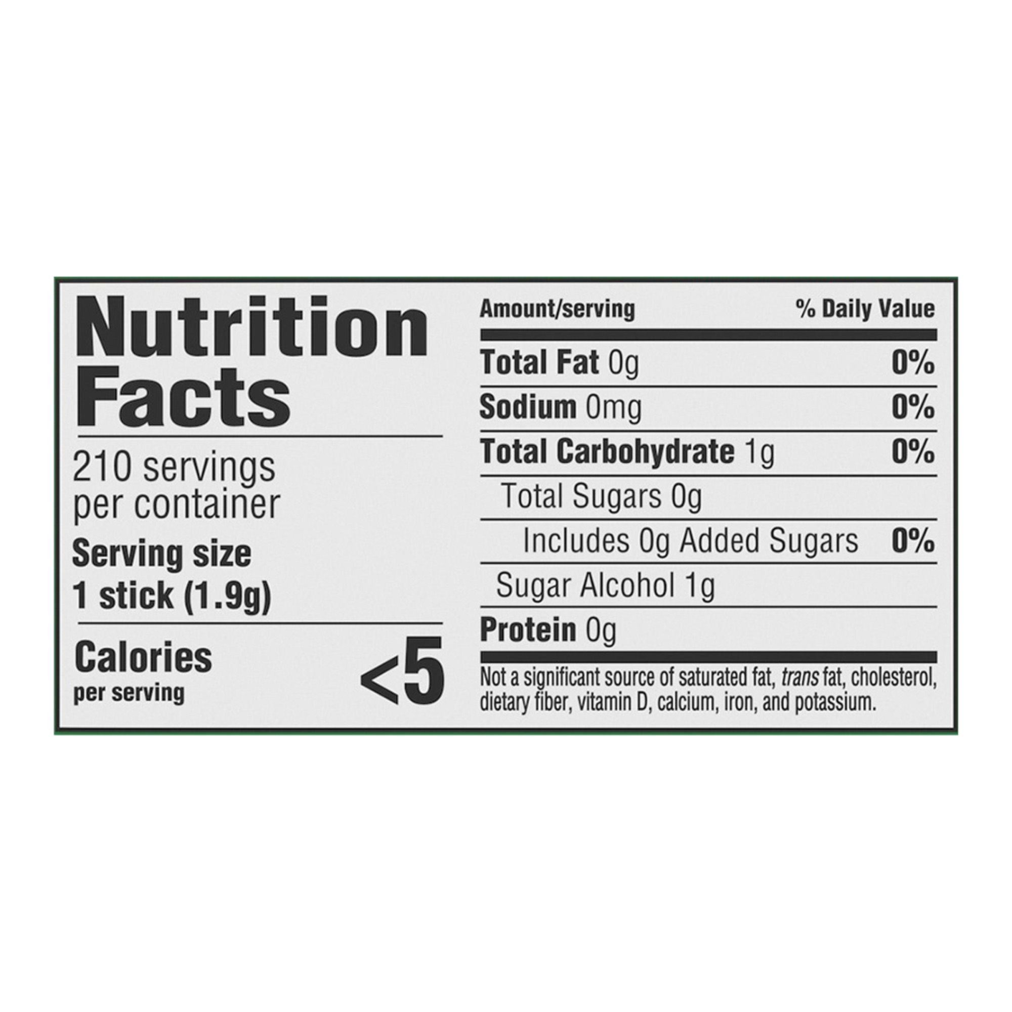 Ingredients: Sorbitol, Gum Base, Xylitol, Maltitol Syrup, Natural And Artificial Flavor, Glycerin; Less Than 2% Of: Acesulfame Potassium, Aspartame, BHT (To Maintain Freshness), Blue 1 Lake, Mannitol, Soy Lecithin, Sucralose, Yellow 5 Lake.