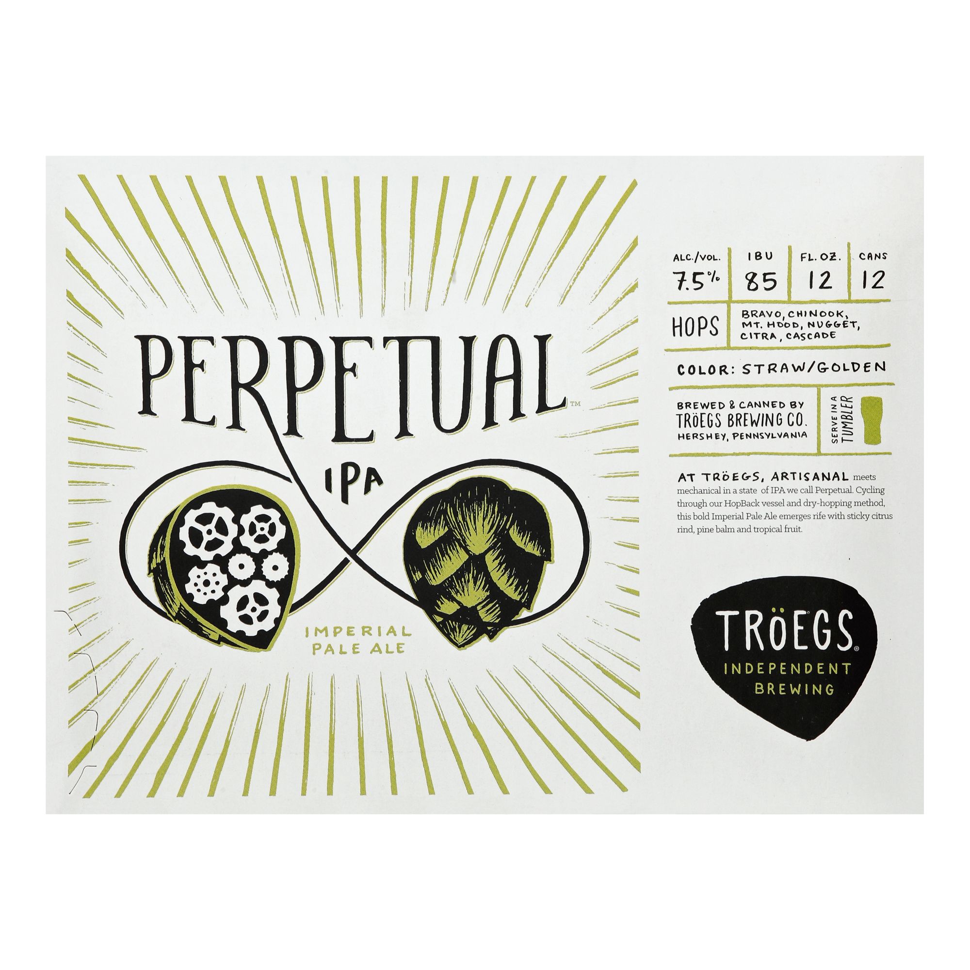 Imperial pale ale. IBU: 85. Hops: Bravo, Chinook, Mt. Hood, Nugget, Citra, Cascade. Color: Straw/golden. Serve in a tumbler. At Troegs, artisanal meets mechanical in a state of IPA they call Perpetual. Cycling through their HopBack vessel and dry-hopping method, this bold Imperial Pale Ale emerges rife with sticky citrus rind, pine balm and tropical fruit. Handcrafted by the Troegs Bros. When they were kids, the Troegs bros would always ask, why not? Today, as unsupervised adults-turned-brewers, their endless experimenting has taken on a delicious bent. If life wanders you into Central Pennsylvania, come join Troegs for their latest why not? Troegs.com. Twitter at TroegsBeer. Instagram at TroegsBeer. Facebook/TroegsBrewingCo. Out of curiosity. 7.5 alc/vol. Brewed & Canned by: Troegs Brewing Co. Hershey, Pennsylvania. Proudly brewed in Pennsylvania.