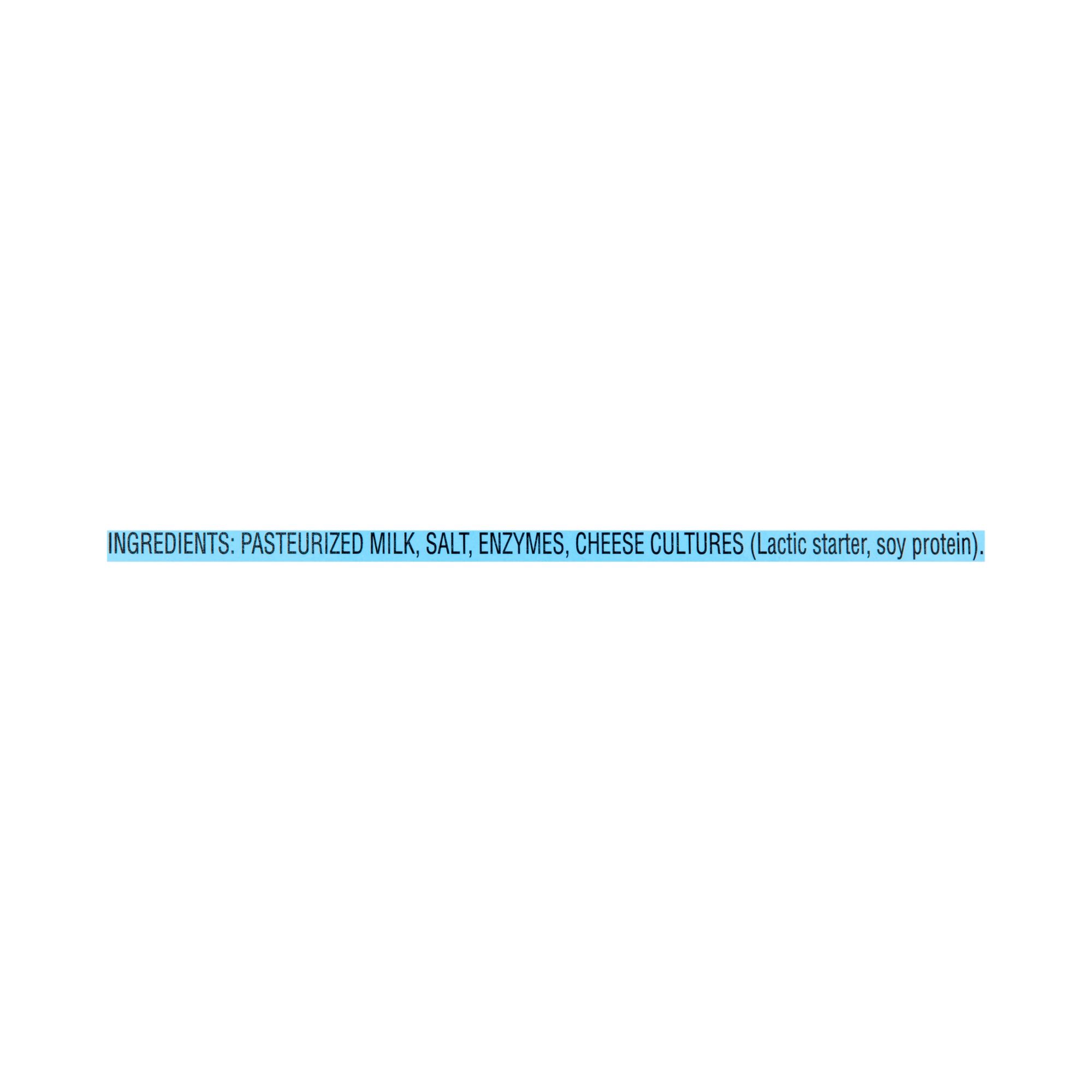 Ingredients: Pasteurized Milk, Salt, Enzymes, Cheese Cultures (Lactic Starter, Soy Protein).
