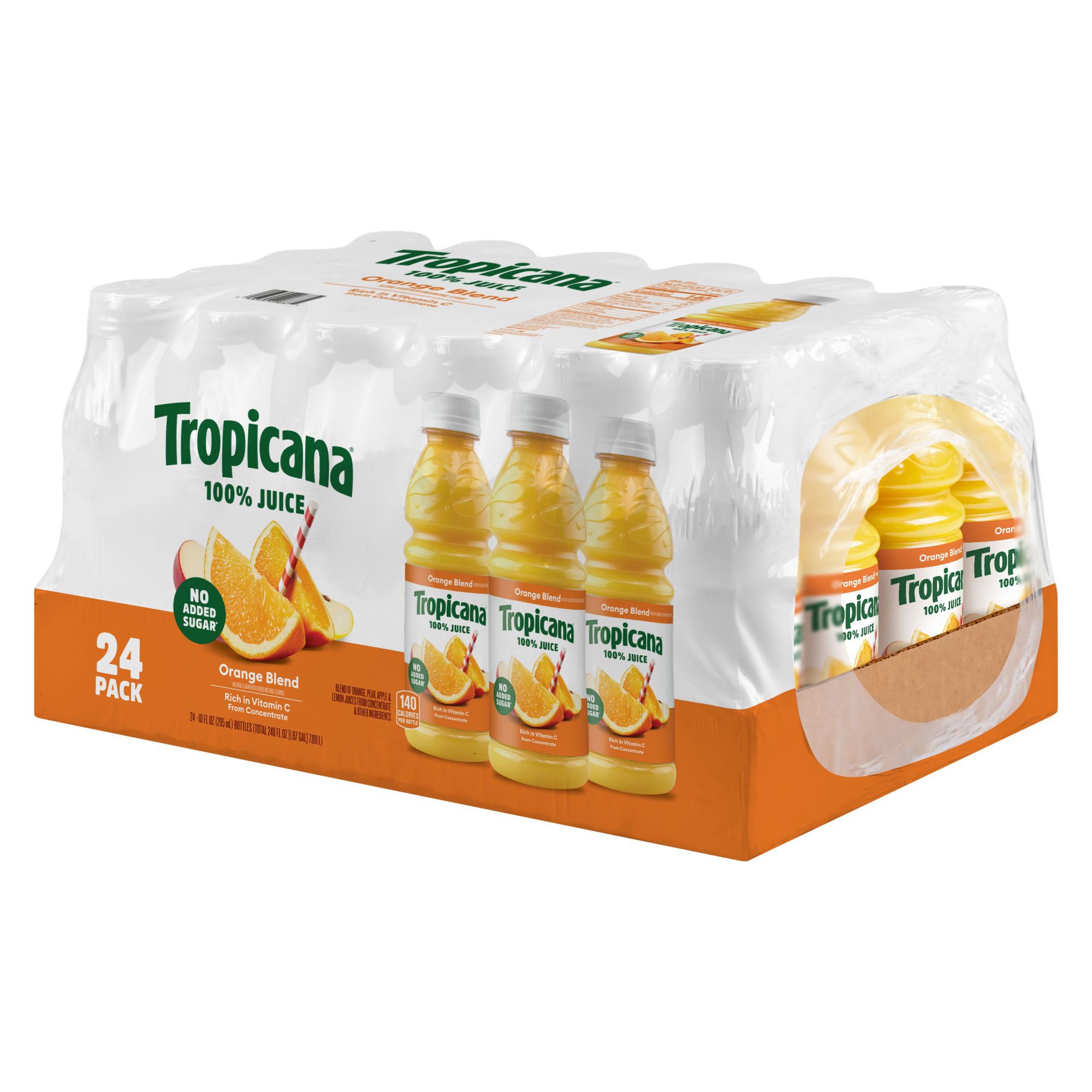 Experience the taste of OJ anytime, anywhere with Tropicana 100% Juice Orange Blend. Bursting with bold flavor, this refreshing fruit juice is made with a mix of orange juice, pear juice, apple juice, and lemon juice from concentrate. Each single-serve bottle is rich in Vitamin C, helping support your immune system with every sip. Made with natural flavors and no added sugar,* it delivers real fruit flavor with just the right amount of sweetness. The mini orange juice bottles are pasteurized and shelf-stable, making them easy to store in your pantry or take on the go. Deliciously portable, these small juice bottles are conveniently sized for stashing in lunchboxes, backpacks, and coolers. Enjoy them as quick breakfast drinks on busy mornings, pack them in school lunches as a convenient kid's juice option, or use them as cocktail mixers for mimosas, screwdrivers, and more. In addition to Orange Blend, Tropicana single-serve juice bottles are also available in Apple, Cranberry, Grapefruit, and more. Bring a bit of brightness to your day with Tropicana Fruit Juices. (*Not a low calorie food. See nutritional panel for information on sugar and calorie content.)