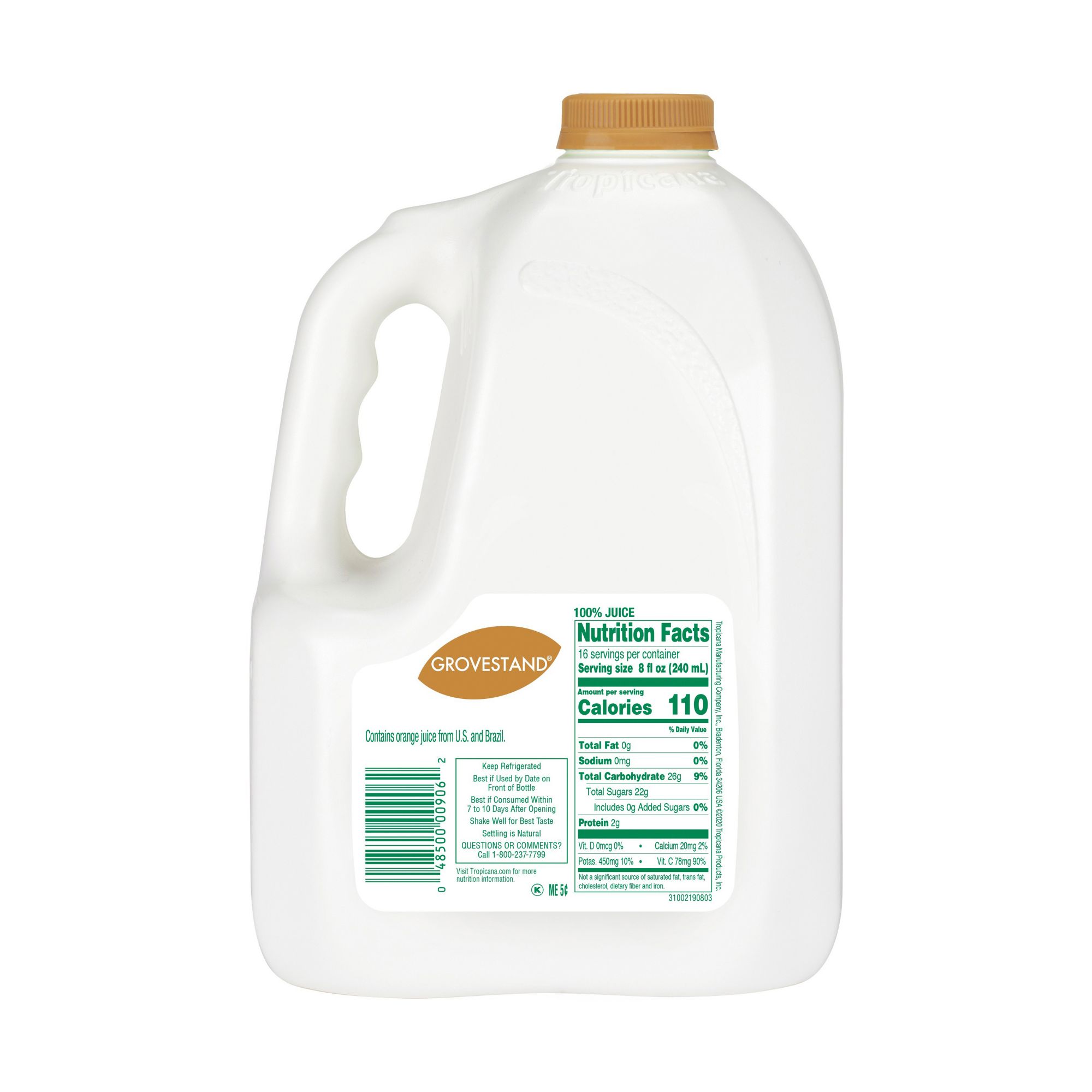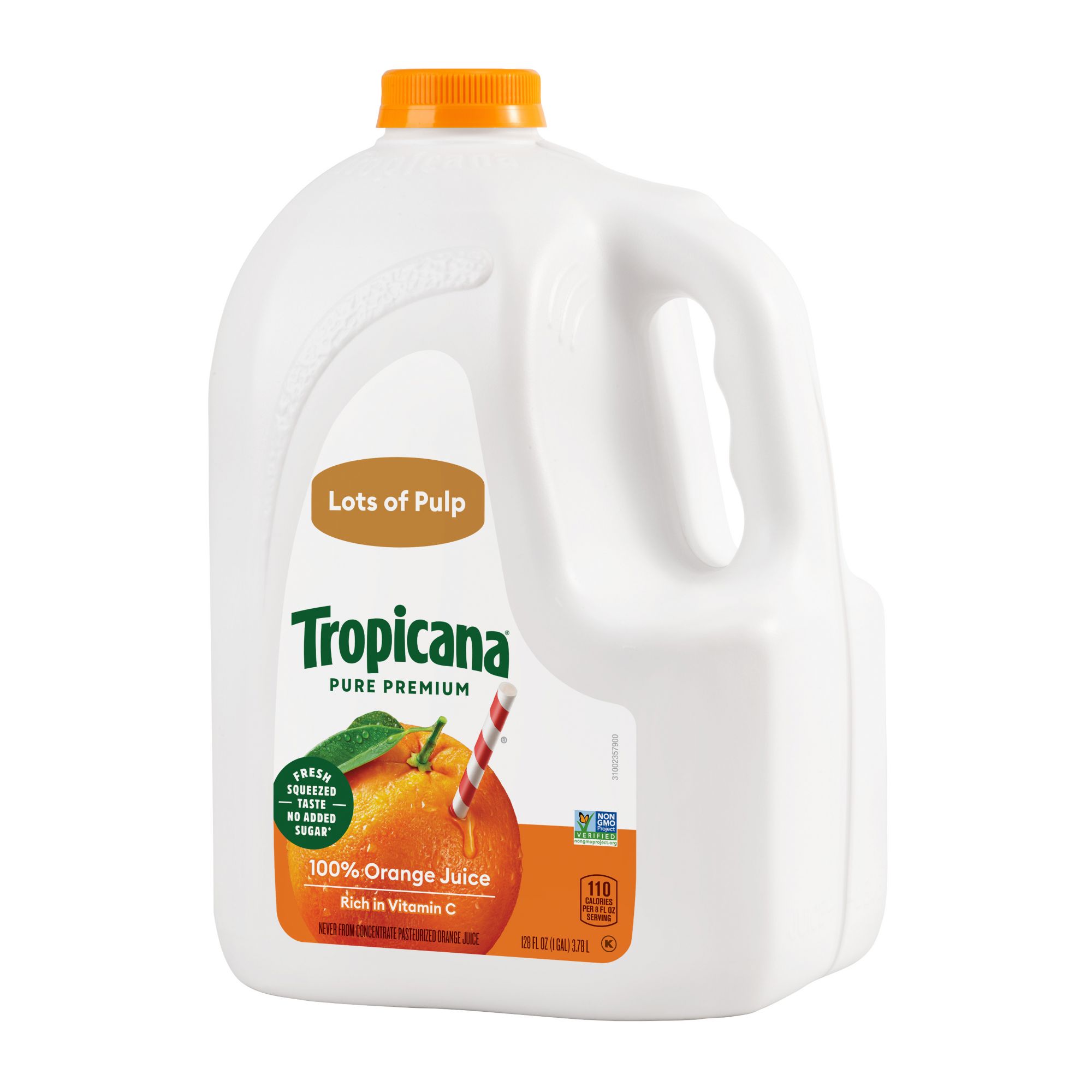 100% orange juice Lots of pulp, 100% pure and natural Never from concentrate Kosher Includes 128 fl. oz. Jug