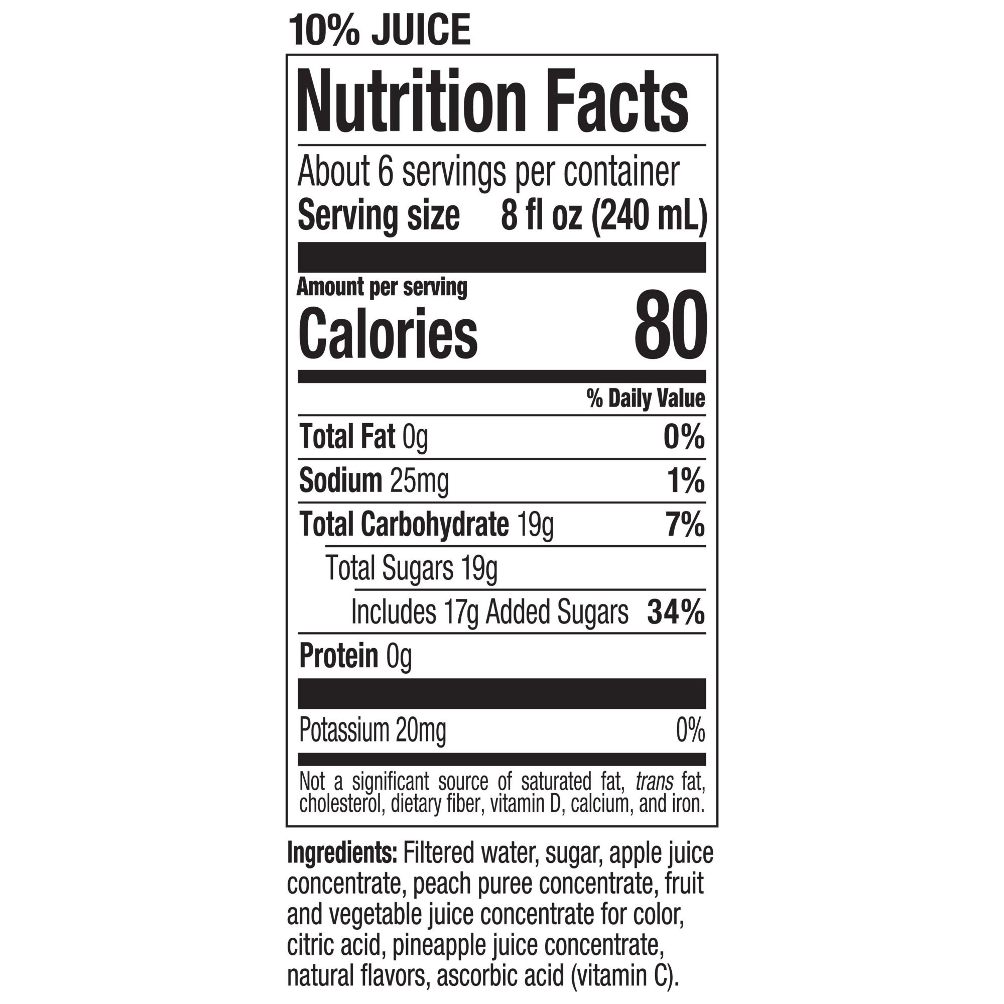 Ingredients: Filtered Water, Sugar, Apple Juice Concentrate, Peach Puree Concentrate, Fruit And Vegetable Juice Concentrate For Color, Citric Acid, Pineapple Juice Concentrate, Natural Flavors, Ascorbic Acid (Vitamin C).