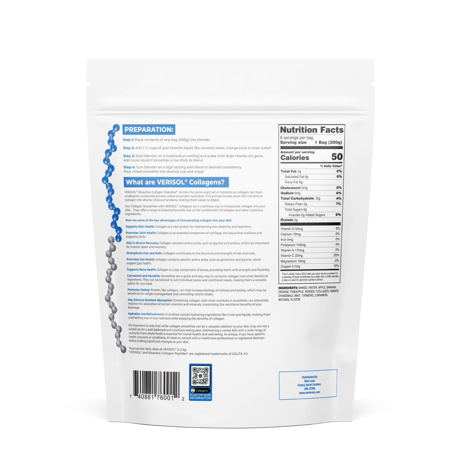 Collagen Smoothie made with mango, apple, banana, orange, pineapple, Verisol collagen, ginger, chamomile, mint, turmeric, cinnamon, natural flavor