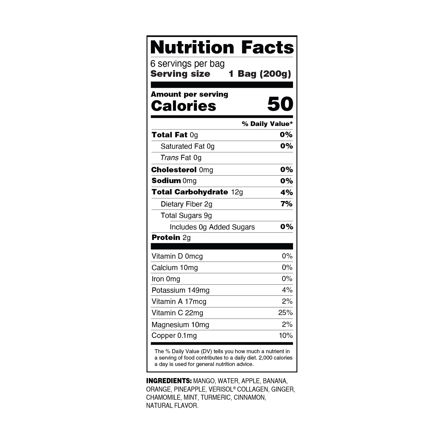 Ingredients: Mango, Apple, Banana, Orange, Pineapple, Verisol Collagen, Ginger, Chamomile, Mint, Turmeric, Cinnamon, Natural Flavor.