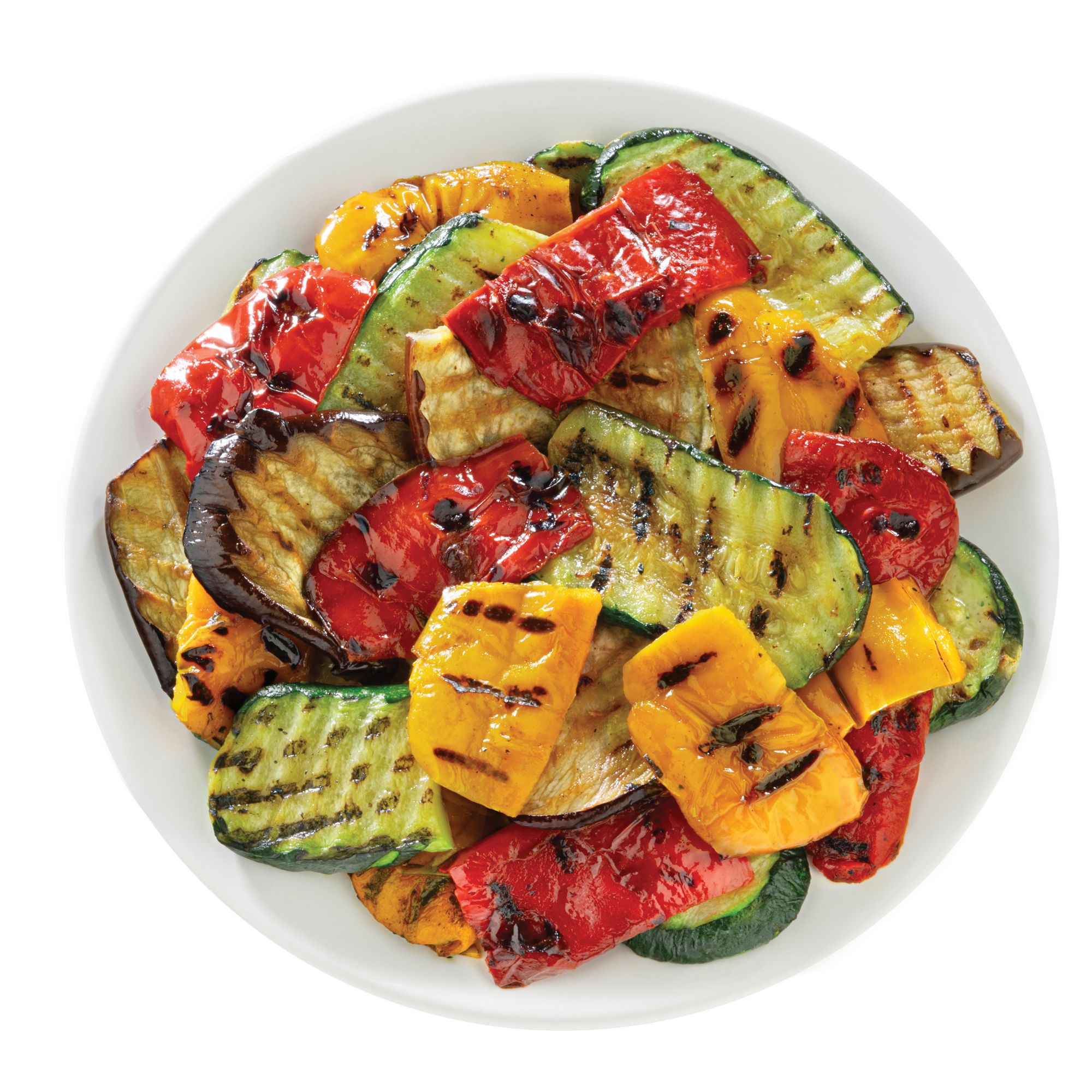 Organic grilled yellow peppers, organic grilled red peppers, organic grilled eggplant, organic grilled zucchini