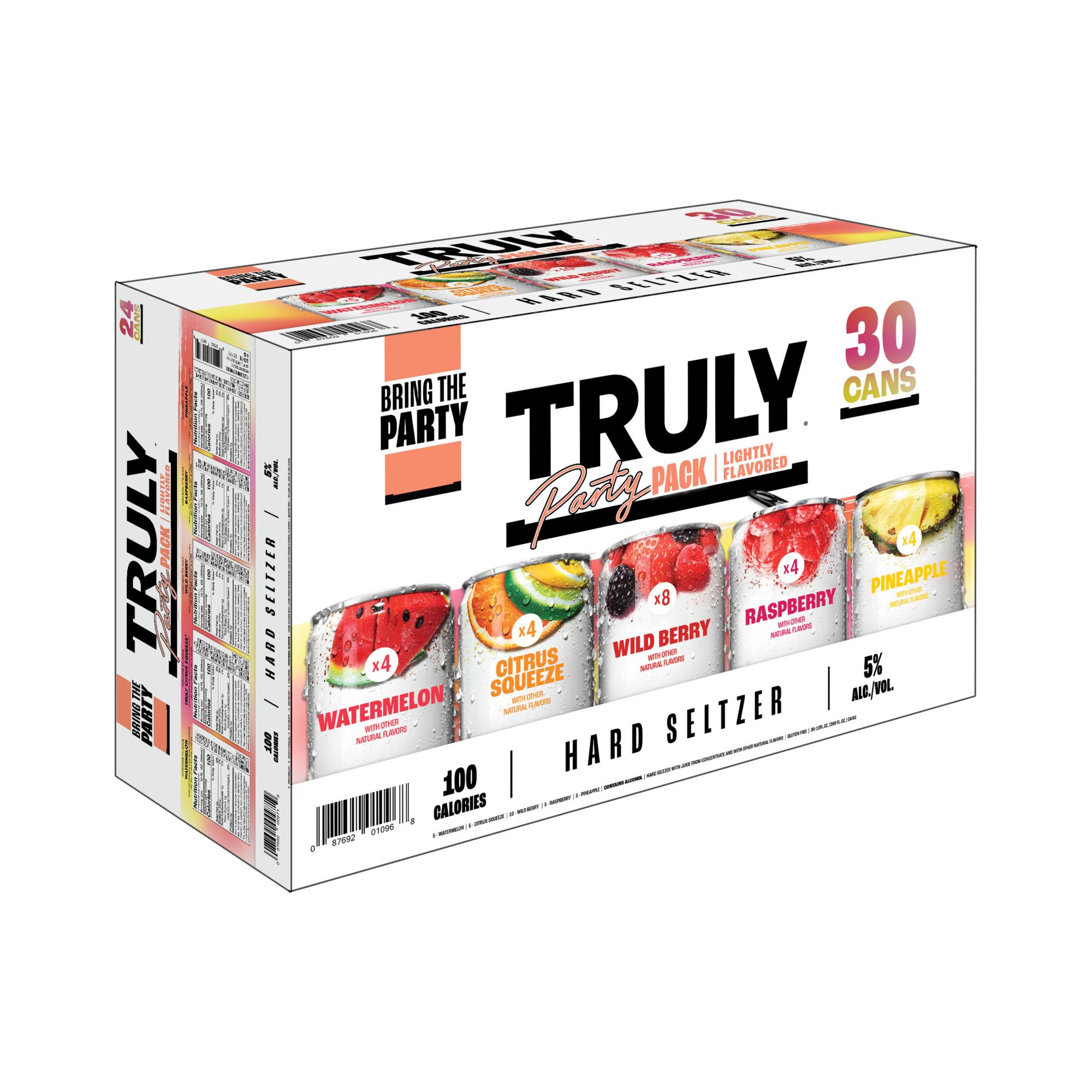 Introducing the new Truly Party Pack - a new variety pack that combines all their most popular flavors into one convenient 30 pack. Truly knows how tough it is to buy alcohol for a crowd, so Truly just made your job a whole lot easier. This brand-new variety pack features classic, fan-favorite flavors: Wild Berry, Watermelon, Citrus Squeeze, Pineapple and new Raspberry! With a flavor for everyone, the Truly Party Pack takes the second guessing out of your shopping trip. Pick up this exciting new mix pack for your friends and family and get the party started. Each 12 ounce can has 100 calories, 5% ABV and 1g sugars for refreshment that won’t weigh you down. Variety 30 pack, 12 fluid ounce cans.