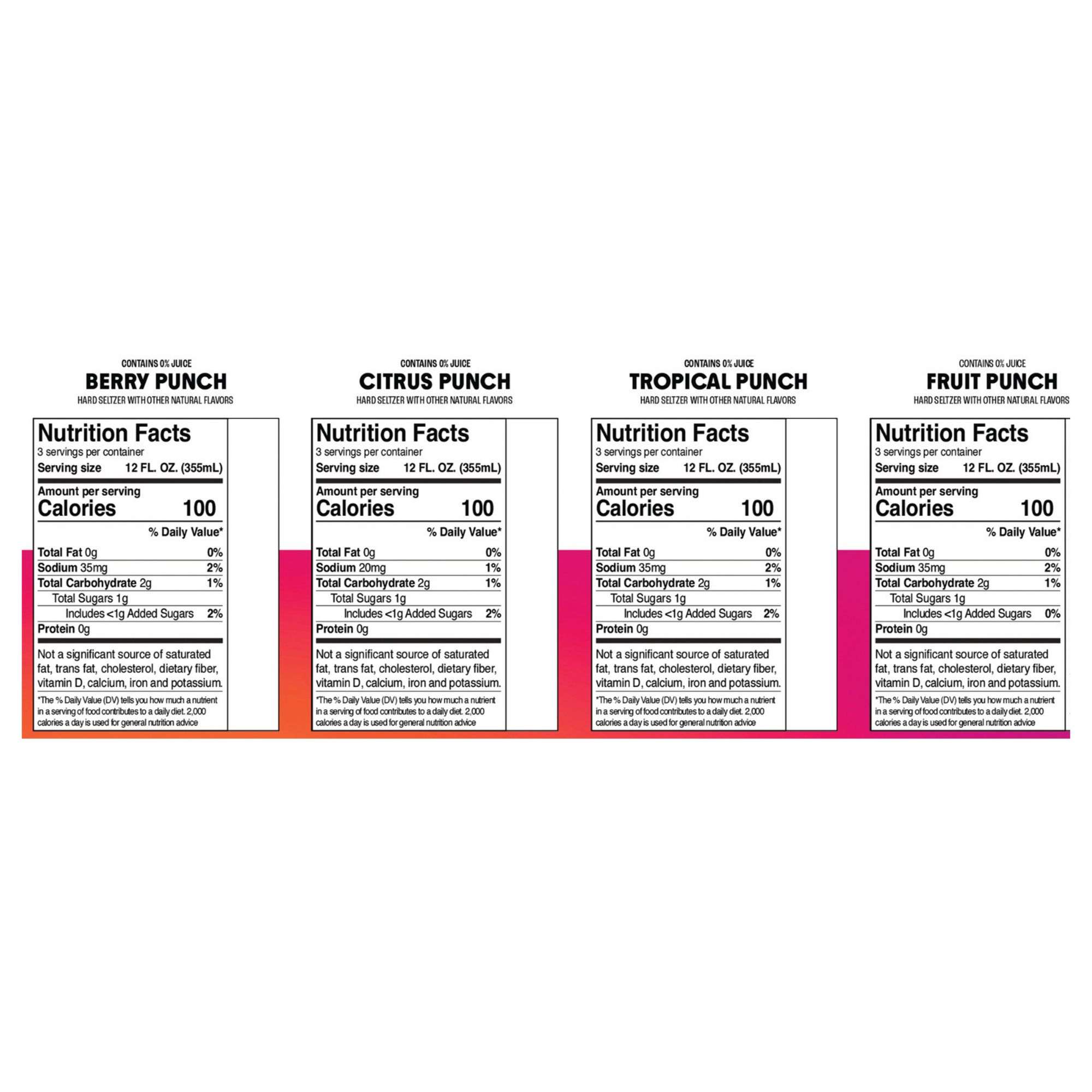 Ingredients: Berry Punch: Filtered Water, Alcohol, Natural Flavors, Contains Less than 2% of Citric Acid, Cane Sugar, Sodium Citrate, Sucralose, Fruit and Vegetable Juice (Color), Acesulfame Potassium. Citrus Punch: Filtered Water, Alcohol, Natural Flavors, Contains Less than 2% of Citric Acid, Cane Sugar, Sodium Citrate, Sucralose, Acesulfame Potassium. Tropical Punch: Filtered Water, Alcohol, Natural Flavors, Contains Less than 2% of Citric Acid, Cane Sugar, Sodium Citrate, Sucralose, Acesulfame Potassium. Fruit Punch: Filtered Water, Alcohol, Natural Flavors, Contains Less than 2% of Citric Acid, Cane Sugar, Sodium Citrate, Sucralose, Fruit and Vegetable Juice (Color), Acesulfame Potassium.