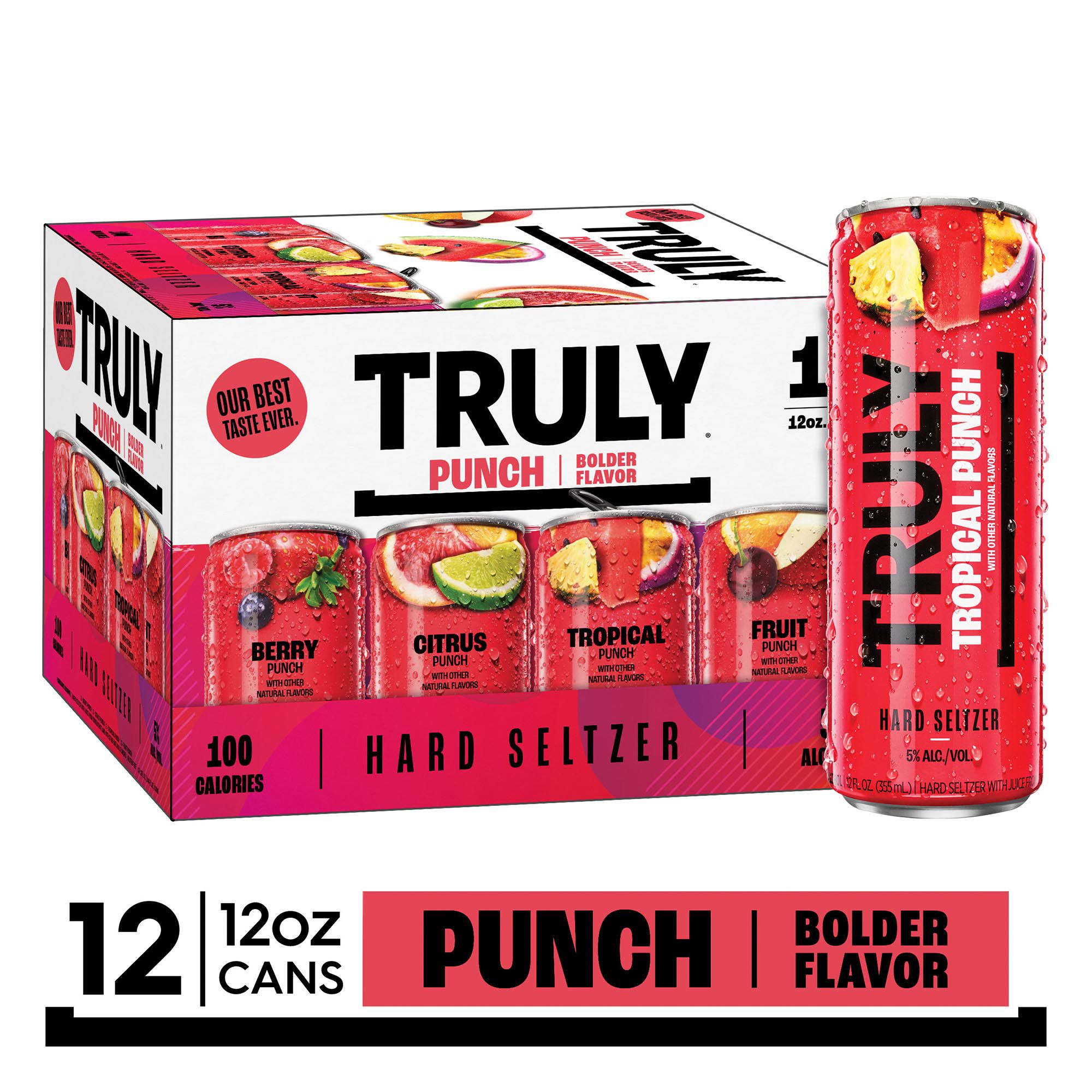 Truly Punch Hard Seltzer is an explosion of fruit flavor that is all about big flavor and big refreshment. Truly Punch styles are unique mashups of some of your favorite fruits and come in four unique flavors: Fruit Punch, Berry Punch, Citrus Punch and Tropical Punch. Each 12 oz. can of Truly has 5% alc./vol., 100 calories and 1g sugars for refreshment that won’t weigh you down. Three 12 oz. cans of each flavor. Variety 12 pk., 12 fl. oz. cans. Gluten free.