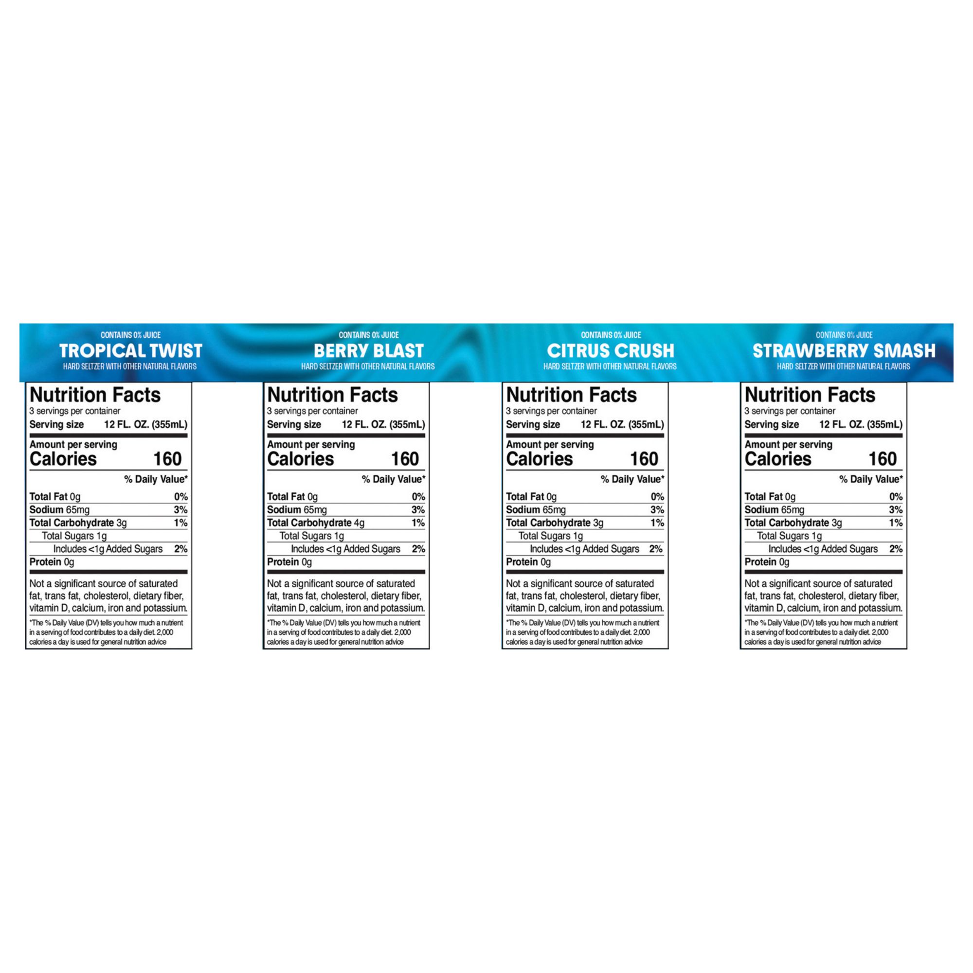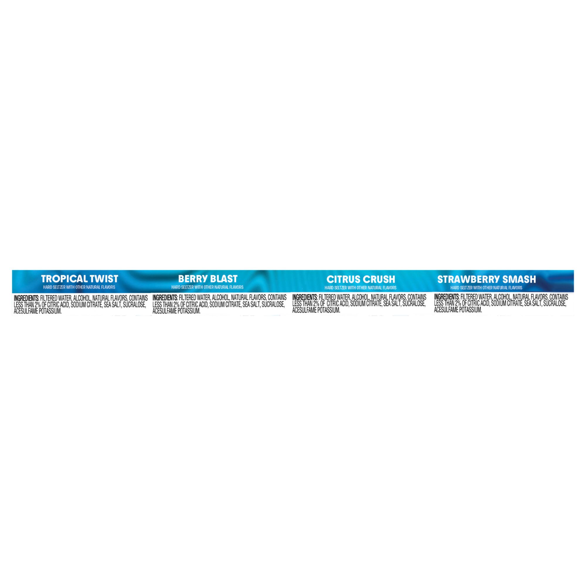 Ingredients: Tropical Twist: Filtered Water, Alcohol, Natural Flavors, Contains Less than 2% of Citric Acid, Sodium Citrate, Sea Salt, Sucralose, Acesulfame Potassium. Berry Blast: Filtered Water, Alcohol, Natural Flavors, Contains Less than 2% of Citric Acid, Sodium Citrate, Sea Salt, Sucralose, Acesulfame Potassium. Citrus Crush: Filtered Water, Alcohol, Natural Flavors, Contains Less than 2% of Citric Acid, Sodium Citrate, Sea Salt, Sucralose, Acesulfame Potassium. Strawberry Smash: Filtered Water, Alcohol, Natural Flavors, Contains Less than 2% of Citric Acid, Sodium Citrate, Sea Salt, Sucralose, Acesulfame Potassium.