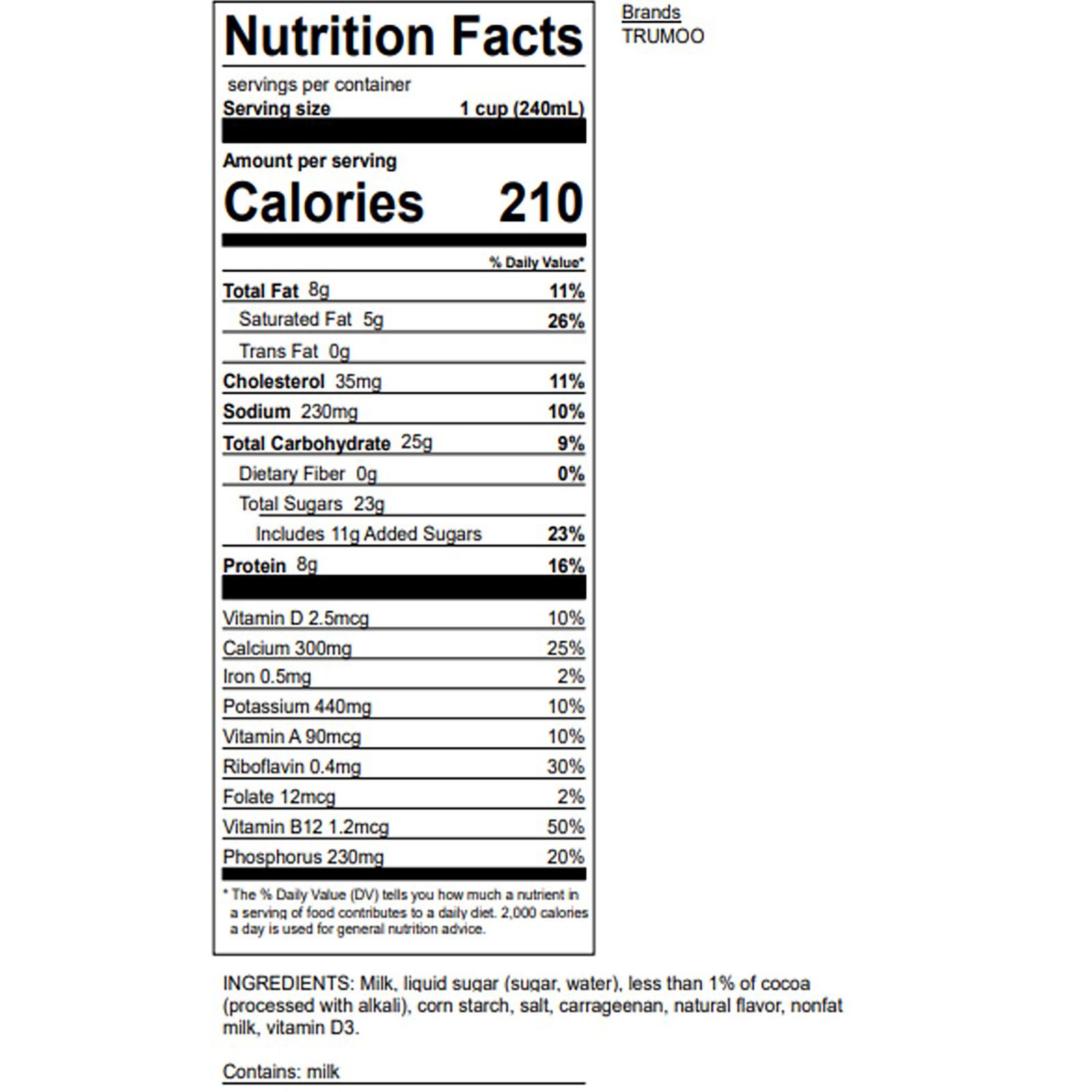 Ingredients: Whole Milk, Liquid Sugar (Sugar, Water), Cocoa (Processed With Alkali), Cornstarch, Salt, Carrageenan, Natural Flavor, Vitamin A Palmitate, Vitamin D3.