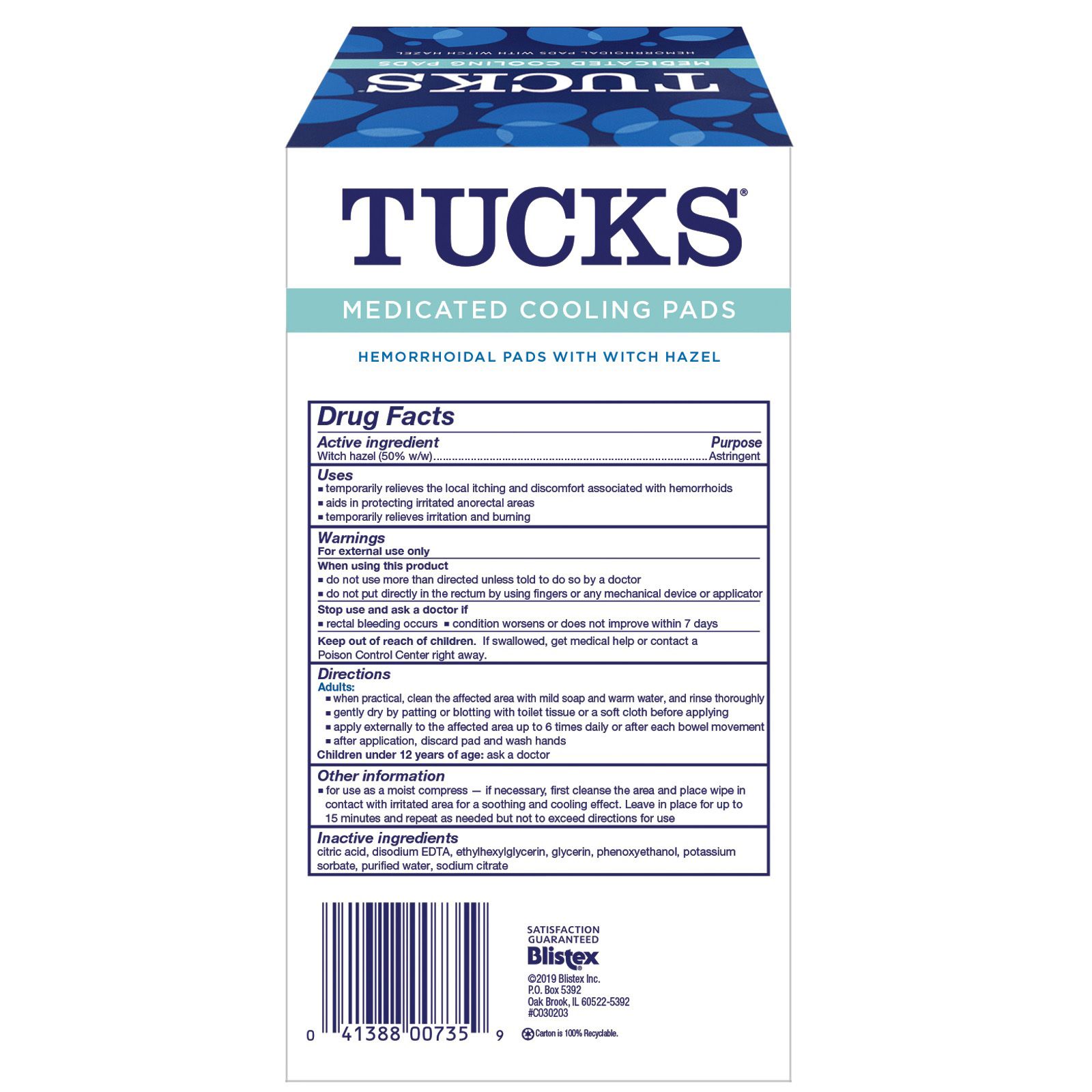 Tucks Medicated Cooling Pads provide immediate relief from the burning and itching caused by hemorrhoids. They contain witch hazel to soothe and protect irritated areas.
