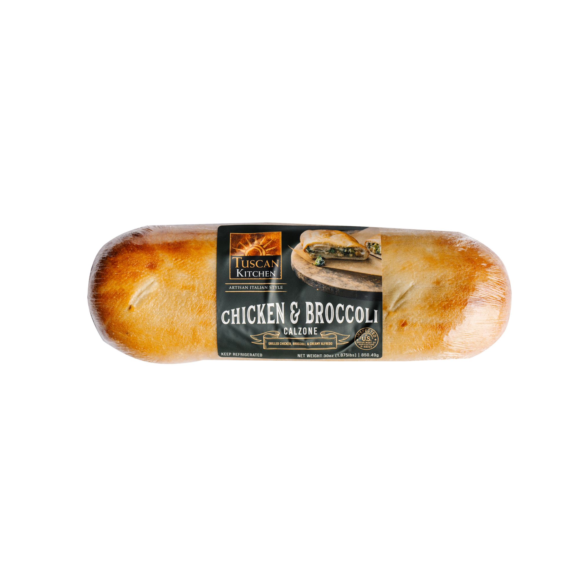 The Tuscan Kitchen Chicken Broccoli Calzone is made from artisan bread filled with fully cooked seasoned chicken strips, artisan white sauce, spices and mozzarella cheese. The great attribute of this calzone is that it cooks up in as little as 15 minutes but tastes like it was baked fresh from scratch in your own kitchen!