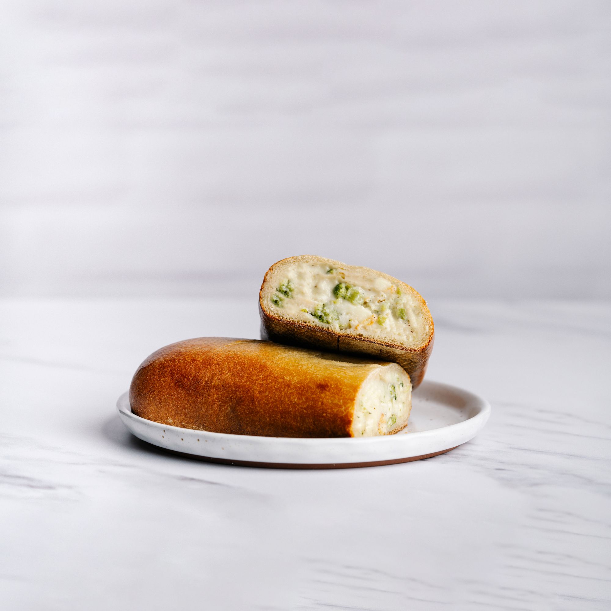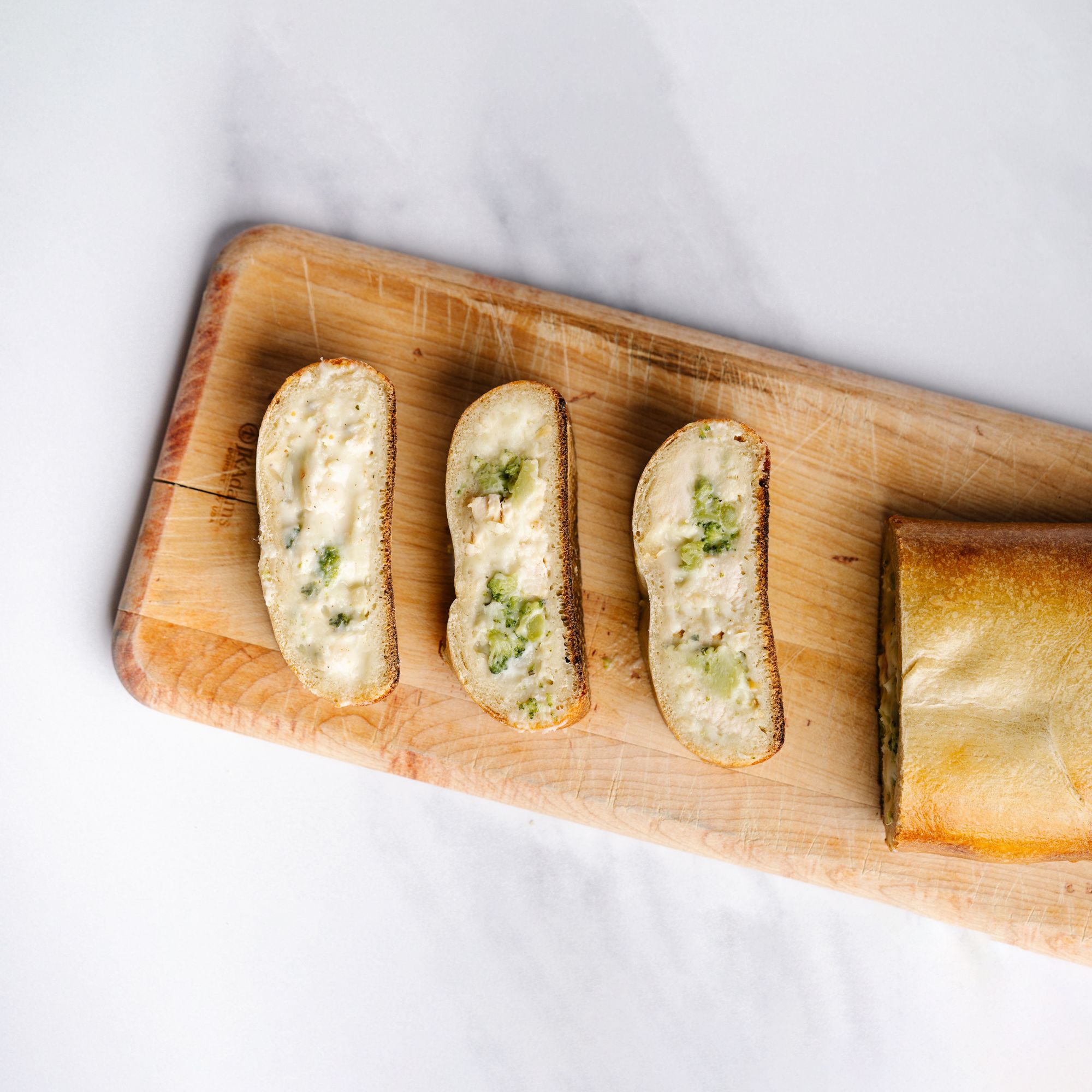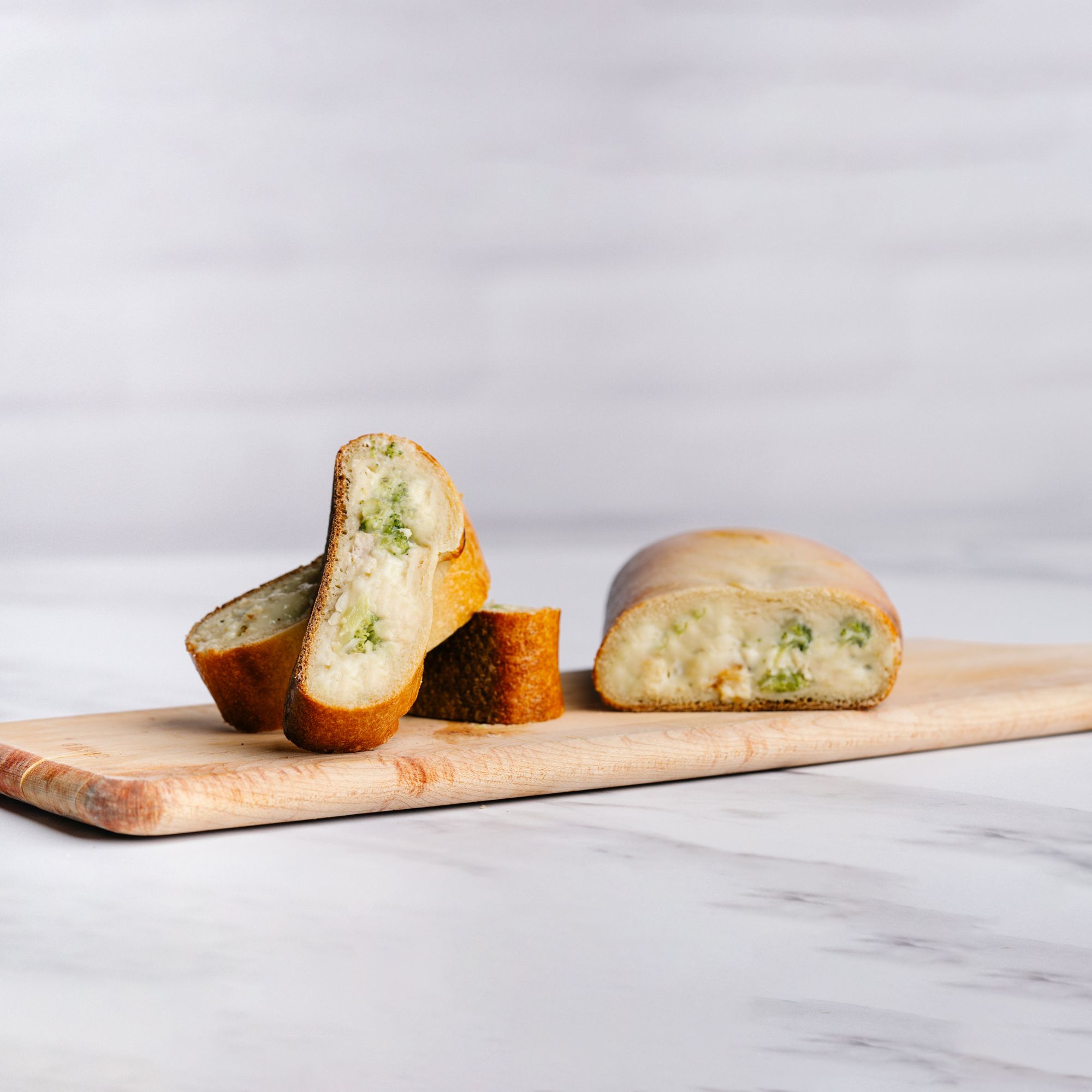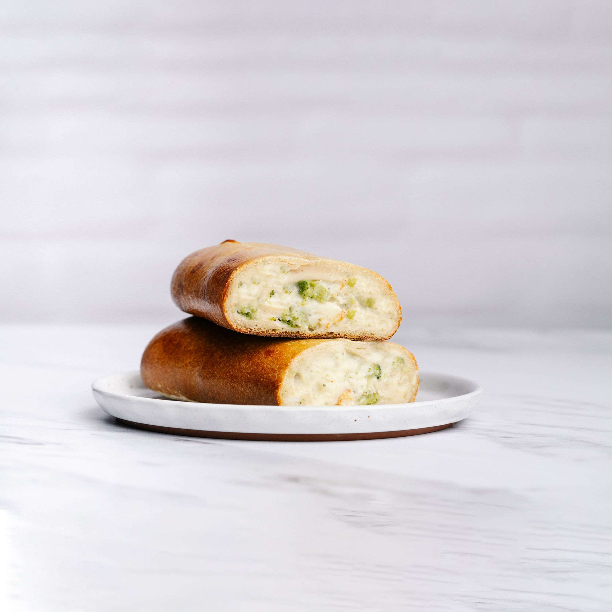 Ingredients: Dough: Enriched Wheat Flour ([Wheat Flour, Niacin, Reduced Iron, Thiamine Mononitrate, Riboflavin, Folic Acid], Malted Barley Flour), Water, Sugar, Canola/olive Oil, Salt, Yeast (Baker's Yeast, Sorbitan Monostearate, Ascorbic Acid), Dough Conditioner (Enriched Wheat Flour [Niacin, Reduced Iron, Thiamine Mononitrate, Riboflavin, Folic Acid], Enzymes), Yeast, Dough Conditioner (Calcium Sulfate, Enzymes [Contains Wheat], Corn Starch, Sodium Bicarbonate, Dicalcium Phosphate, Microcrystalline Cellulose, Monocalcium Phosphate, Modified Starch, Calcium Stearate). Filling: Fully Cooked Grilled Chicken Breast Strips (Chicken Breast With Rib Meat, Water, Seasoning [Salt, Sugar, Spice Extractives, Dextrose], Sodium Phosphates), White Cream Base: (Milk, Heavy Cream, Food Starch-modified, Grated Parmesan Cheese {Parmesan Cheese [Part-skim Cow's Milk, Cheese Cultures, Salt, Enzymes], Parmesan Style Cheese [Corn Starch, Water, Palm Oil, Cellulose, Salt, Natural Flavor, Caseinate, Sorbic Acid {Preservative}, Annatto {For Color}], Natamycin [A Natural Mold Inhibitor]}, Grated Romano Cheese {Milk, Cheese Culture, Salt, Enzymes}, Chicken Base (Roasted Chicken, Salt, Yeast Extract, Natural Flavors, Turmeric), Parmesan Paste (Enzyme Modifed Parmesan Cheese [Milk, Starter Culture, Salt, Enzymes], Enzyme Modifed Butter, Water), Salt, Garlic Powder, Onion Powder, Black Pepper), Broccoli, Reduced Fat Mozzarella Cheese (Part Skim Milk, Nonfat Milk, Modified Food Starch, Cultures, Salt, Vitamin A Palmitate, Enzymes), Low Moisture Mozzarella Cheese (Milk, Cheese Cultures, Salt, Enzymes), Grated Parmesan Cheese (Parmesan Cheese [Part-skim Cow's Milk, Cheese Cultures, Salt, Enzymes], Parmesan Style Cheese [Corn Starch, Water, Palm Oil, Cellulose, Salt, Natural Flavor, Caseinate, Sorbic Acid {Preservative}, Annatto {For Color}], Natamycin [A Natural Mold Inhibitor]), Fontina Cheese (Milk, Cheese Cultures, Salt, Enzymes), Breadcrumbs (Enriched Flour [Wheat Flour, Malted Barley Flour, Niacin, Reduced Iron, Thiamin Mononitrate, Riboflavin, Folic Acid], Sugar, Salt, Yeast, Ascorbic Acid [Vitamin C, Added As Dough Conditioner]), Roasted Garlic (Galic, Canola/olive Oil), Parsley, Salt, Rosemary.