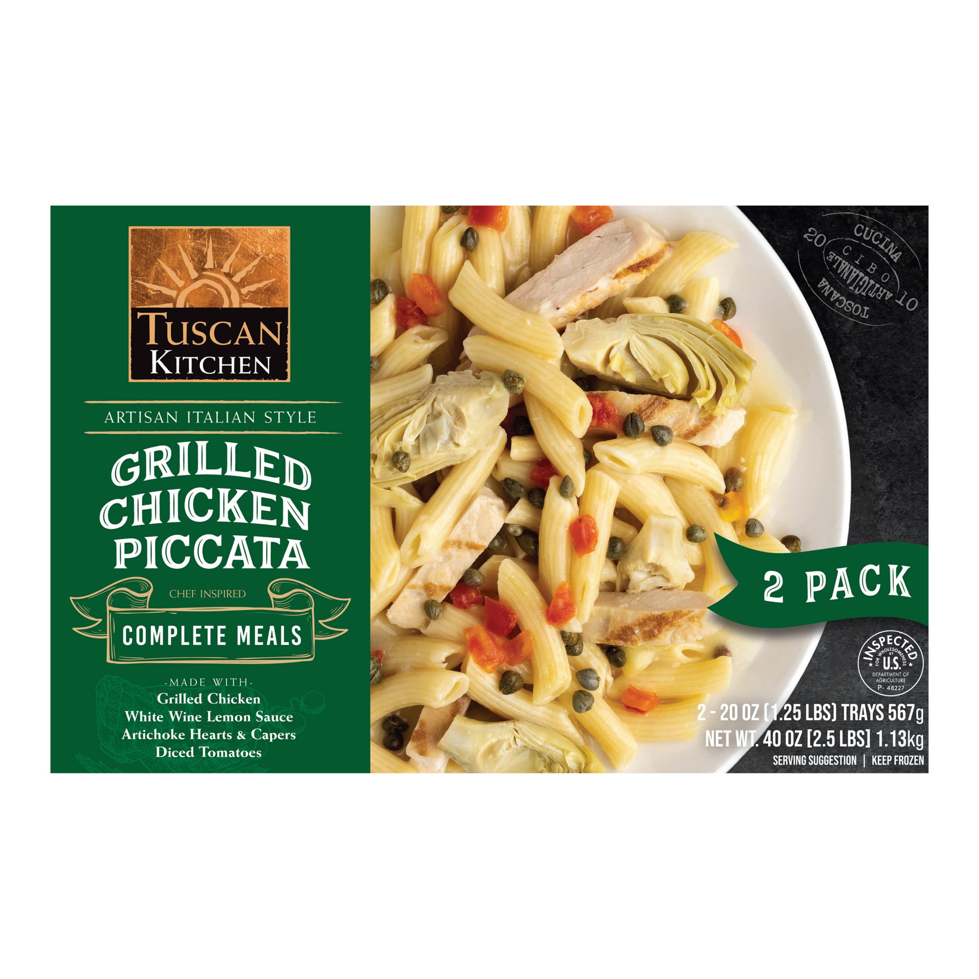 Tuscan Kitchen Grilled Chicken Piccata is a chef inspired complete meal made with grilled chicken in a white wine lemon sauce with artisan pasta. The robust sauce is made with white wine, lemon, artichoke hearts, capers, shallots and garlic. This two-pack is great to have on hand for a dinner or family gathering.