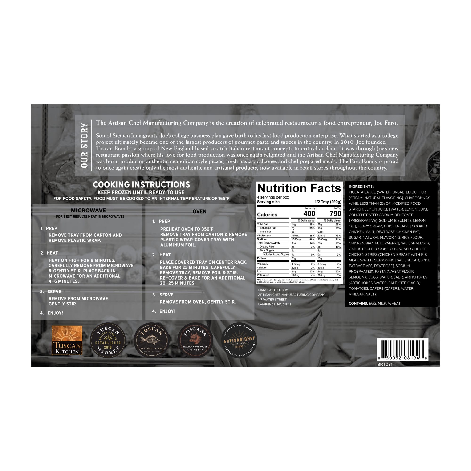 Ingredients: Piccata Sauce (Water, Unsalted Butter [Cream, Natural Flavoring], Chardonnay Wine, Less Than 2% Of: Modified Food Starch, Lemon Juice [Water, Lemon Juice Concentrated, Sodium Benzoate {Preservative}, Sodium Bisulfite, Lemon Oil], Heavy Cream, Chicken Base [Cooked Chicken, Salt, Dextrose, Chicken Fat, Sugar, Natural Flavoring, Rice Flour, Chicken Broth, Turmeric], Salt, Shallots, Garlic). Fully Cooked Seasoned Grilled Chicken Strips (Chicken Breast With Rib Meat, Water, Seasoning [Salt, Sugar, Spice Extractives, Dextrose],sodium Phosphates). Pasta (Wheat Flour, Semolina, Eggs, Water, Salt). Artichokes (Artichokes, Water, Salt, Citric Acid). Tomatoes. Capers (Capers, Water, Vinegar, Salt). Contains: Egg, Milk, Wheat.