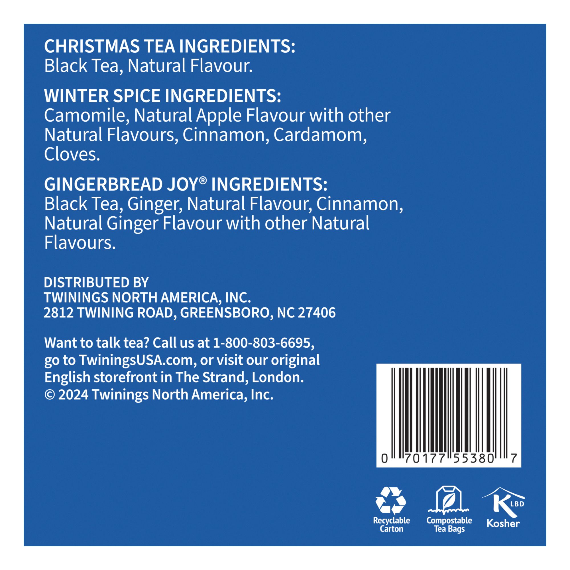 Ingredients: Christmas Tea Ingredients: Black Tea, Natural Flavor. Winter Spice Ingredients: Chamomile, Natural Apple Flavor with other Natural Flavors, Cinnamon, Cardamom, Cloves. Gingerbread Joy Ingredients: Black Tea, Ginger, Natural Flavor, Cinnamon, Natural Ginger Flavor with other Natural Flavors.