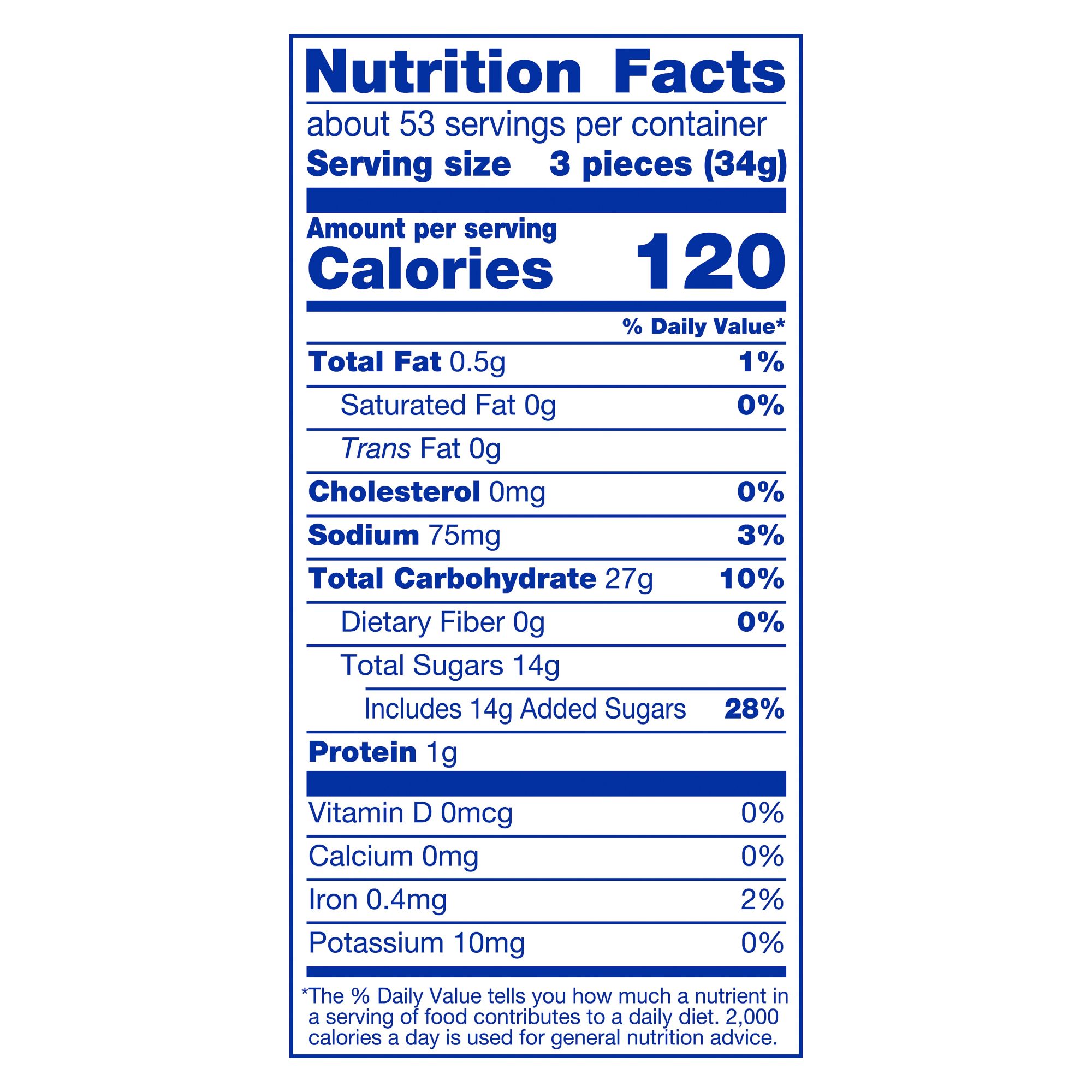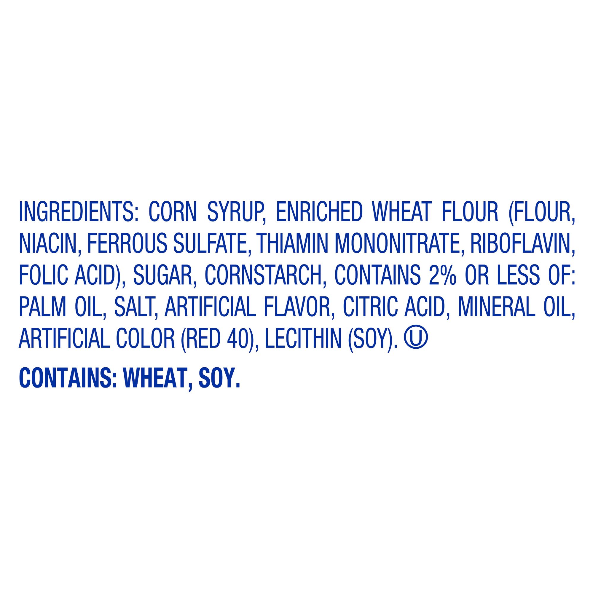 Ingredients: Corn Syrup, Enriched Wheat Flour (Flour, Niacin, Ferrous Sulfate, Thiamin Mononitrate, Riboflavin, Folic Acid), Sugar, Cornstarch, Contains 2% Or Less Of: Palm Oil, Salt, Artificial Flavor, Citric Acid, Mineral Oil, Artificial Color (Red 40), Lecithin (Soy).